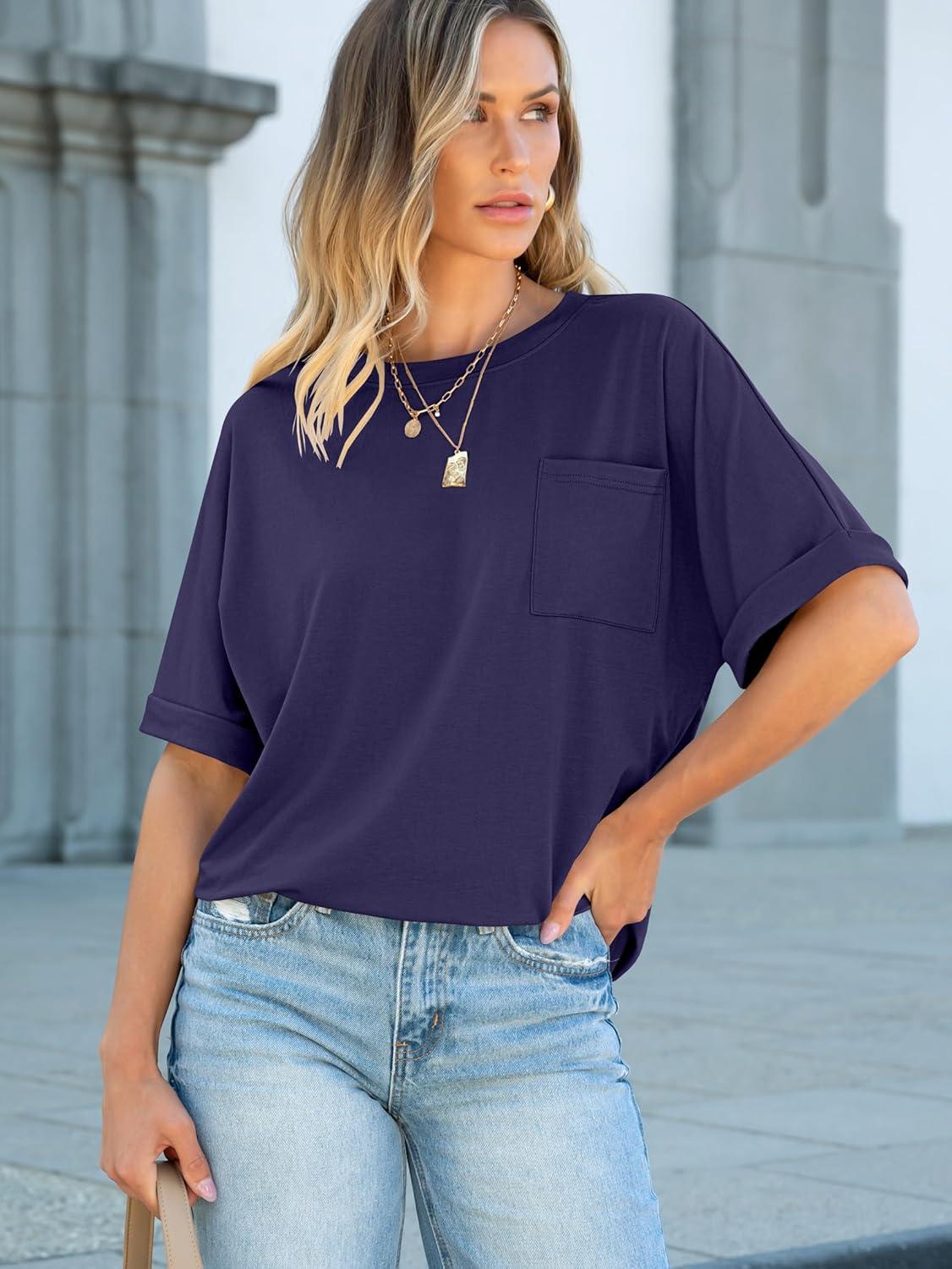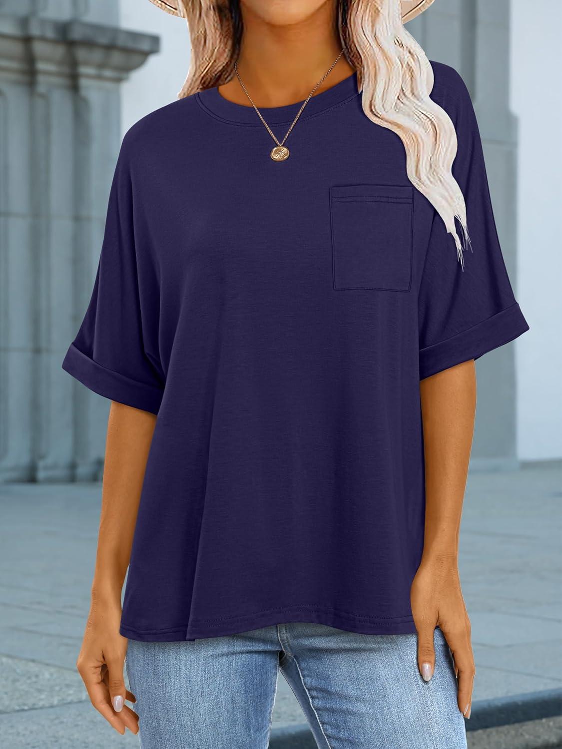 ANRABESS Women Oversized T Shirts Short Sleeve Summer Casual Loose Top Basic Tee with Pocket(Navy Blue)