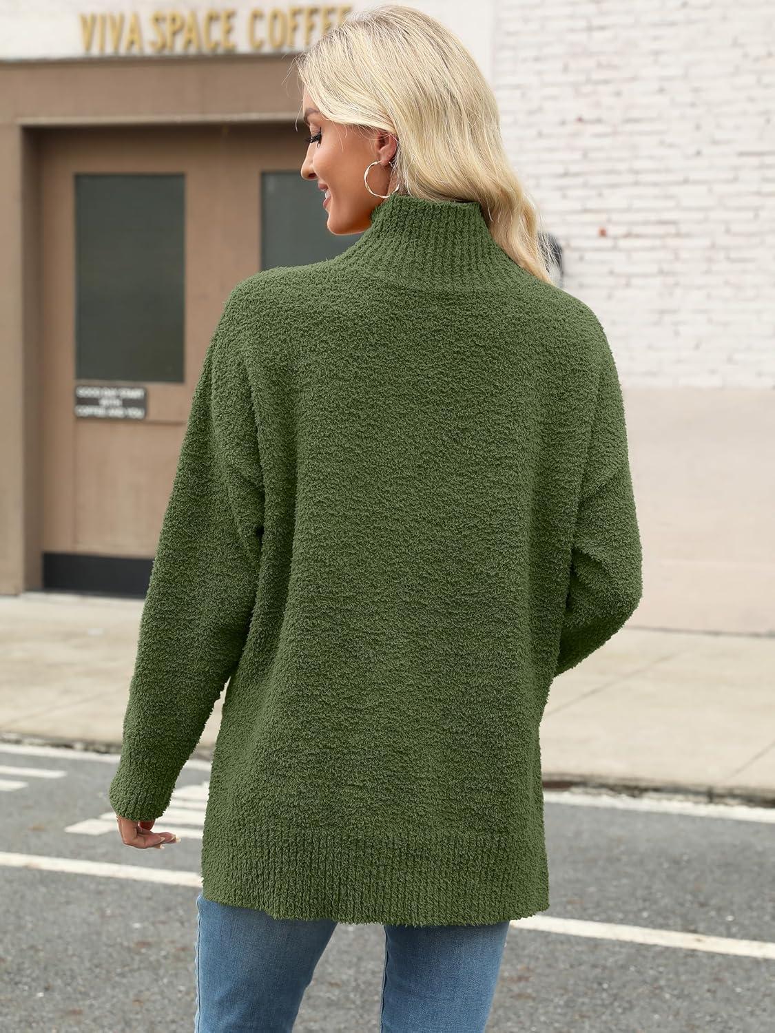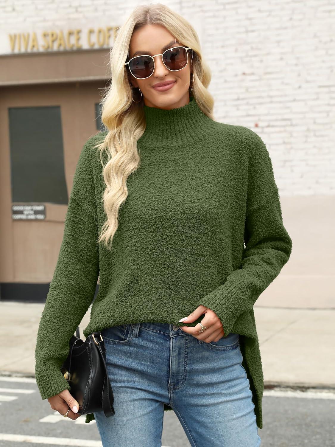 ANRABESS Women Oversized Turtleneck Long Sleeve Fuzzy Knit Slit Side Chunky Warm Pullover Sweaters 2025(Olive Green)