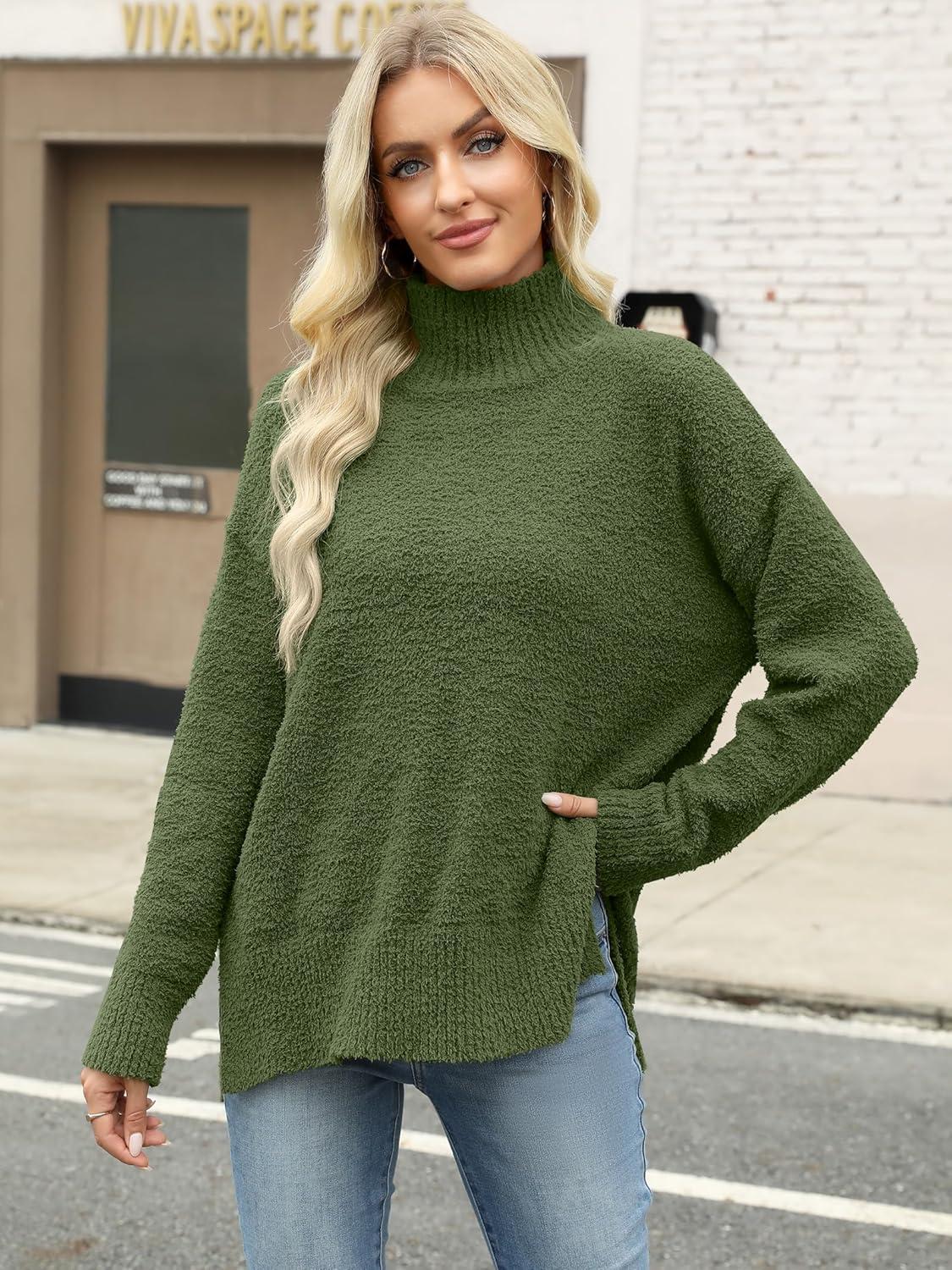 imageANRABESS Women Oversized Turtleneck Long Sleeve Fuzzy Knit Slit Side Chunky Warm Pullover Sweaters 2025Olive Green