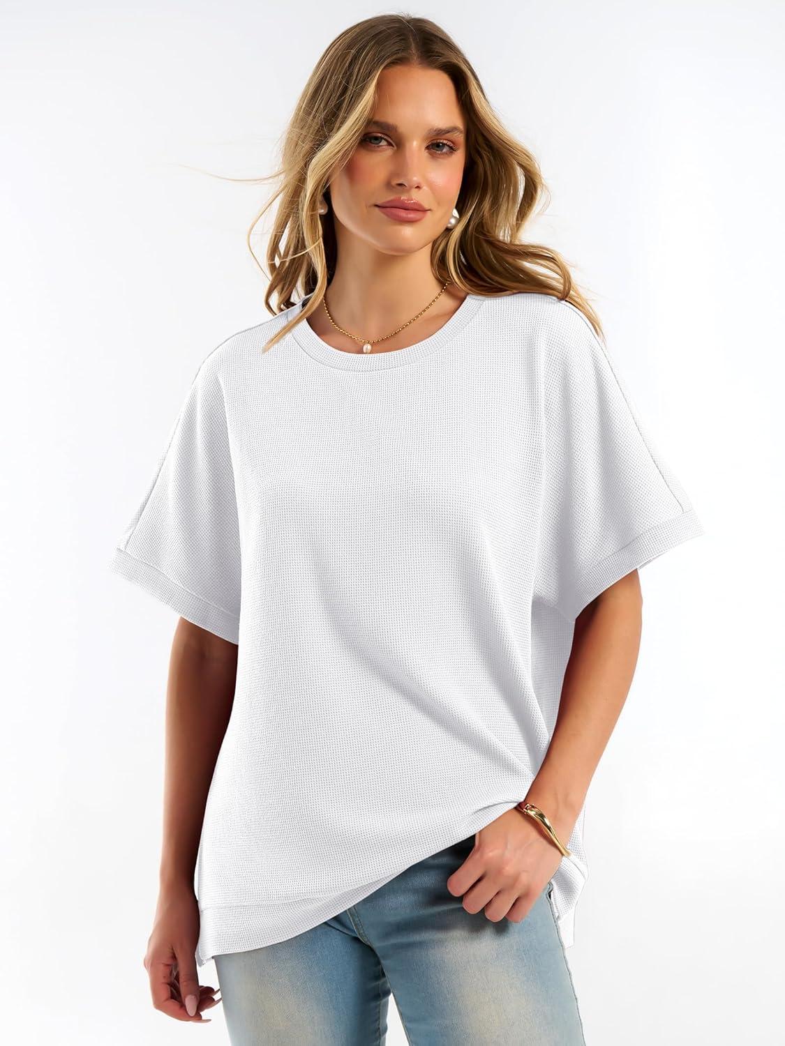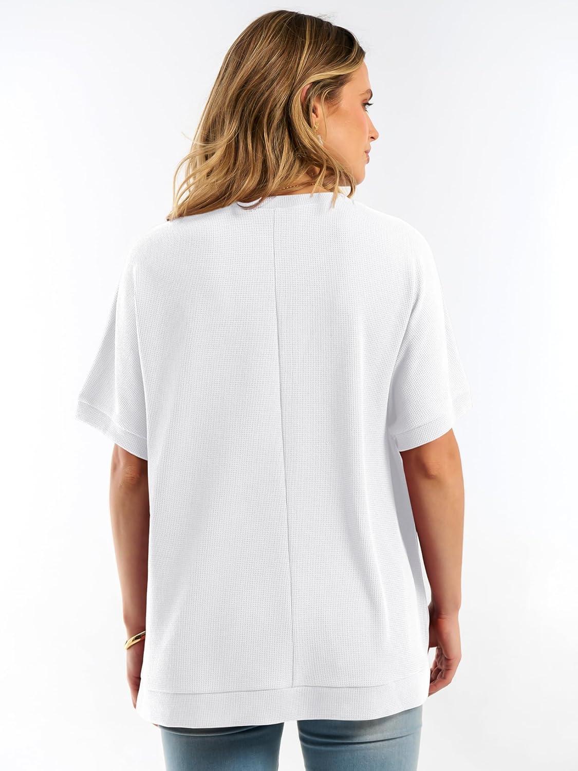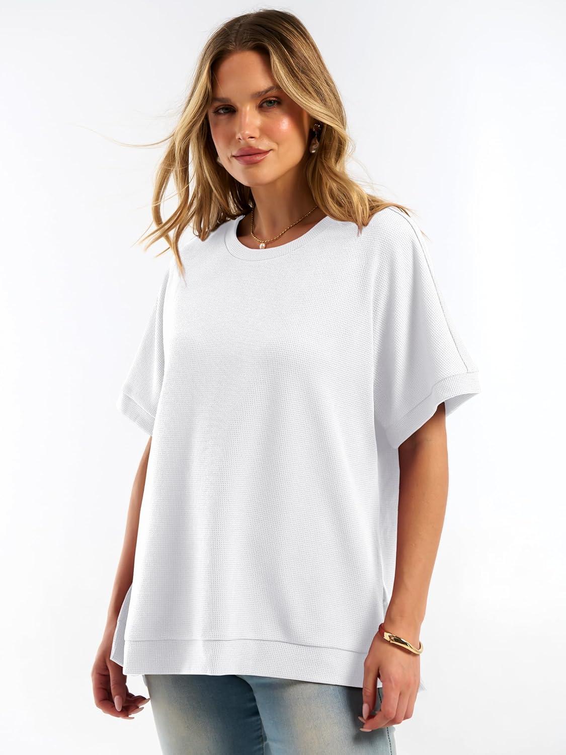 ANRABESS Women Oversized Waffle Knit T-Shirts Summer Casual Short Sleeve Tunic Tops Side Spilt Tee Shirts 2026 Trendy Clothes(White)