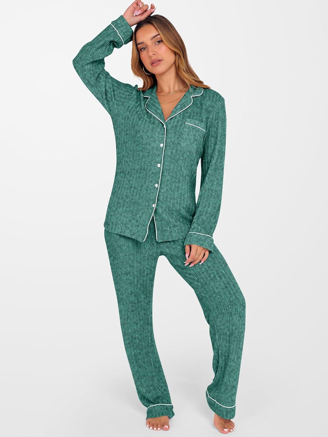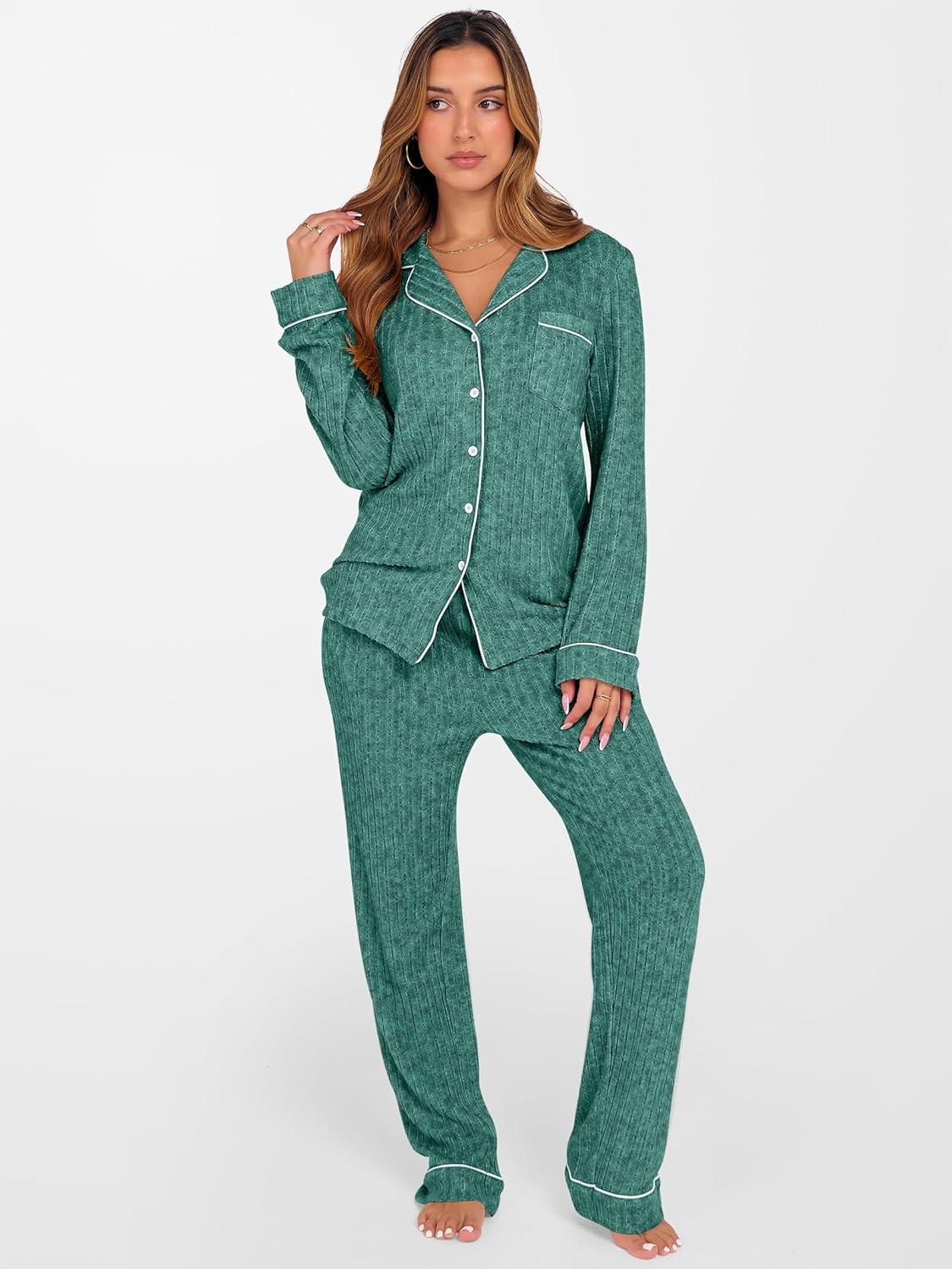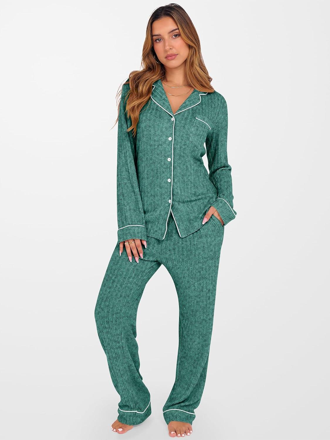ANRABESS Women Pajama Lounge Sets 2025 Fall 2 Piece Outfits Ribbed Long Sleeve Matching PJ Set Sleepwear Loungewear(Deep Green)