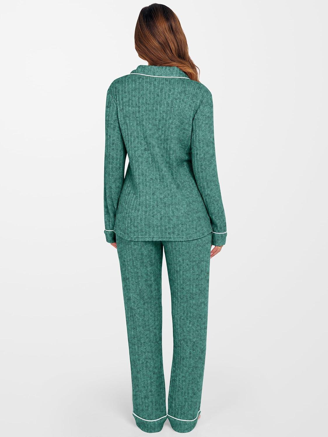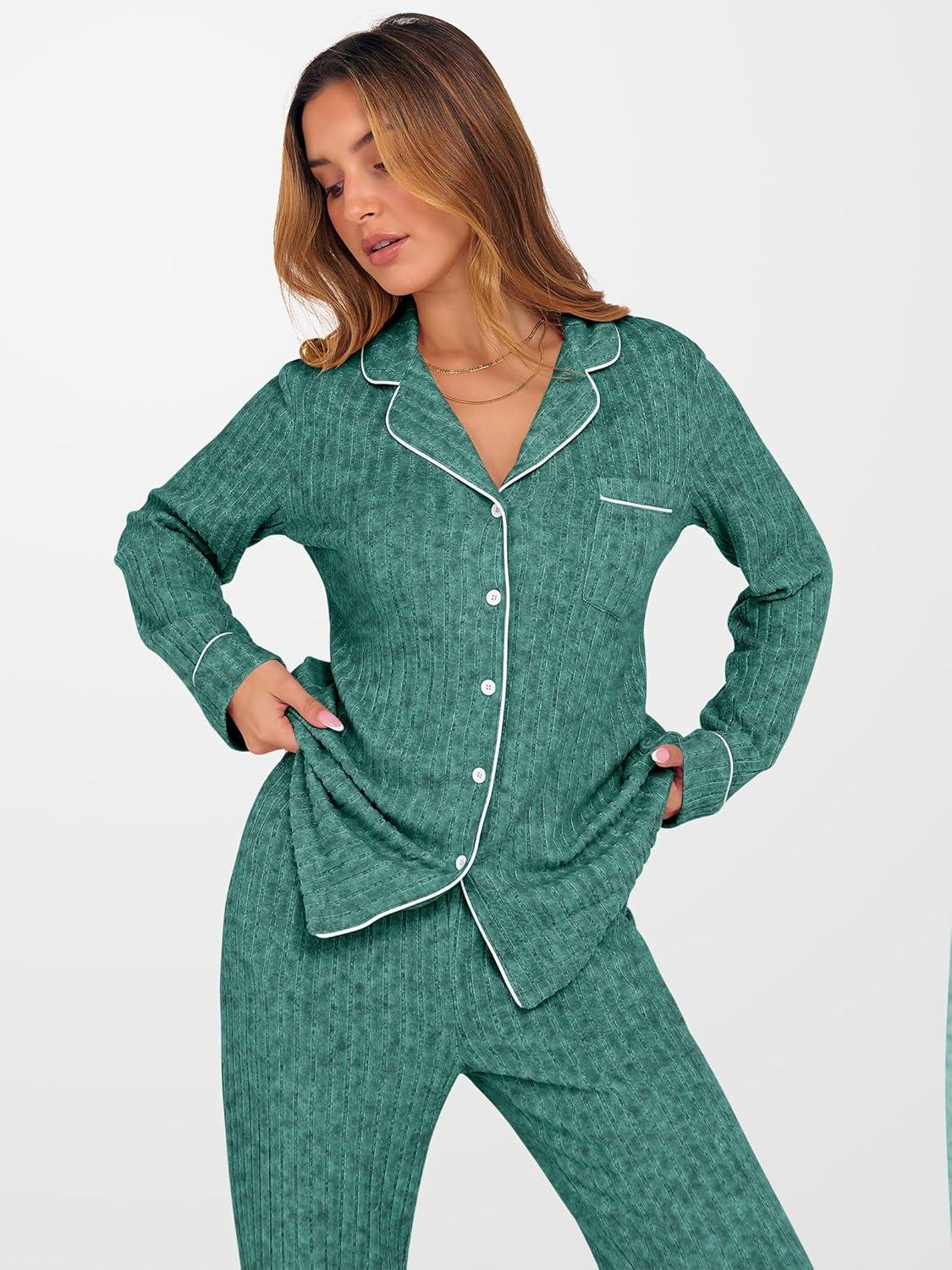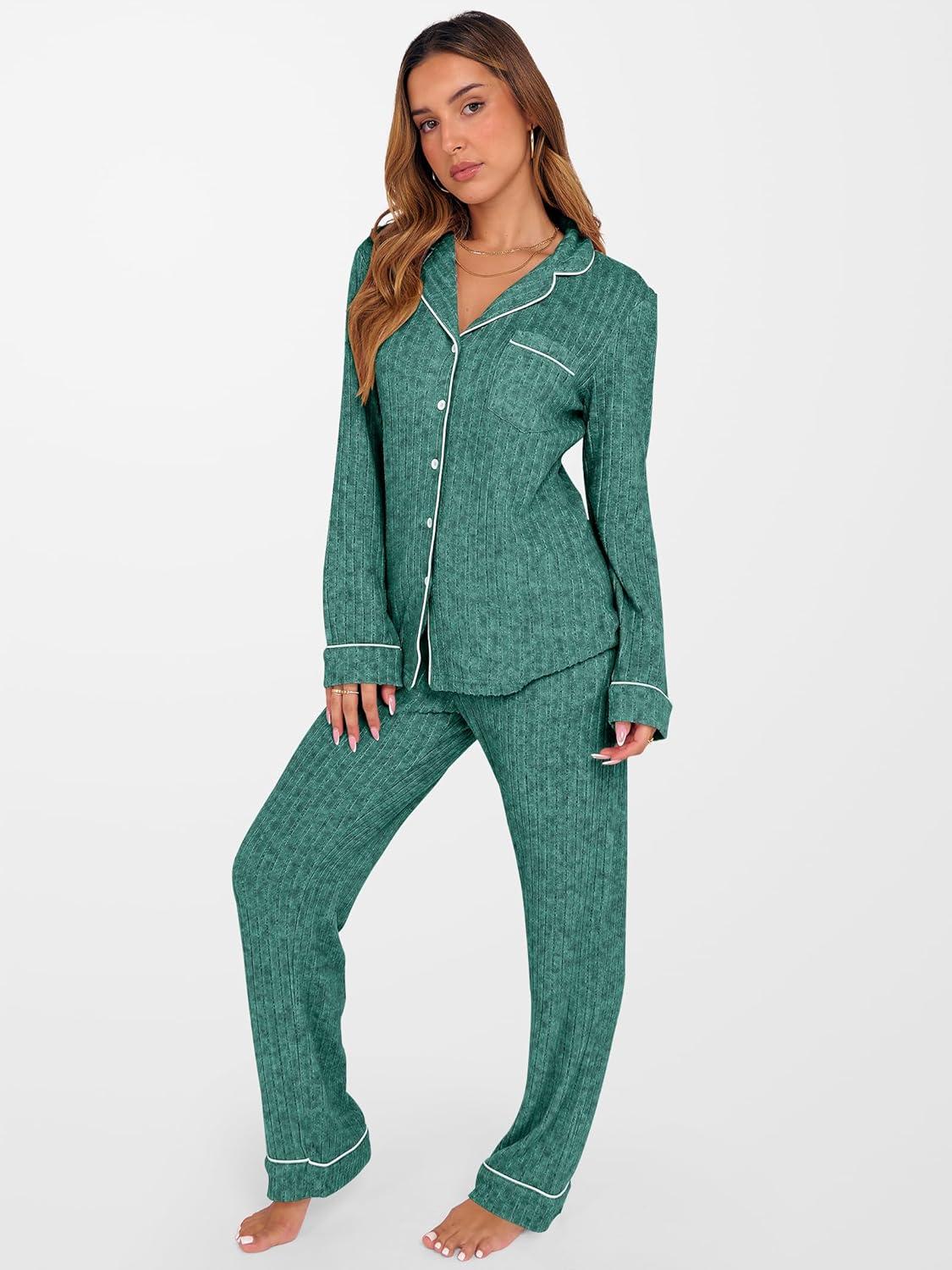 ANRABESS Women Pajama Lounge Sets 2025 Fall 2 Piece Outfits Ribbed Long Sleeve Matching PJ Set Sleepwear Loungewear(Deep Green)