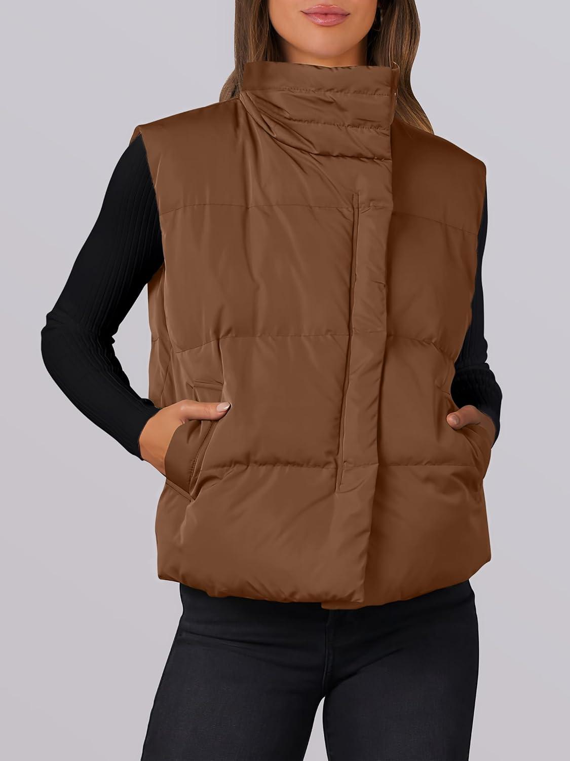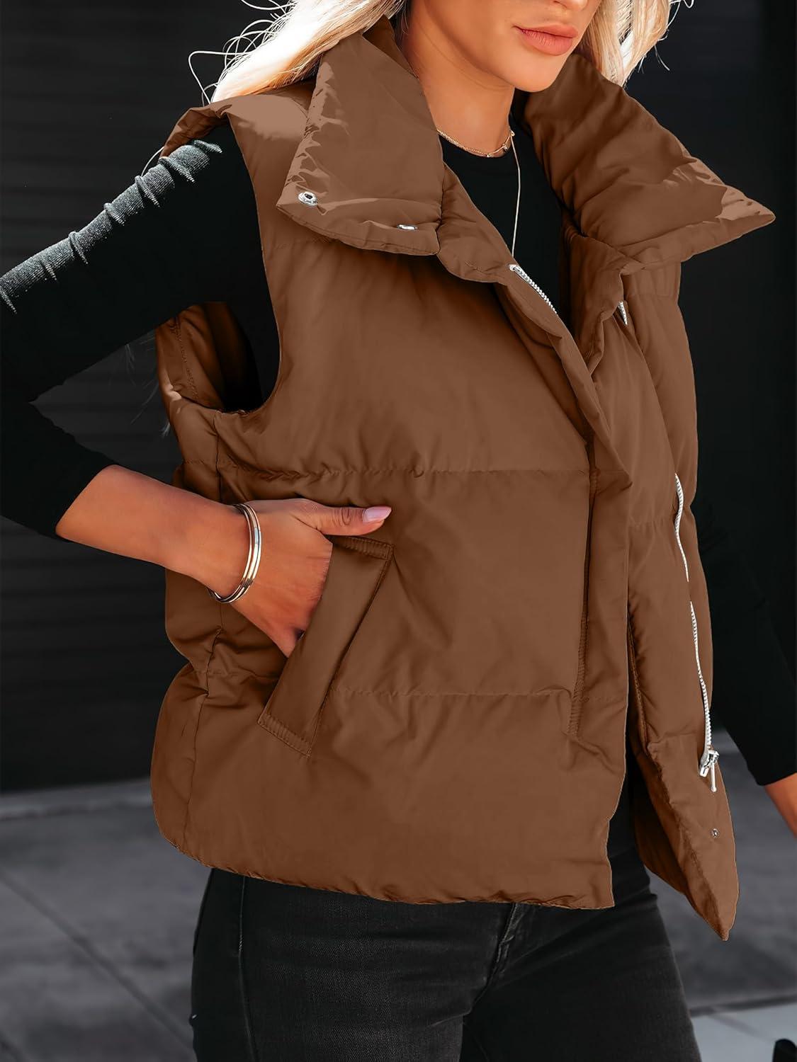 imageANRABESS Women Puffer Vest Sleeveless Zip Up Stand Collar Quilted Lightweight Jacket Winter Warm Puffer Padded Down OuterwearBrown