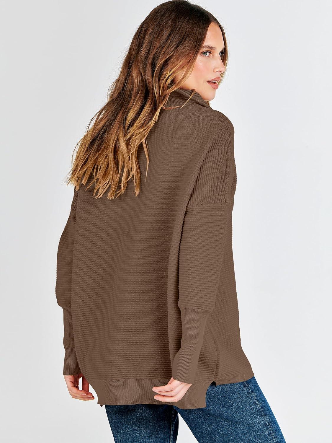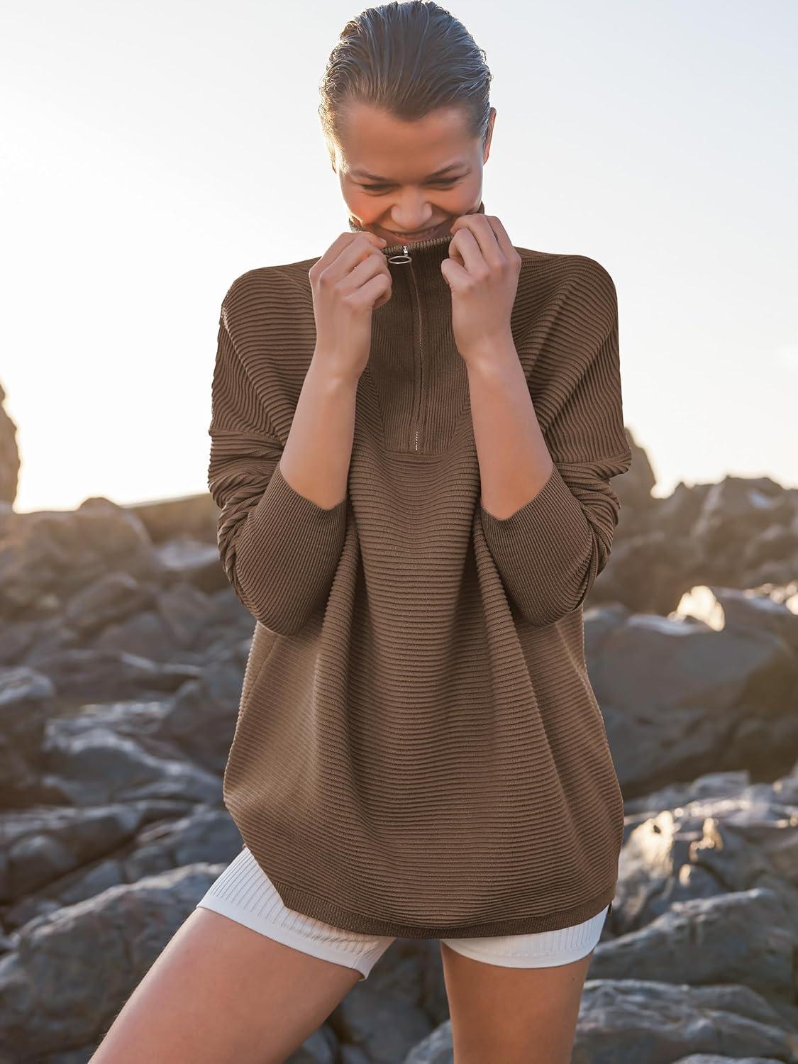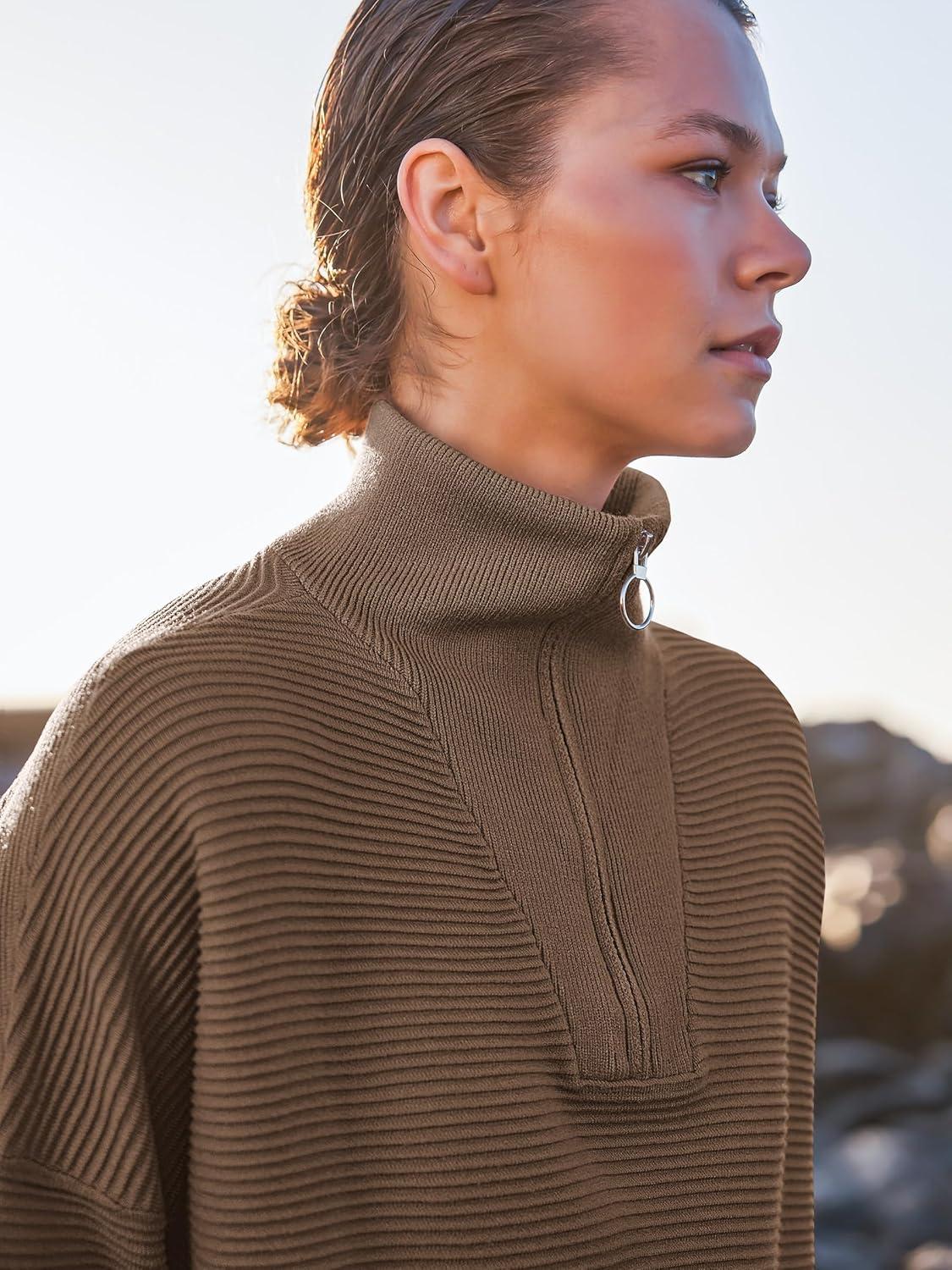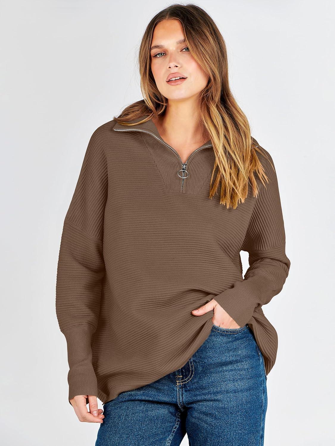 ANRABESS Women Quarter Zip Oversized Casual Loose Rib Knit Cozy Pullover Sweaters Top 2025 Fall Fashion Outfits Clothes(Almond)
