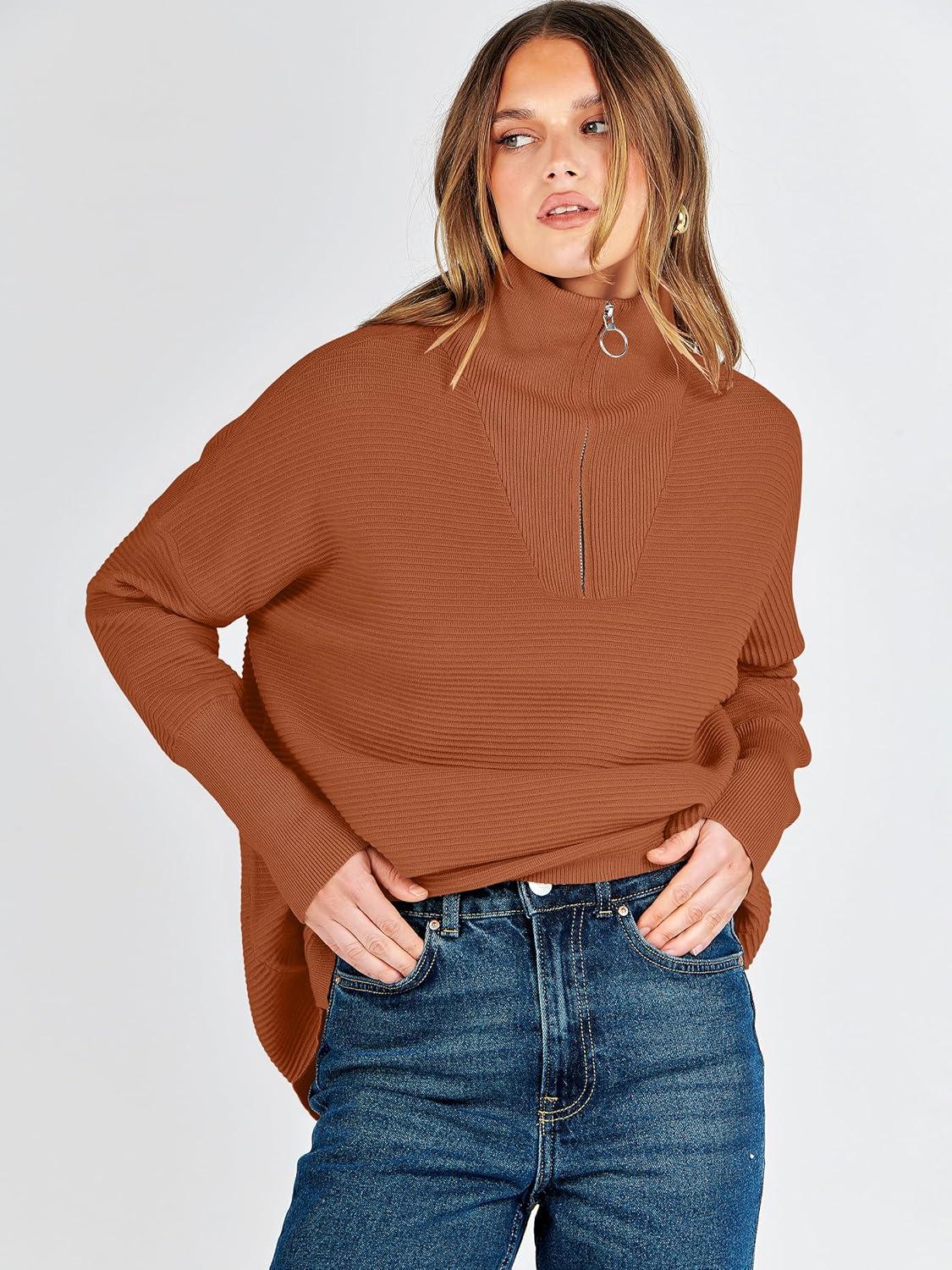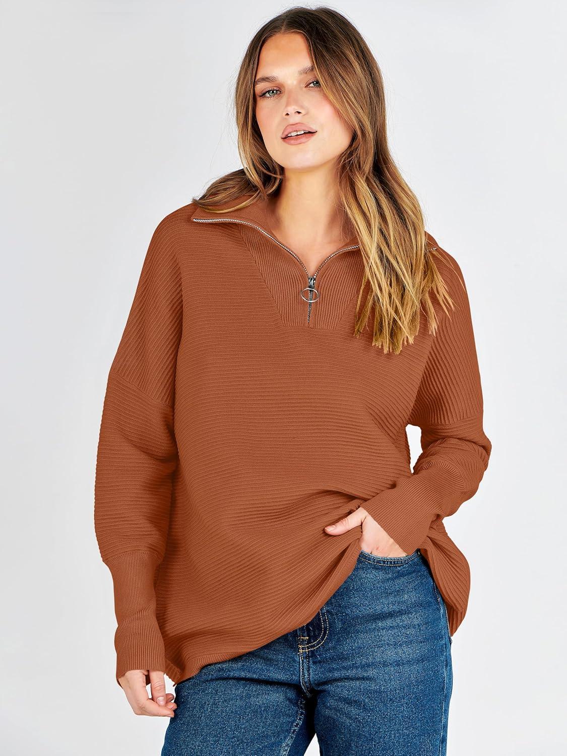ANRABESS Women Quarter Zip Oversized Casual Loose Rib Knit Cozy Pullover Sweaters Top 2025 Fall Fashion Outfits Clothes(Brown)