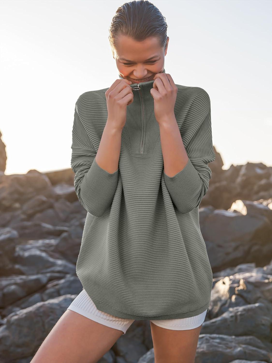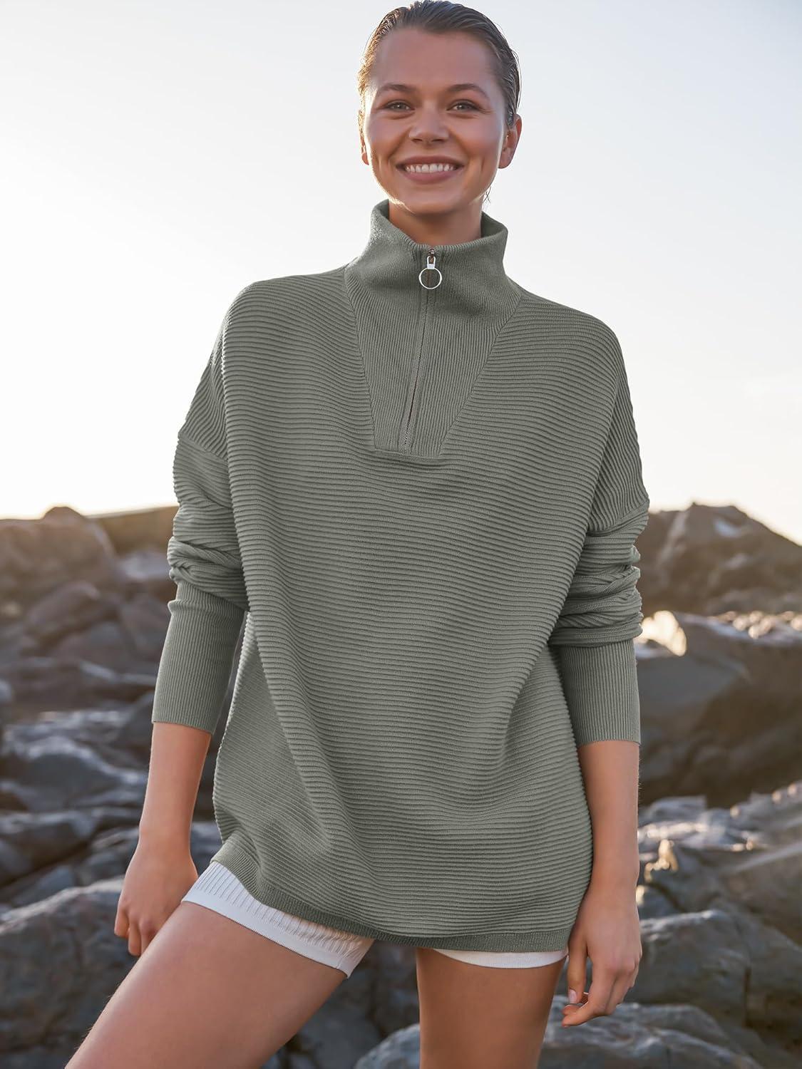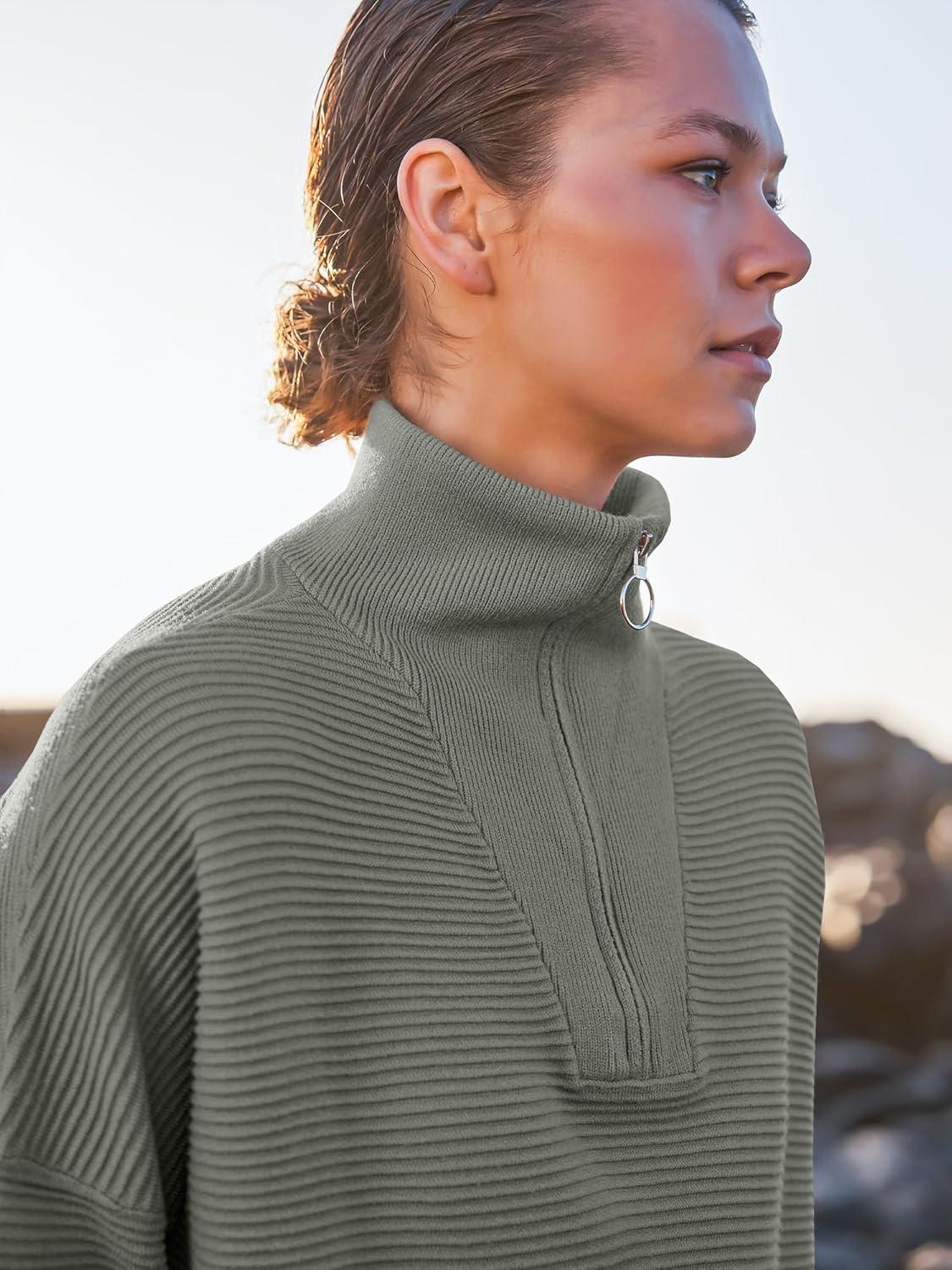 ANRABESS Women Quarter Zip Oversized Casual Loose Rib Knit Cozy Pullover Sweaters Top 2025 Fall Fashion Outfits Clothes(Grass Green)