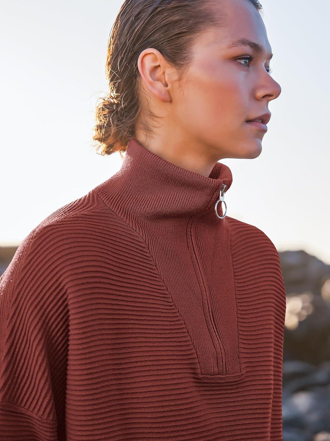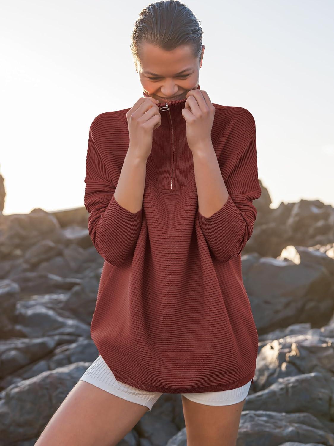 ANRABESS Women Quarter Zip Oversized Casual Loose Rib Knit Cozy Pullover Sweaters Top 2025 Fall Fashion Outfits Clothes(Rust)