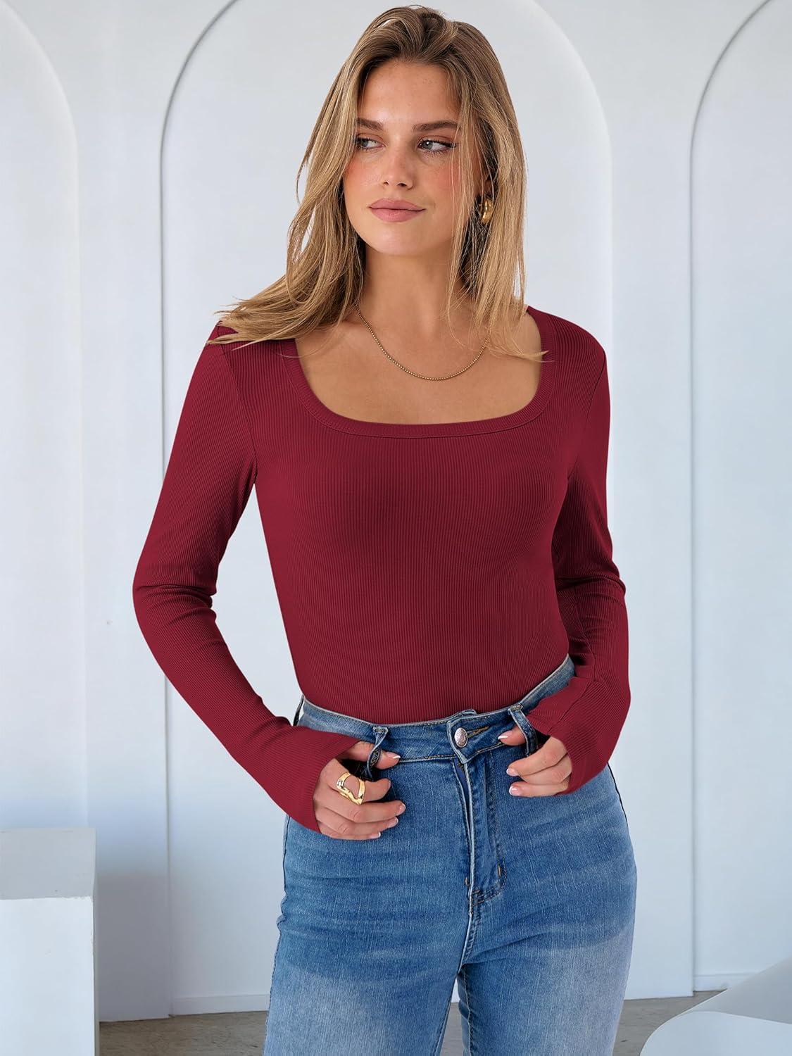 ANRABESS Women Scoop Neck Bodysuits Long Sleeve Tops 2025 Fall Slim Fit Ribbed Knit Sexy Soft Basic Shirts Fashion Outfits(Wine Red)