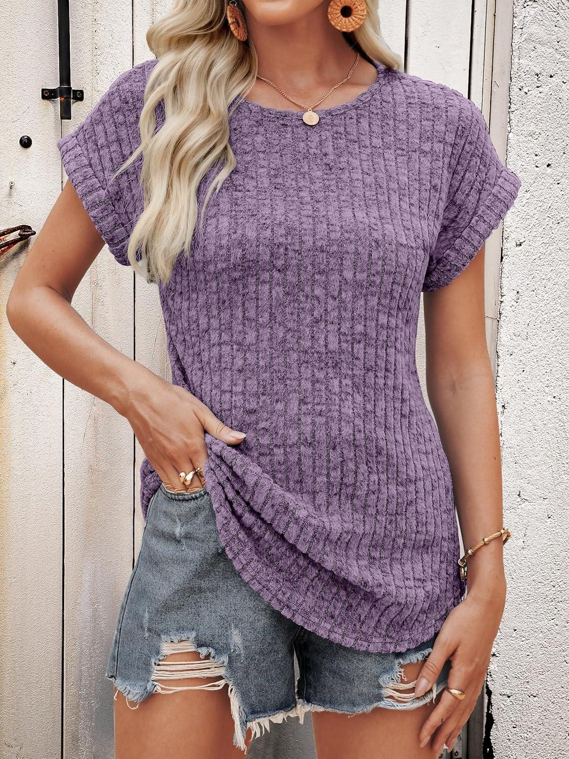 ANRABESS Women Shirts Summer Sweaters Regular Fit Short Sleeve Tunic Tops 2025 Dressy Casual Business Blouses(Purple)