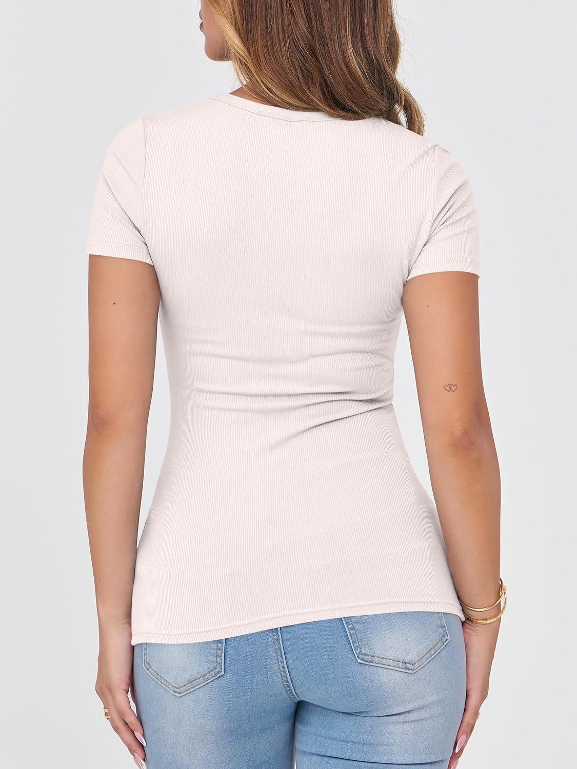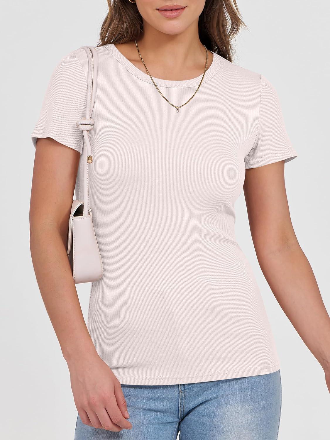 ANRABESS Women Short Sleeve Crewneck Ribbed Knit Slim Fitted Shirts Summer Tops Basic Tee Casual 2025 Fall Outfits Clothes(Apricot)
