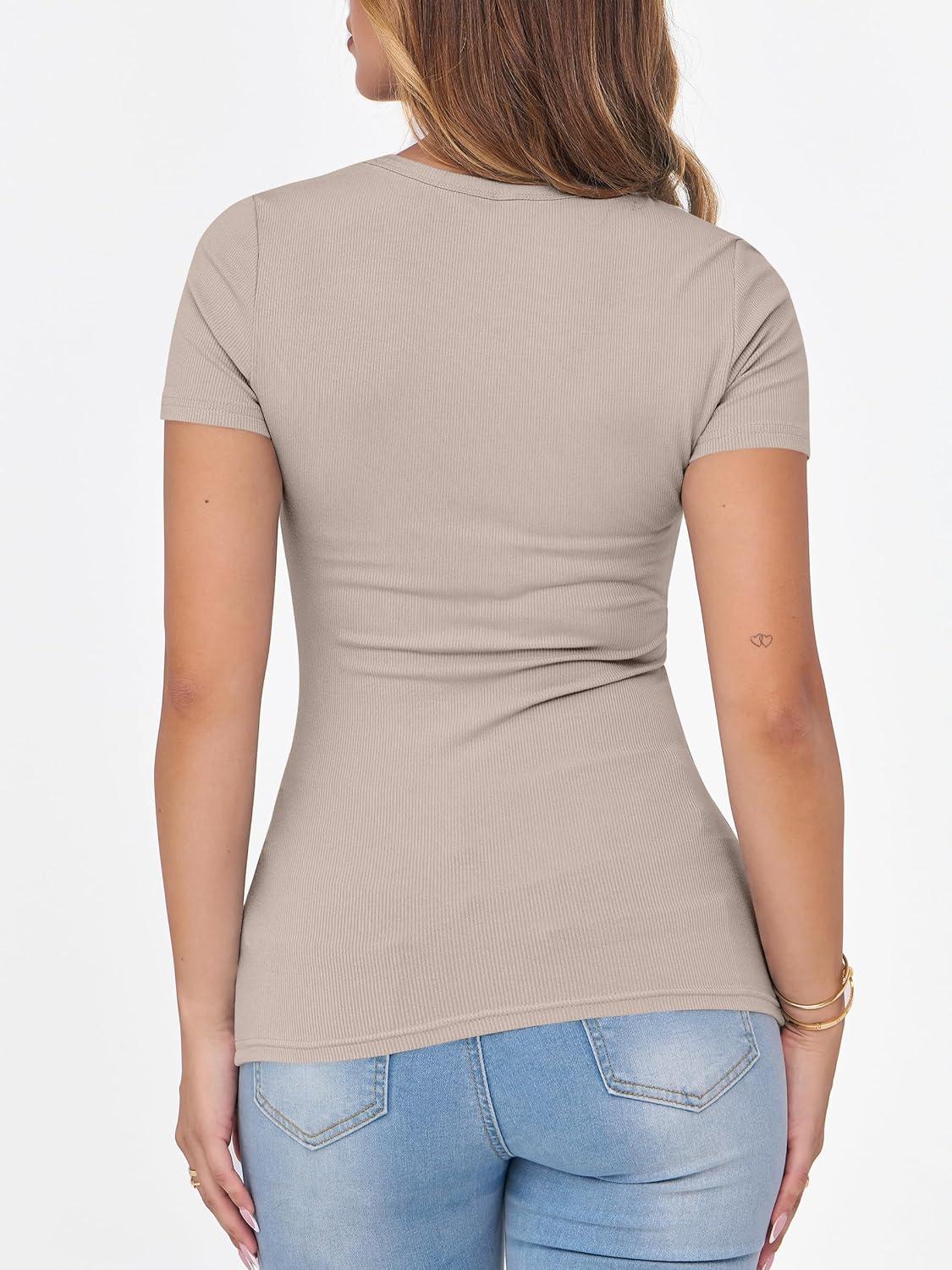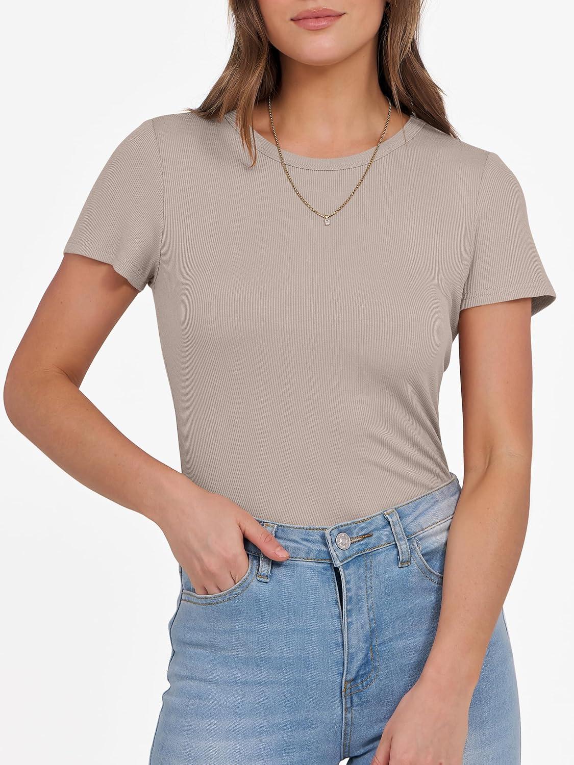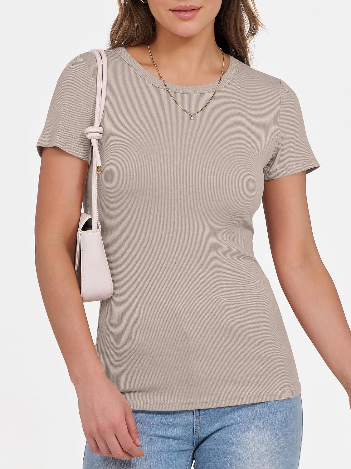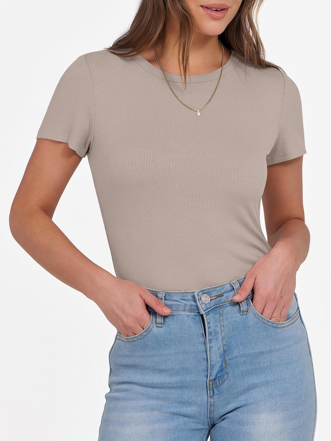 ANRABESS Women Short Sleeve Crewneck Ribbed Knit Slim Fitted Shirts Summer Tops Basic Tee Casual 2025 Fall Outfits Clothes(Light Khaki)
