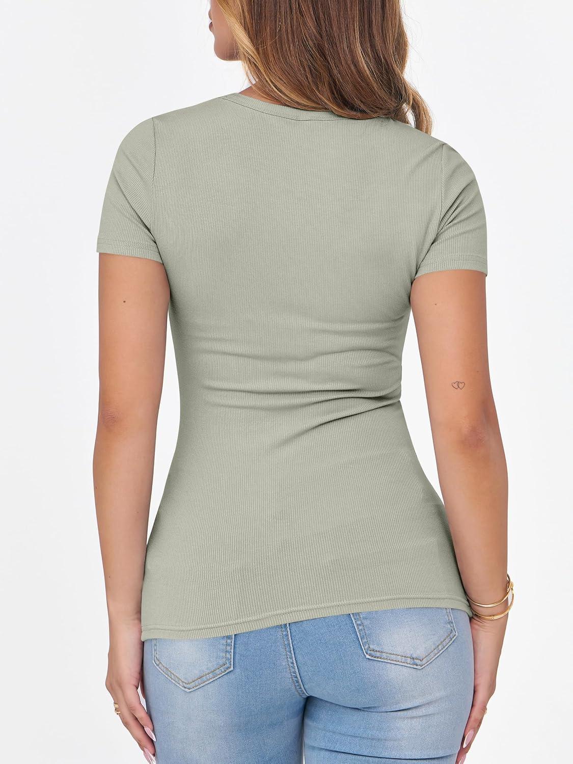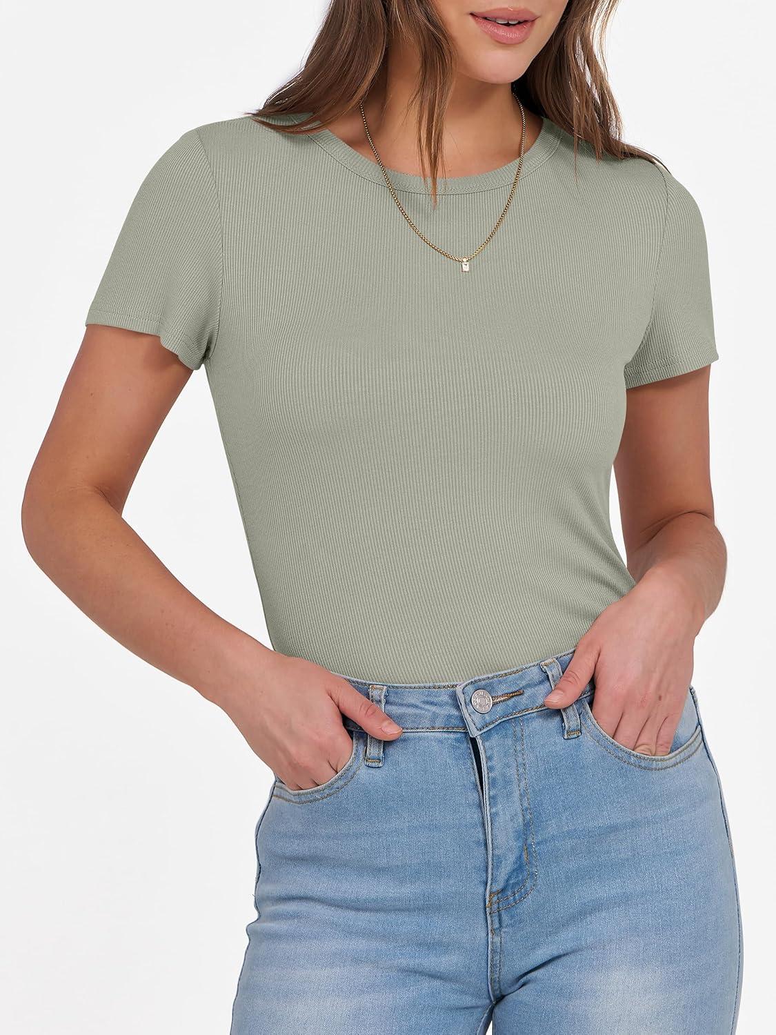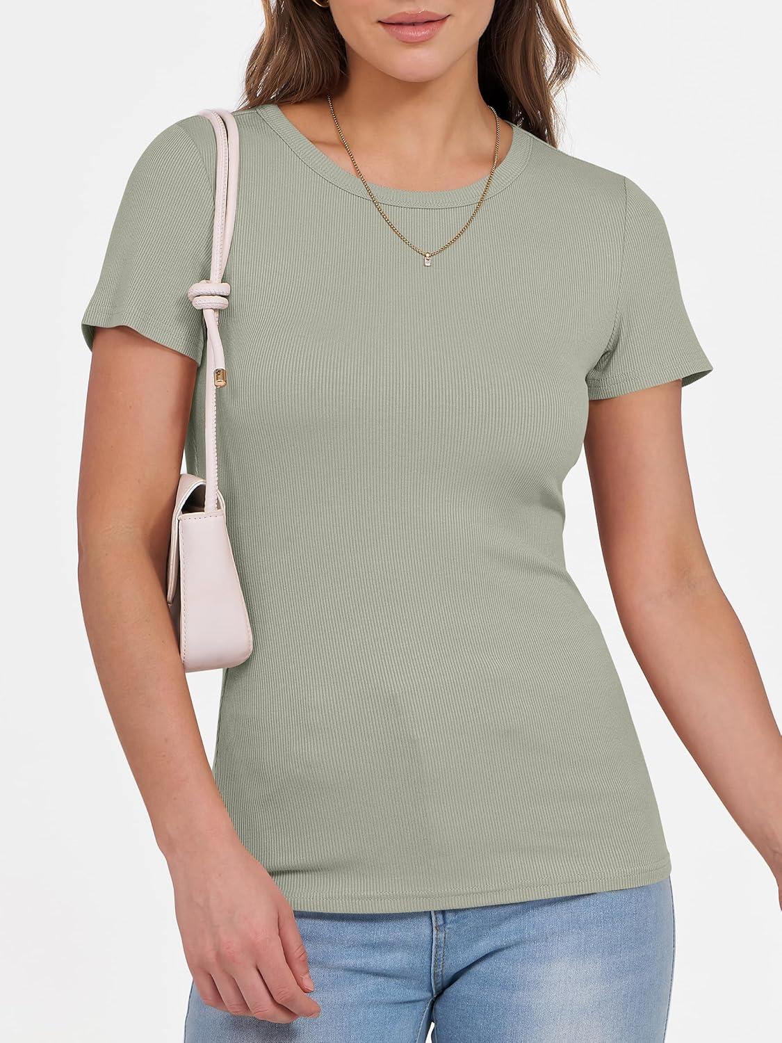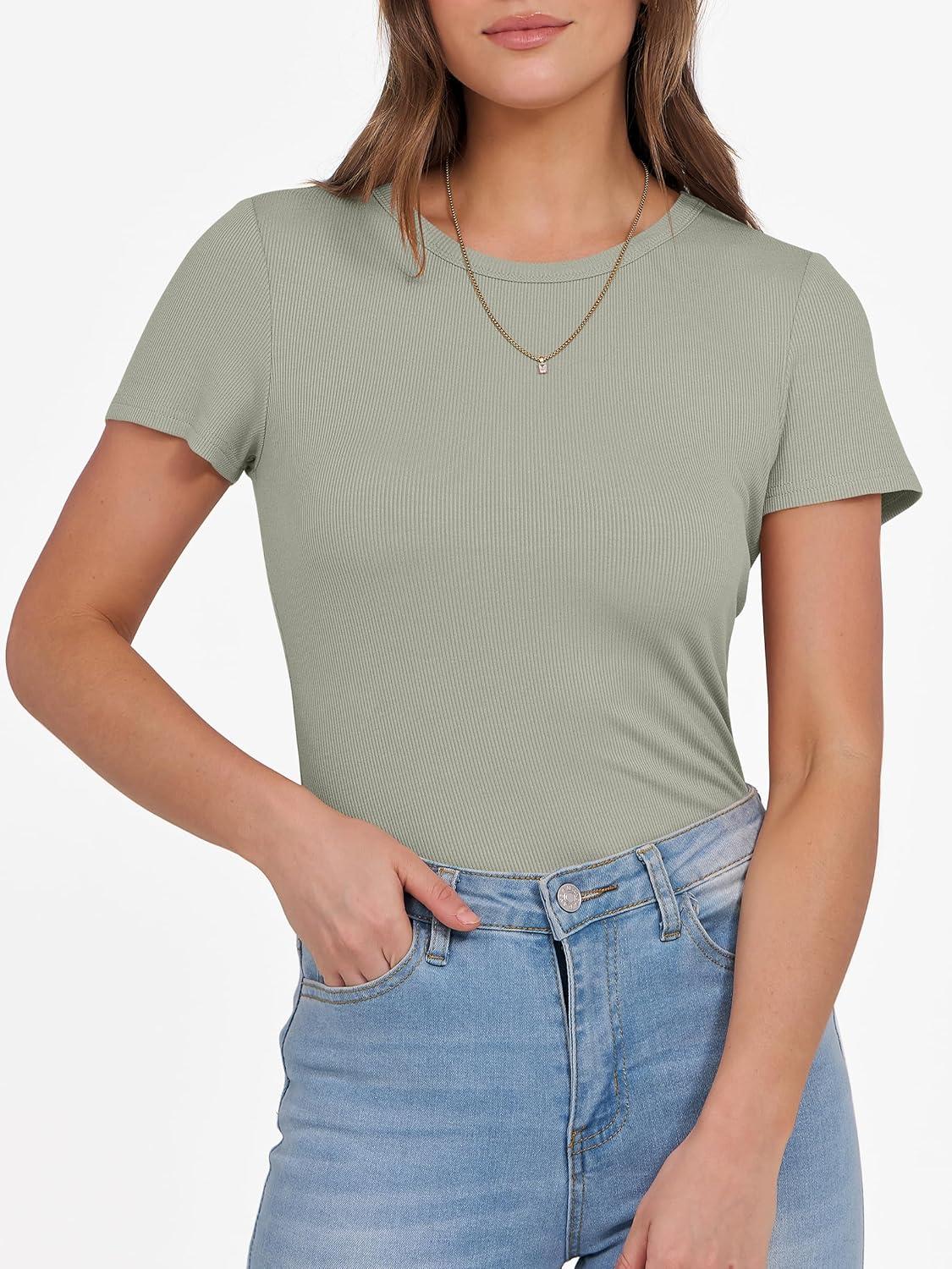 ANRABESS Women Short Sleeve Crewneck Ribbed Knit Slim Fitted Shirts Summer Tops Basic Tee Casual 2025 Fall Outfits Clothes(Sage Green)