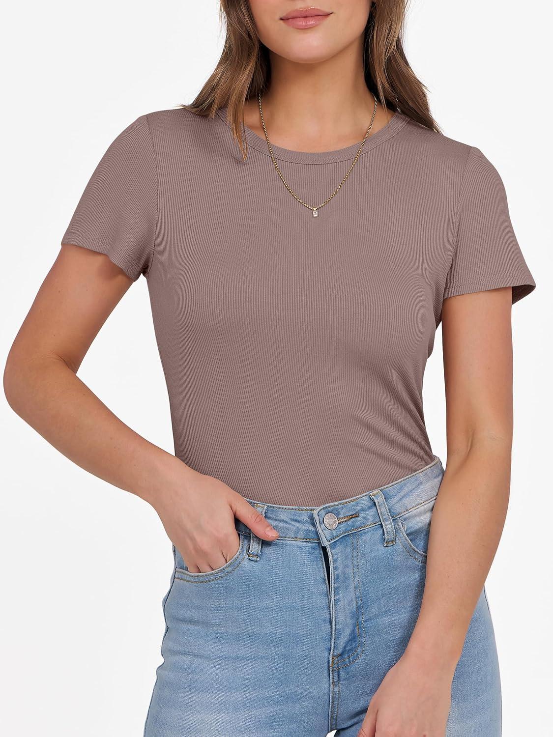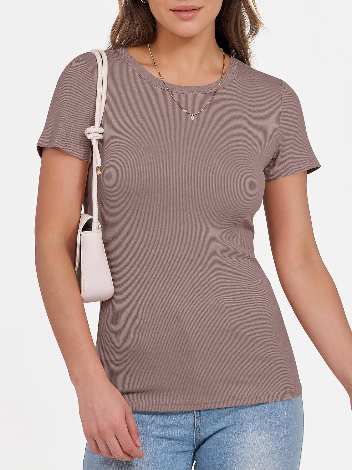 ANRABESS Women Short Sleeve Crewneck Ribbed Knit Slim Fitted Shirts Summer Tops Basic Tee Casual 2025 Fall Outfits Clothes(Taupe)