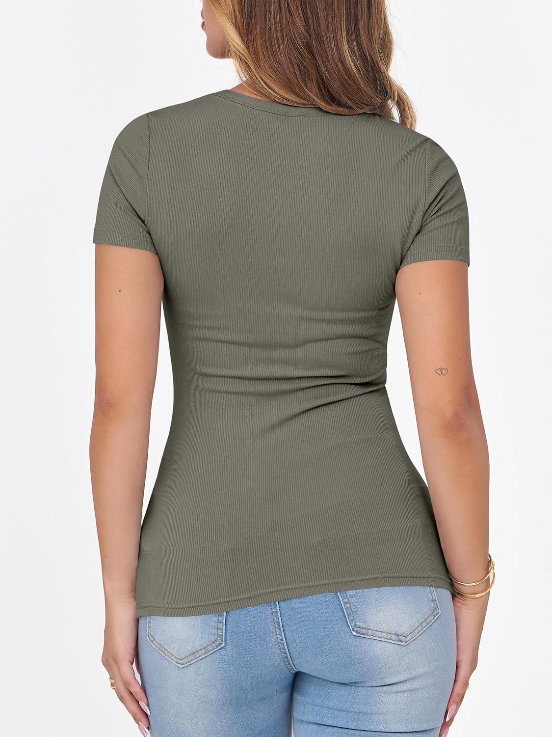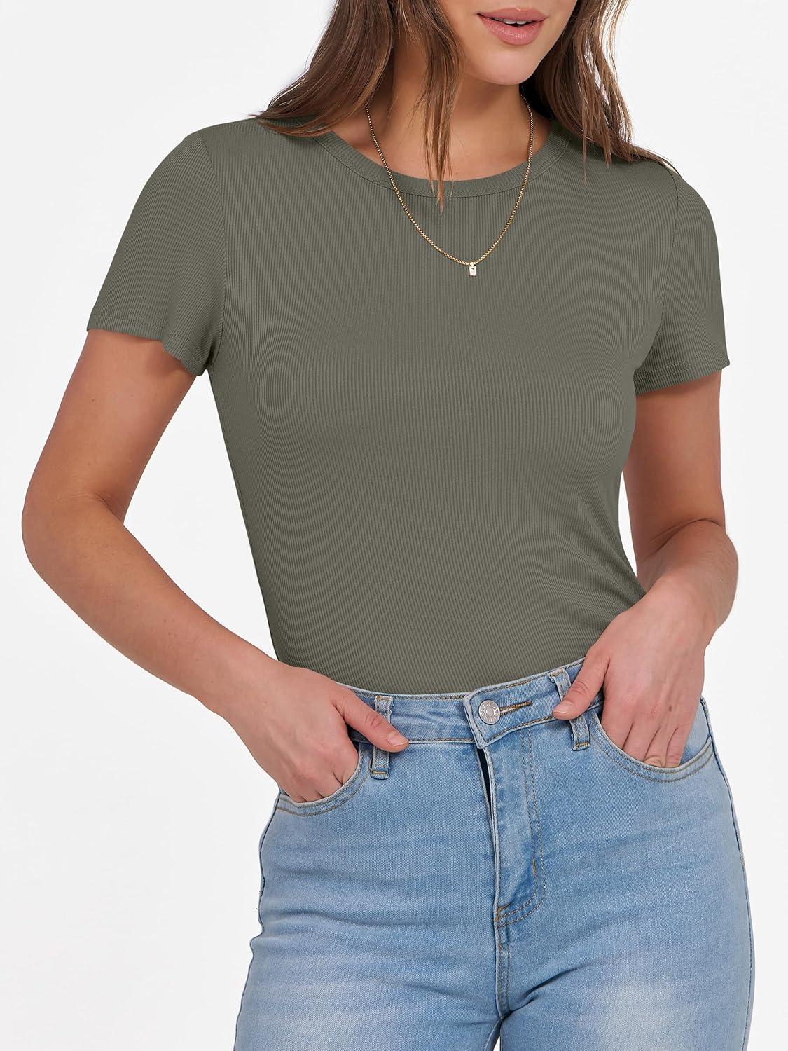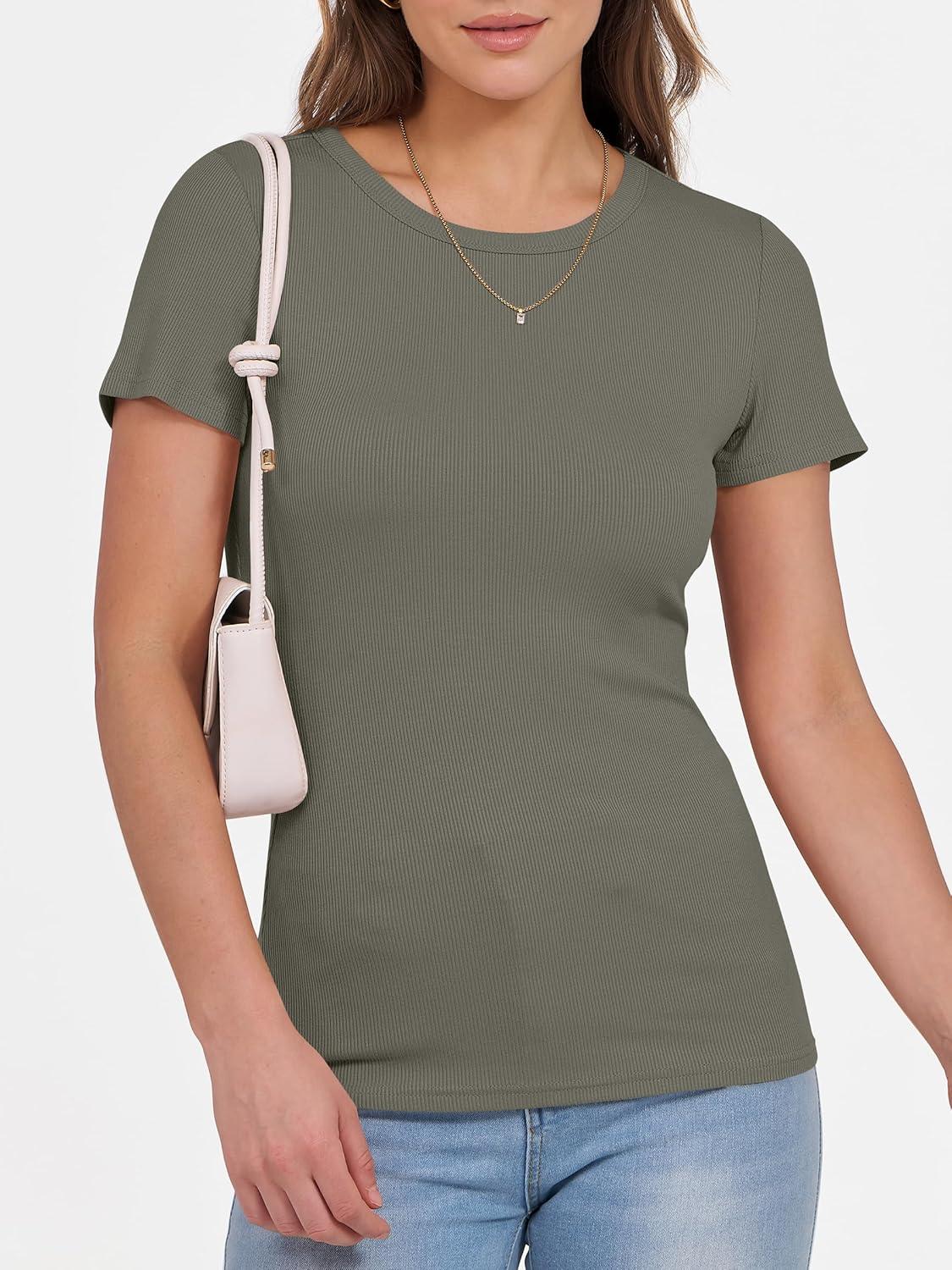 ANRABESS Women Short Sleeve Crewneck Ribbed Knit Slim Fitted Shirts Summer Tops Basic Tee Casual 2026 Spring Outfits Clothes(Army Green)
