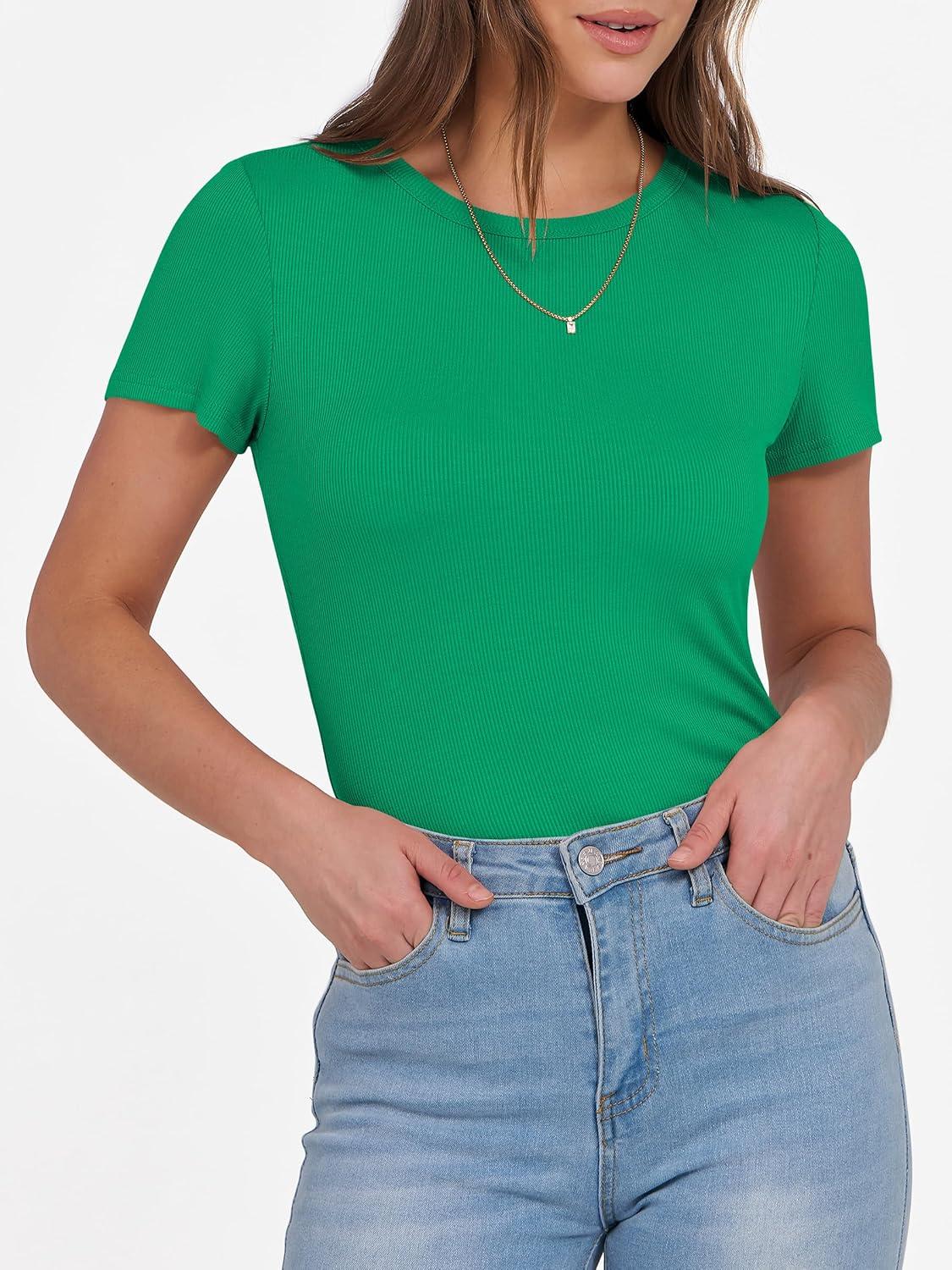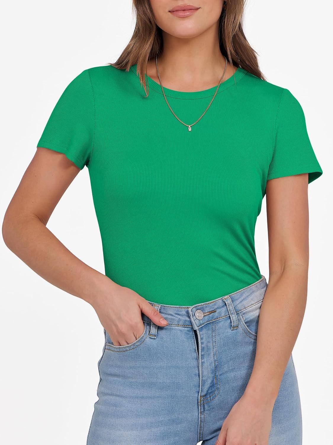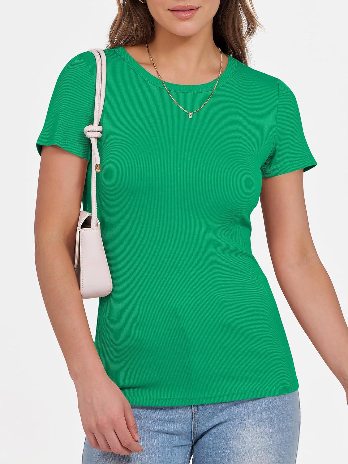 ANRABESS Women Short Sleeve Crewneck Ribbed Knit Slim Fitted Shirts Summer Tops Basic Tee Casual 2026 Spring Outfits Clothes(Green)