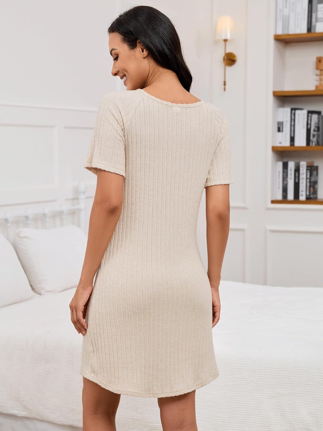 ANRABESS Women Short Sleeve Sleep Night Shirts Comfy Nightgowns Ribbed Pajamas House Sweater Dress 2025 Fall Sleepwear(Light Khaki)