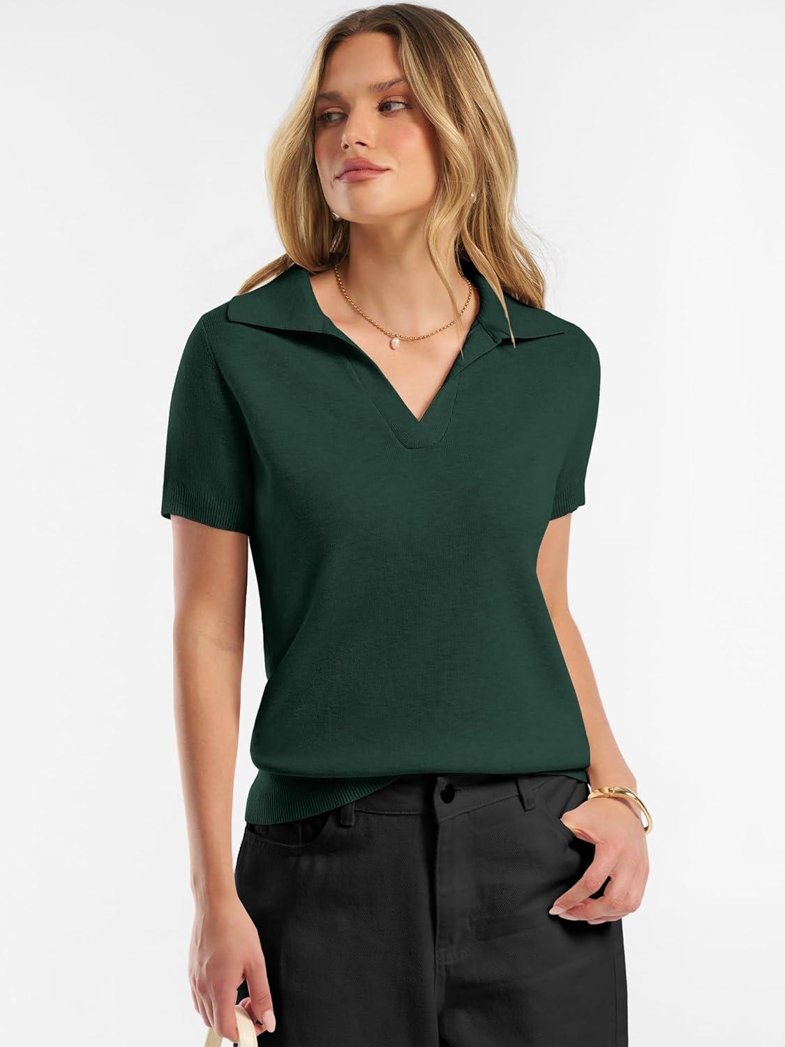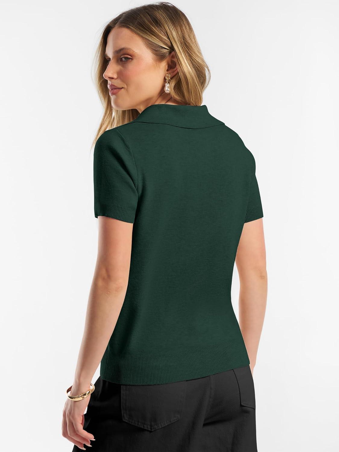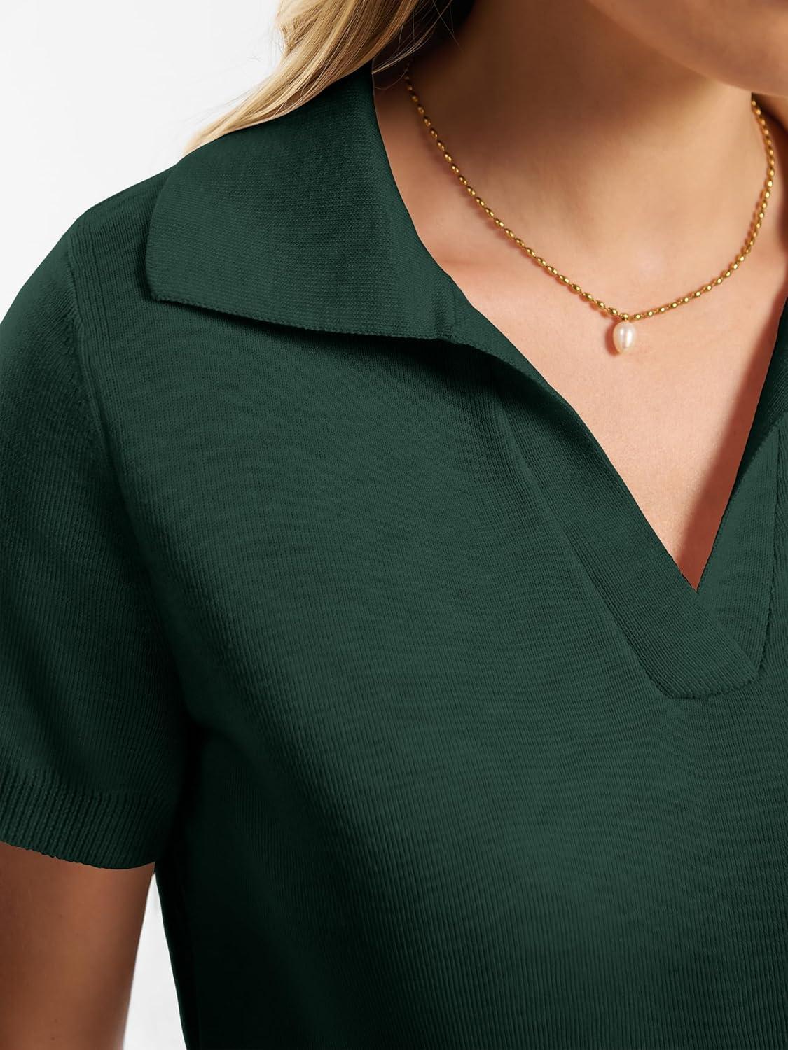 ANRABESS Women Short Sleeve Sweater Wool Blend Polo V Neck Shirts Summer Dressy Top Business Casual Spring Vacation Clothes(Dark Green)