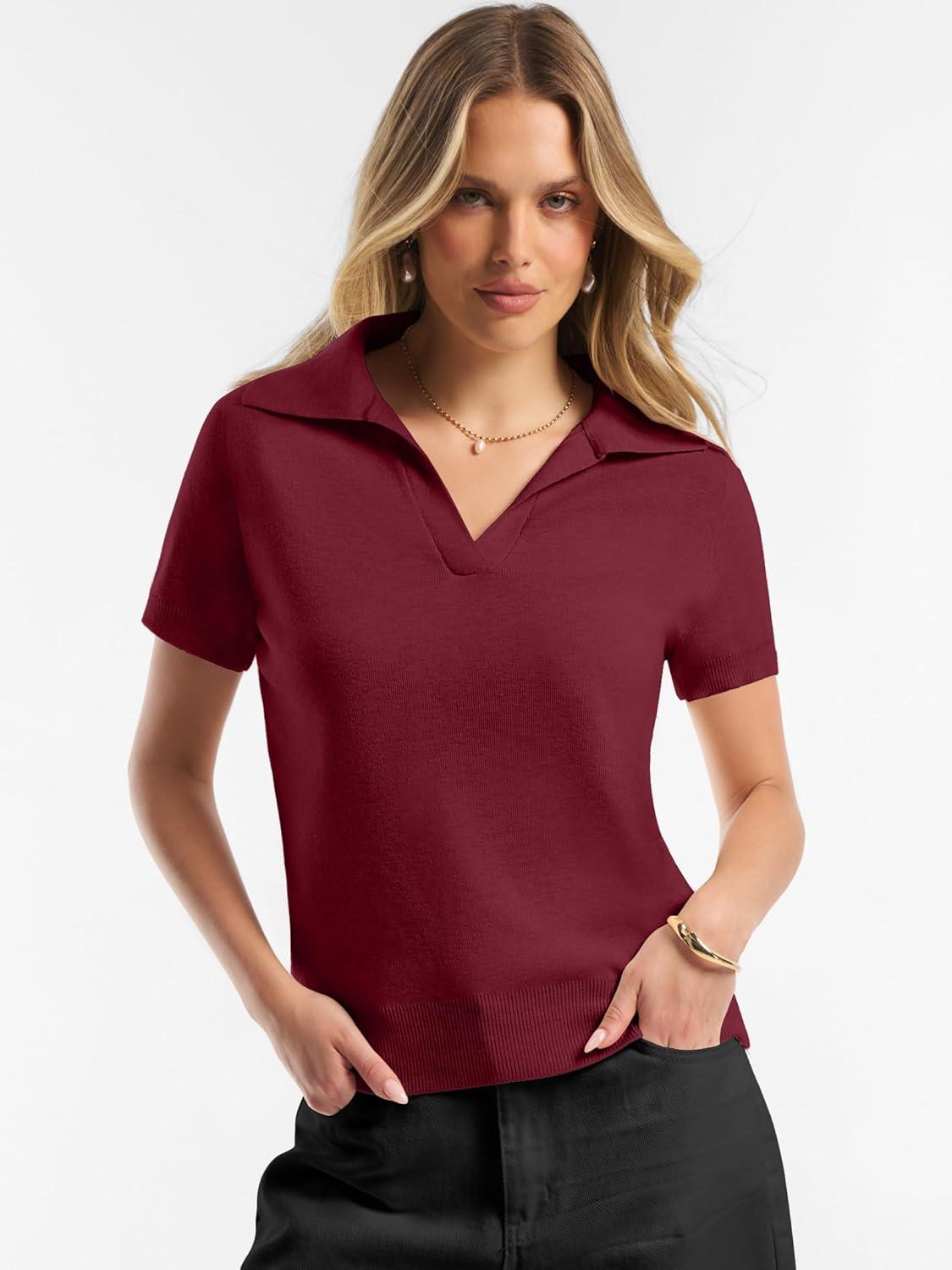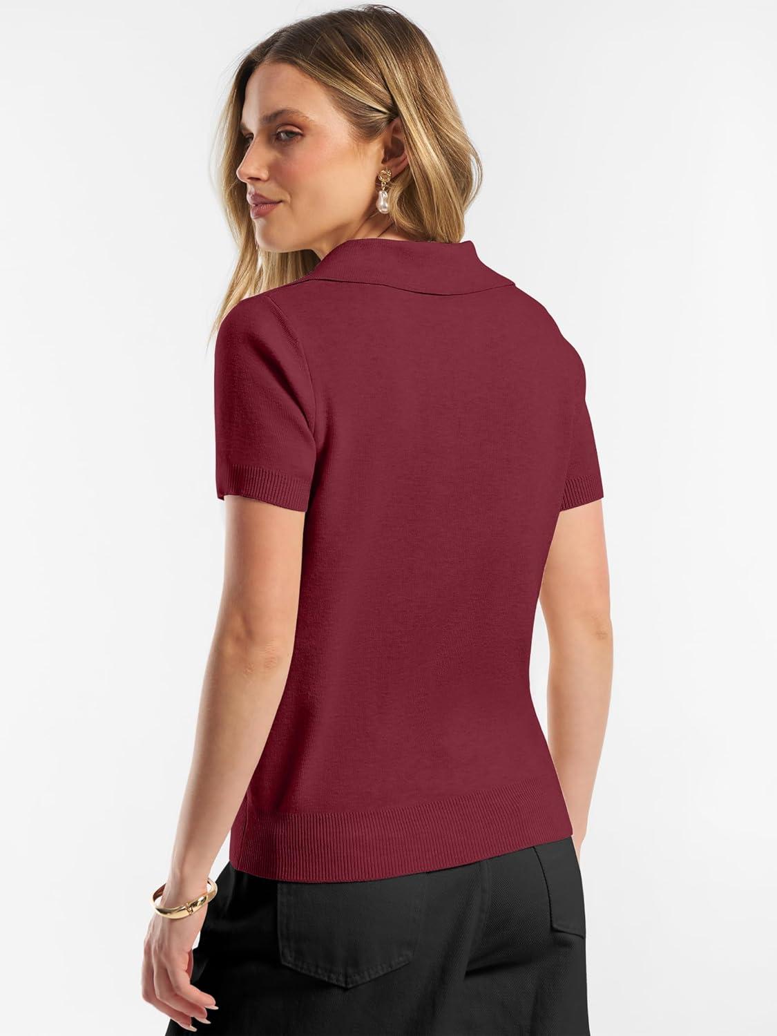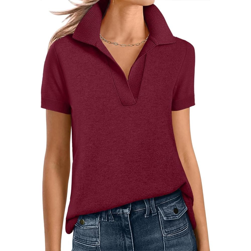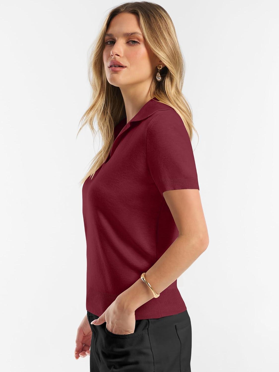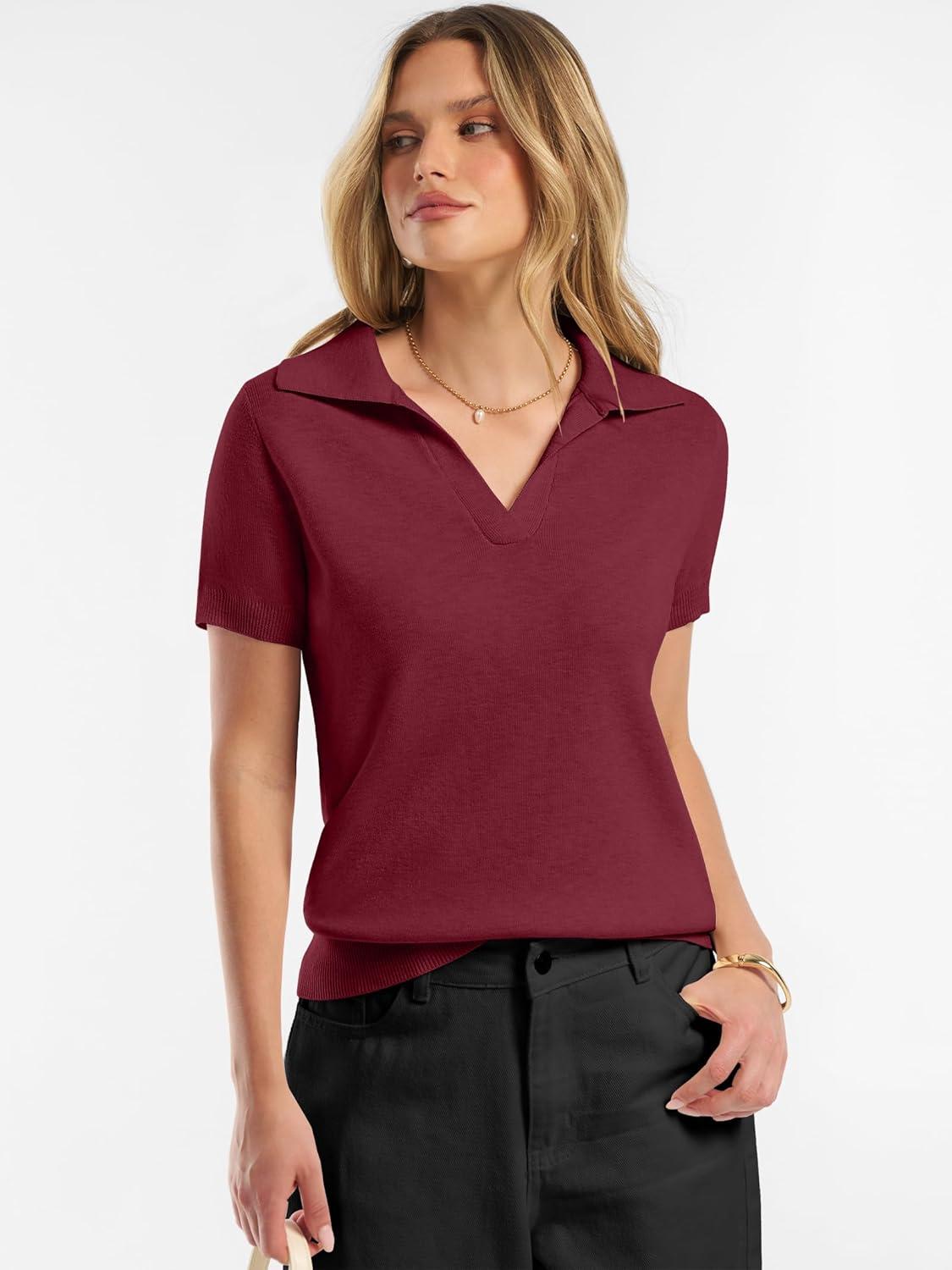 ANRABESS Women Short Sleeve Sweater Wool Blend Polo V Neck Shirts Summer Dressy Top Business Casual Spring Vacation Clothes(Wine Red)