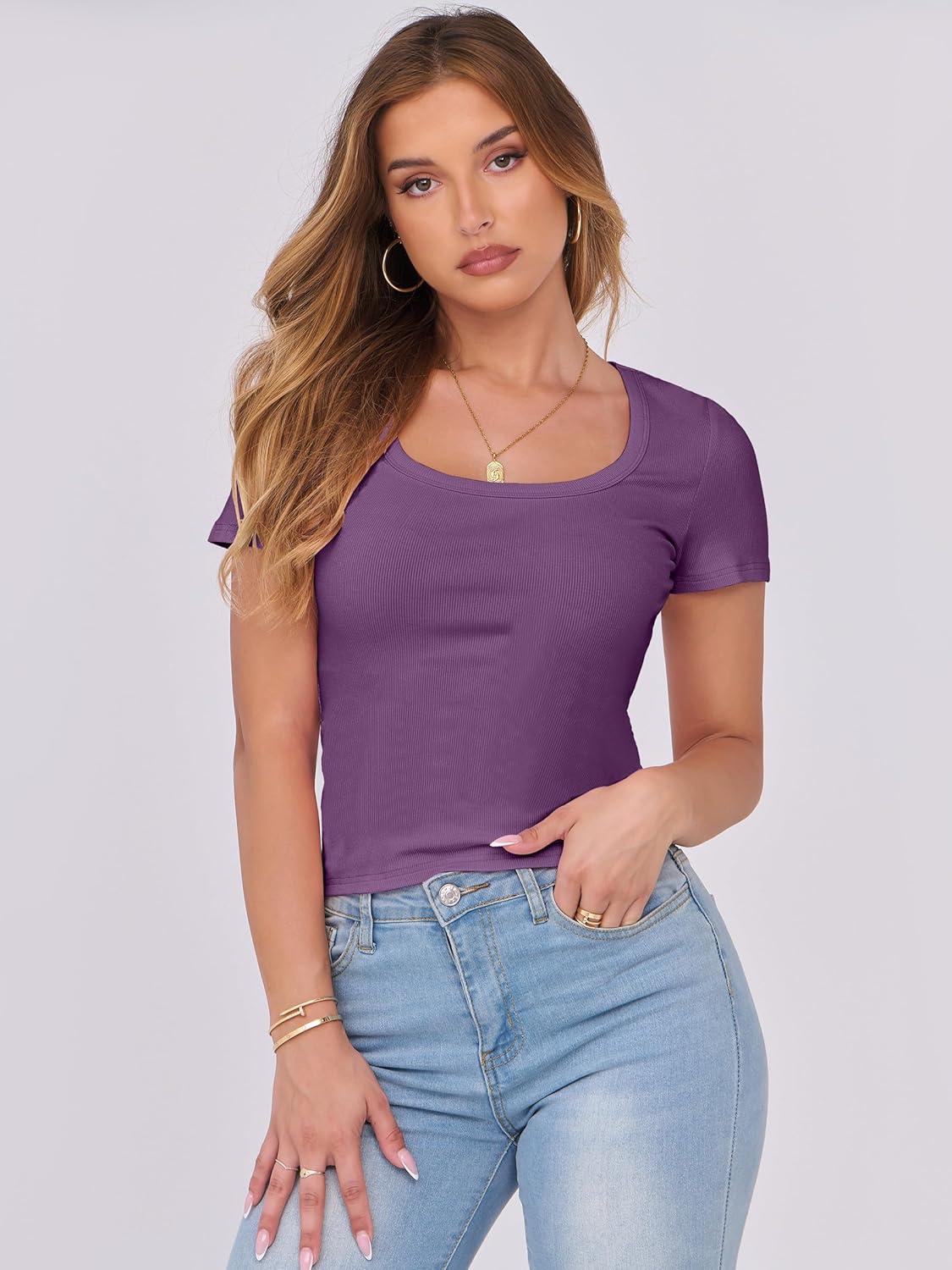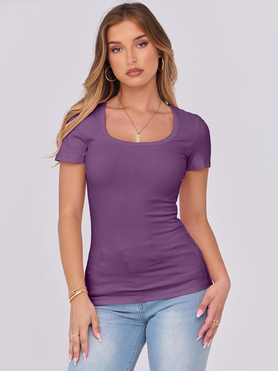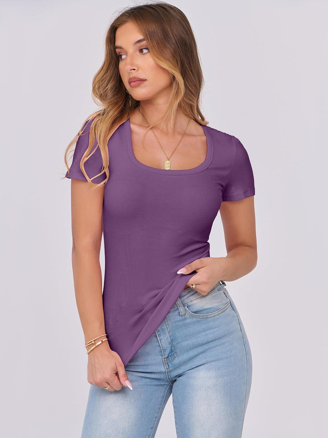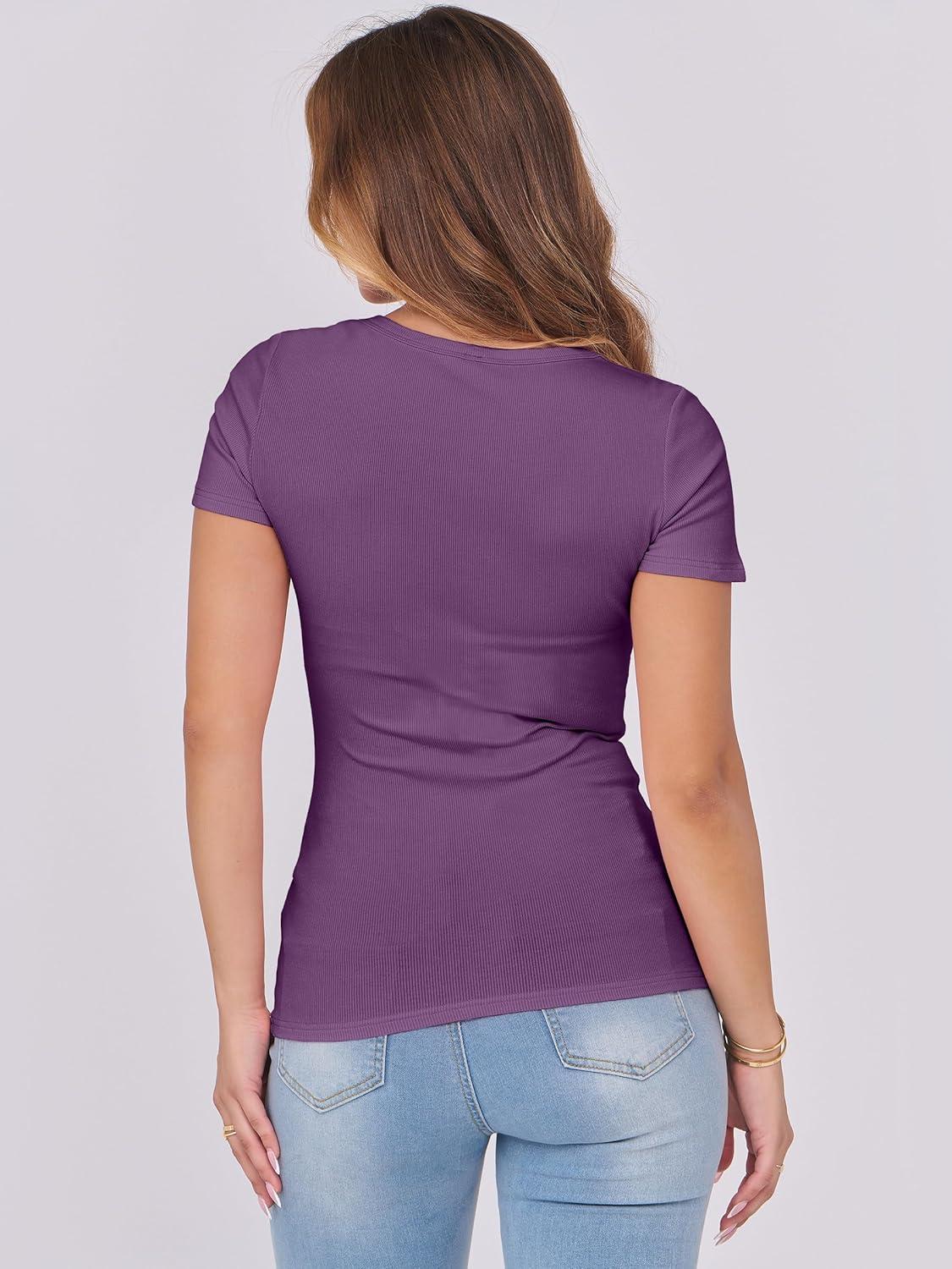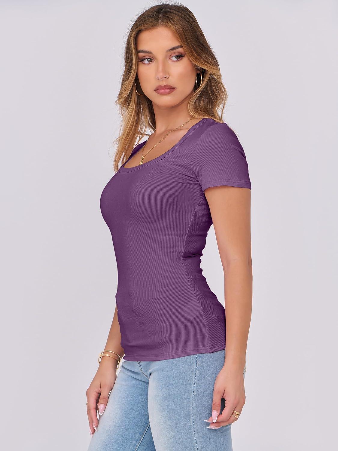 ANRABESS Women Short Sleeve Tops Scoop Neck Ribbed Knit Slim Fitted Basic Tee Shirt Casual Summer Clothes 2026 Spring Outfits(Purple)