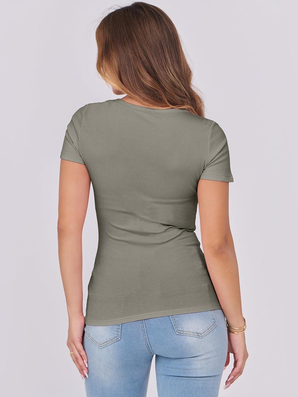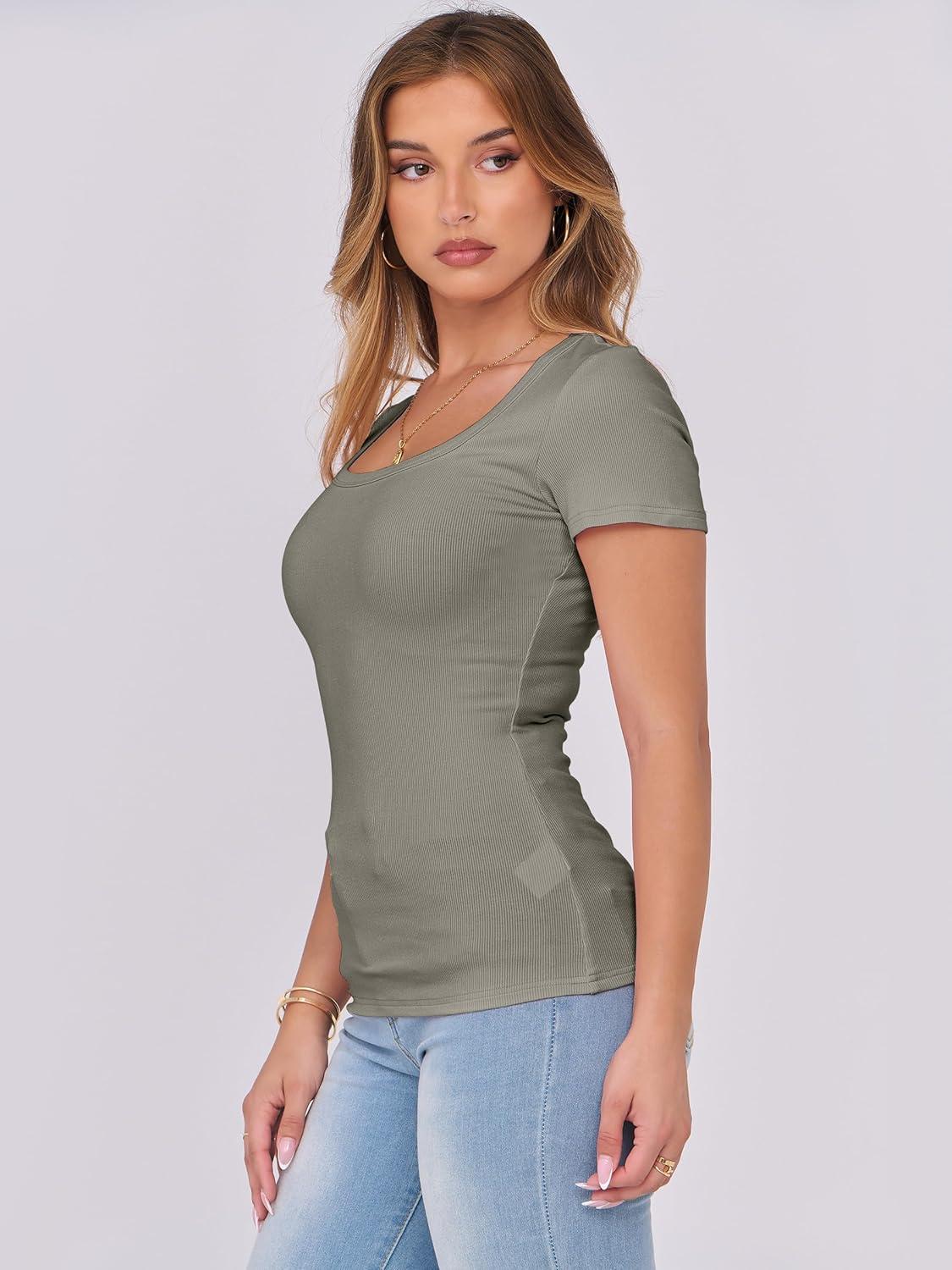 ANRABESS Women Short Sleeve Tops Scoop Neck Ribbed Knit Slim Fitted Basic Tee Shirt Casual Summer Clothes 2026 Spring Outfits(Sage Green)