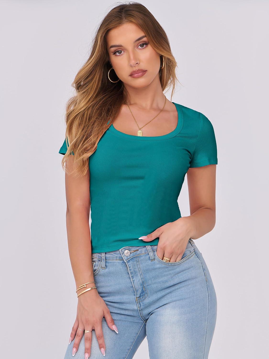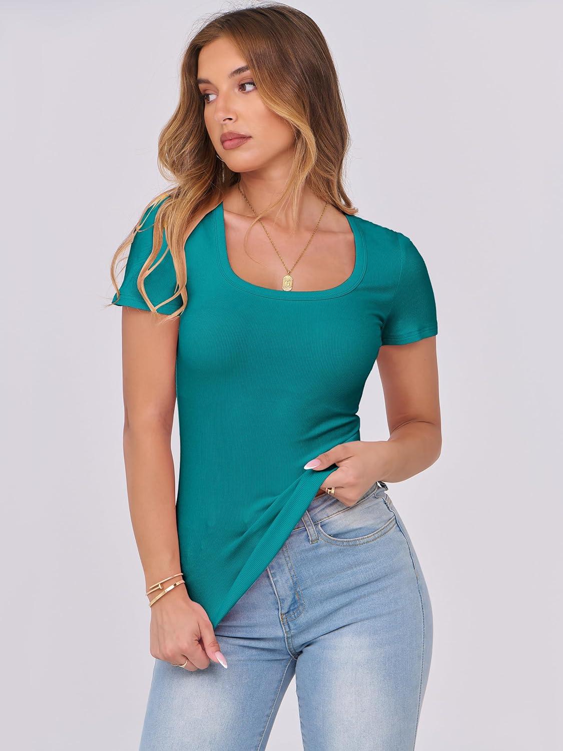 ANRABESS Women Short Sleeve Tops Scoop Neck Ribbed Knit Slim Fitted Basic Tee Shirt Casual Summer Clothes 2026 Spring Outfits(Teal)