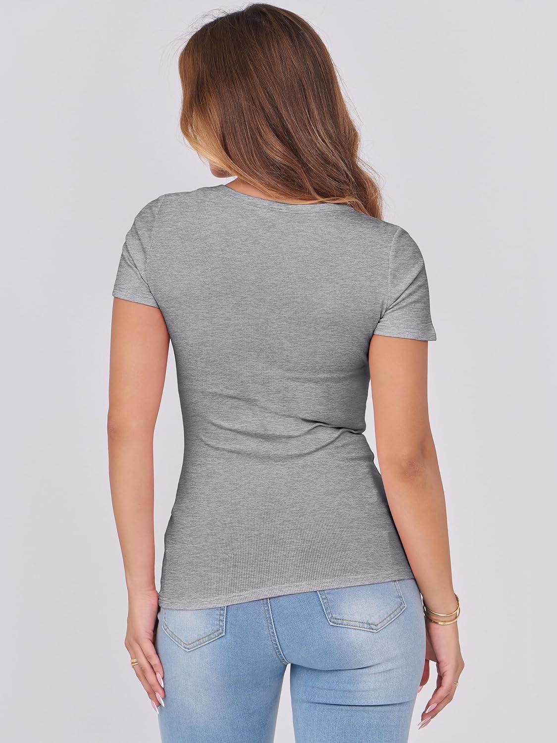 ANRABESS Women Short Sleeve Tops Scoop Neck Ribbed Knit Slim Fitted Basic Tee Shirts Casual Summer Clothes 2025 Fall Outfits(Grey)