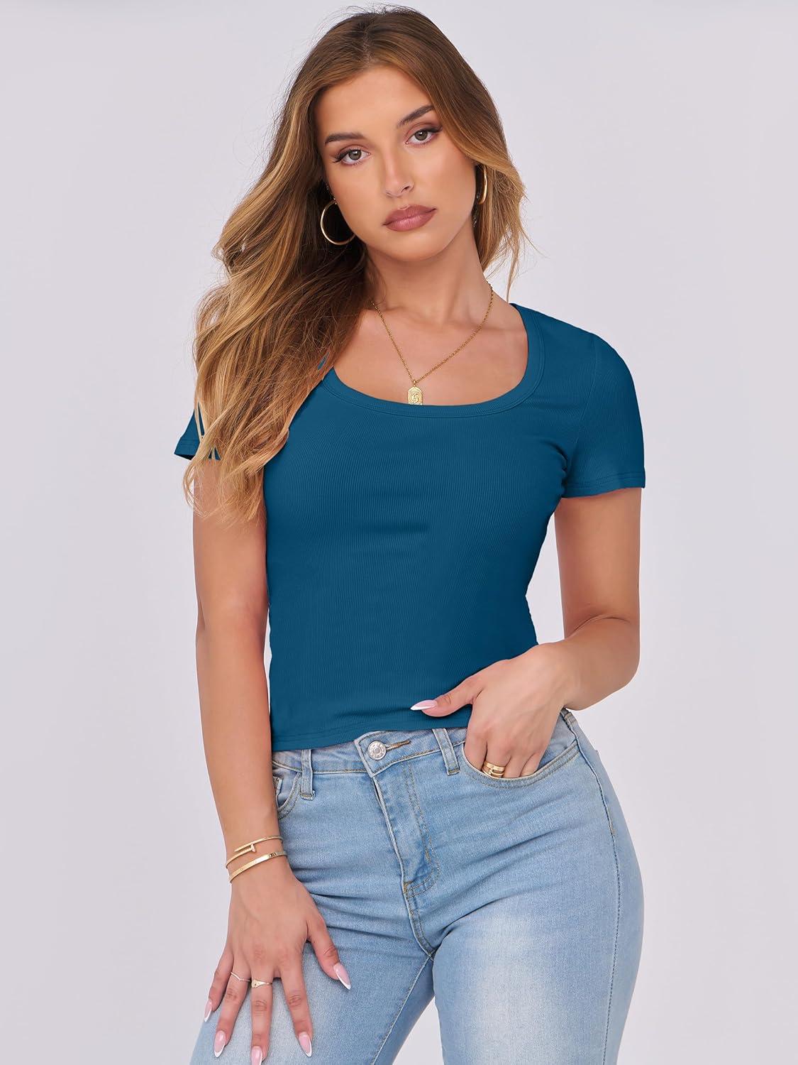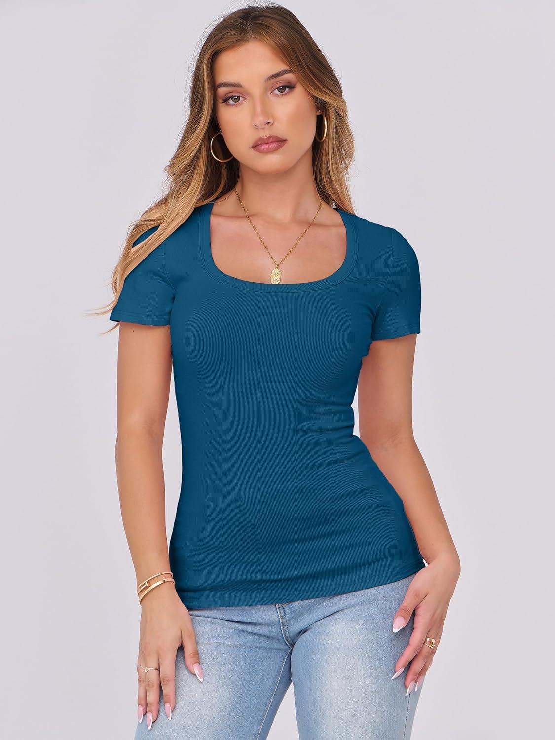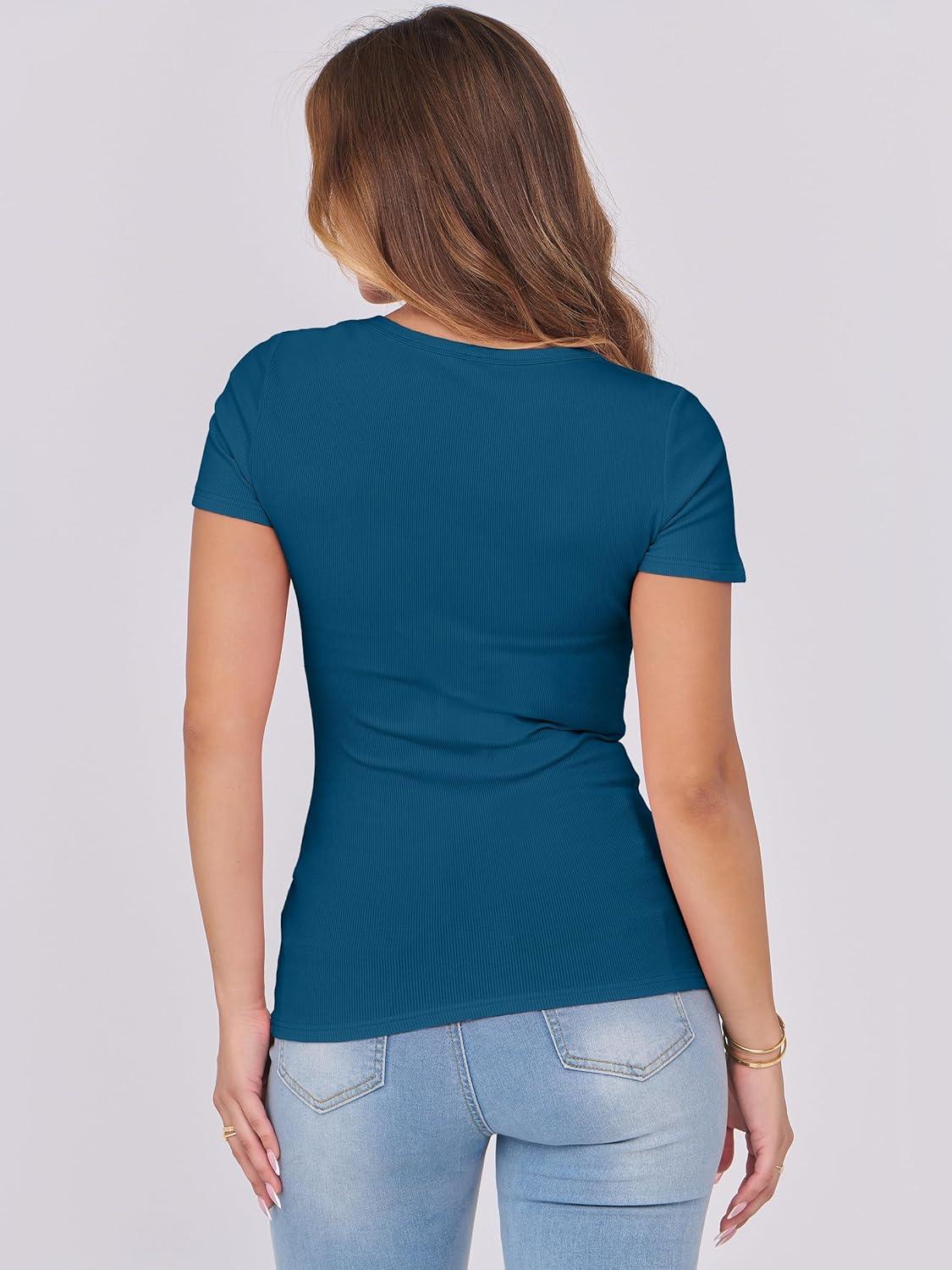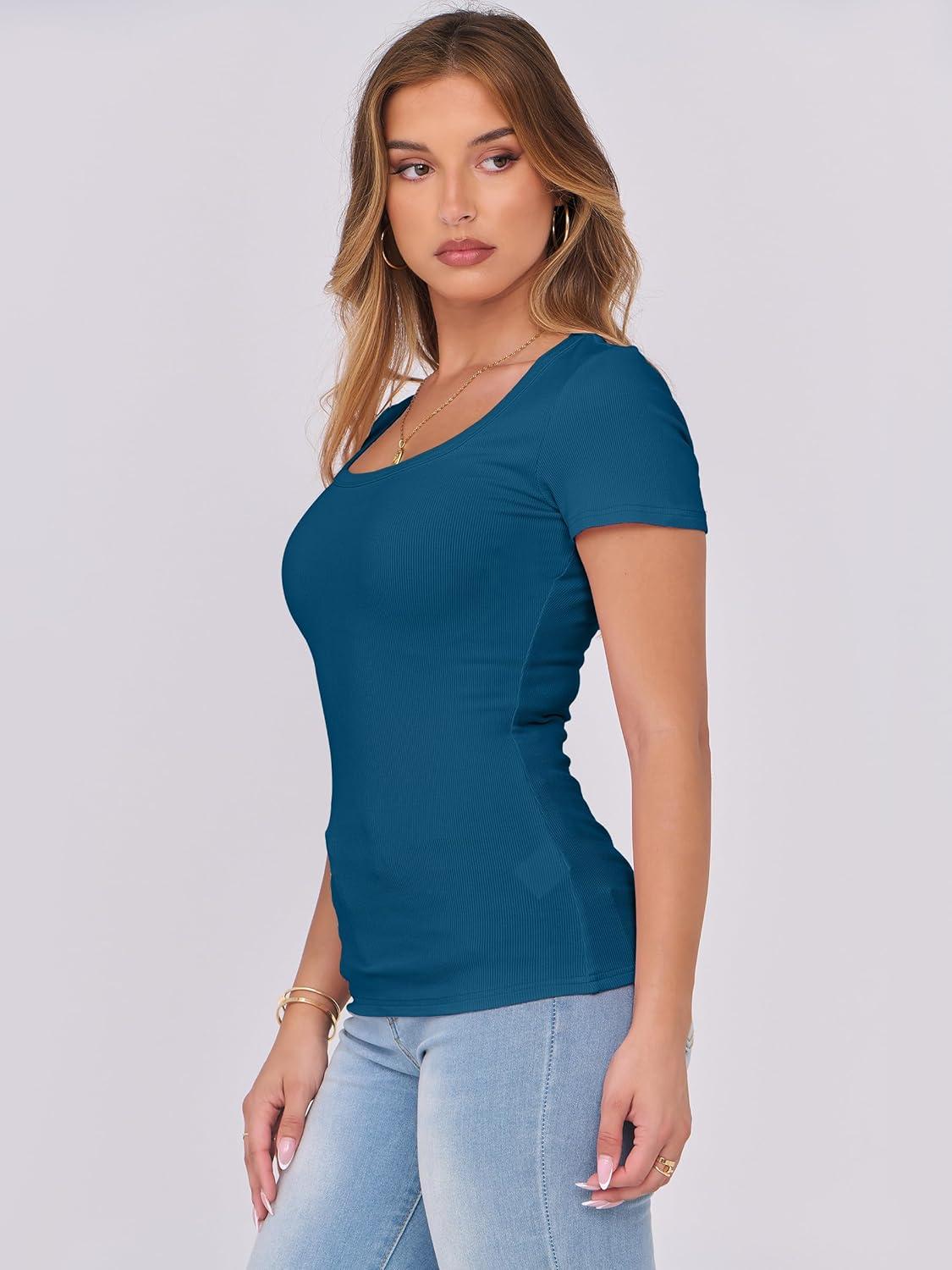 ANRABESS Women Short Sleeve Tops Scoop Neck Ribbed Knit Slim Fitted Basic Tee Shirts Casual Summer Clothes 2025 Fall Outfits(Indigo)