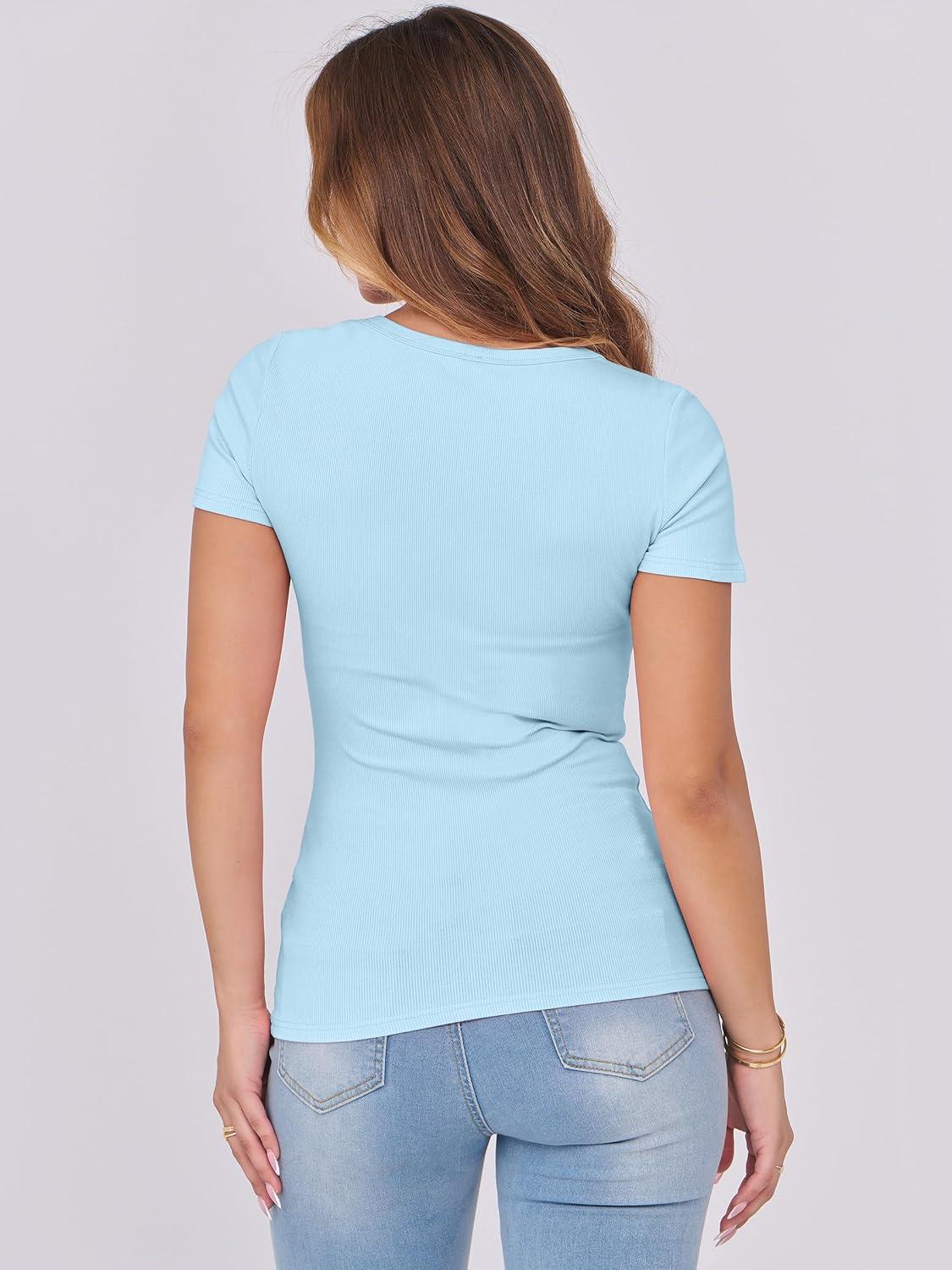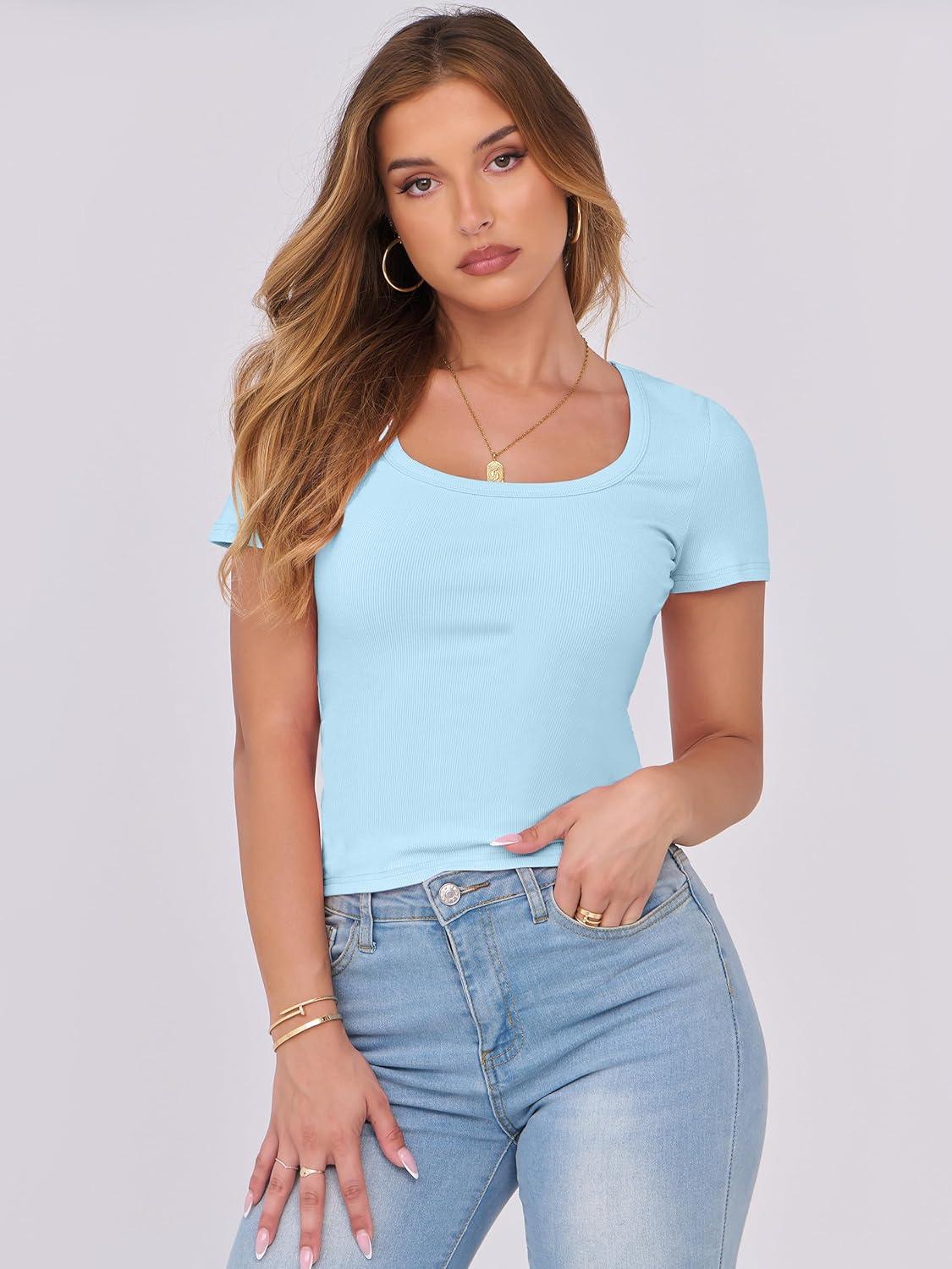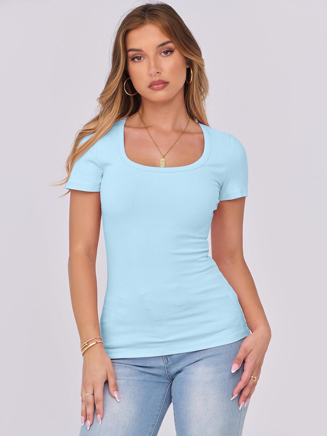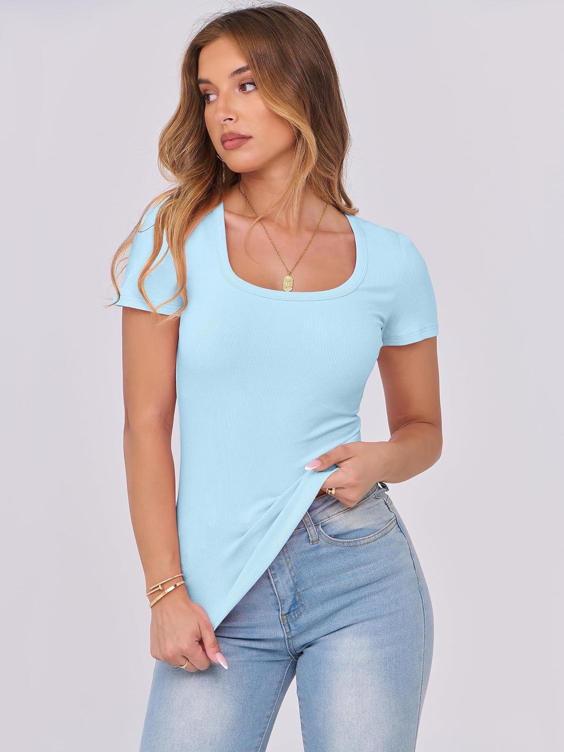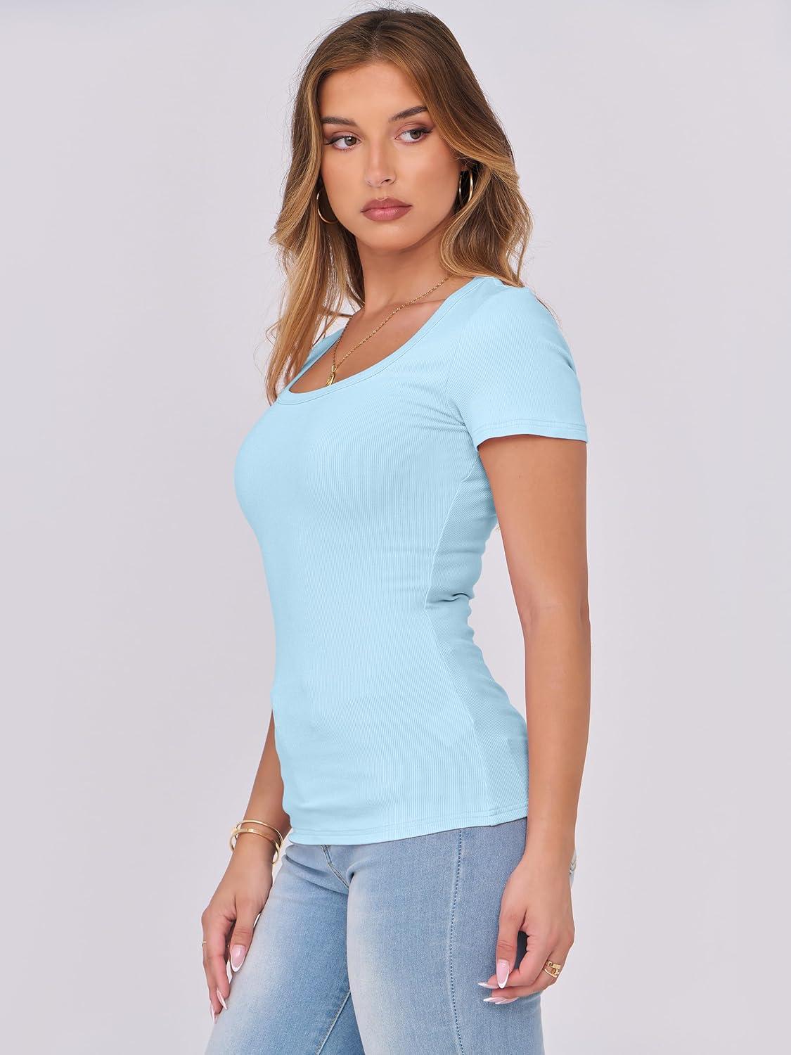 ANRABESS Women Short Sleeve Tops Scoop Neck Ribbed Knit Slim Fitted Basic Tee Shirts Casual Summer Clothes 2025 Fall Outfits(Light Blue-2)