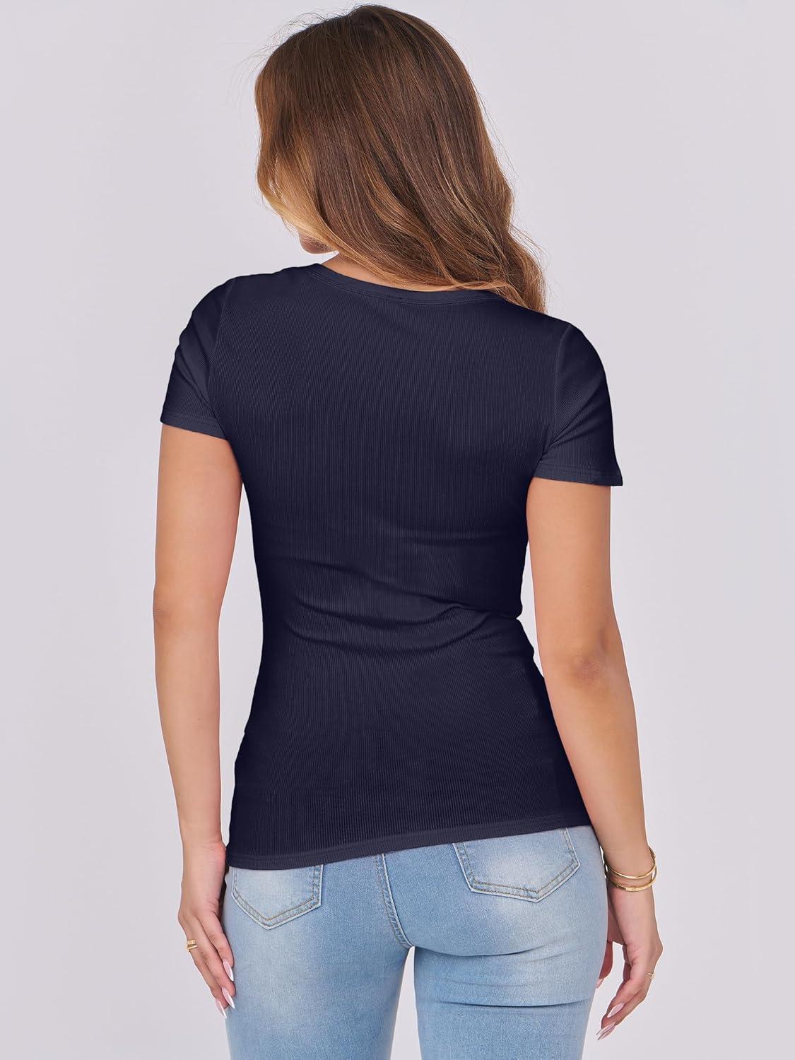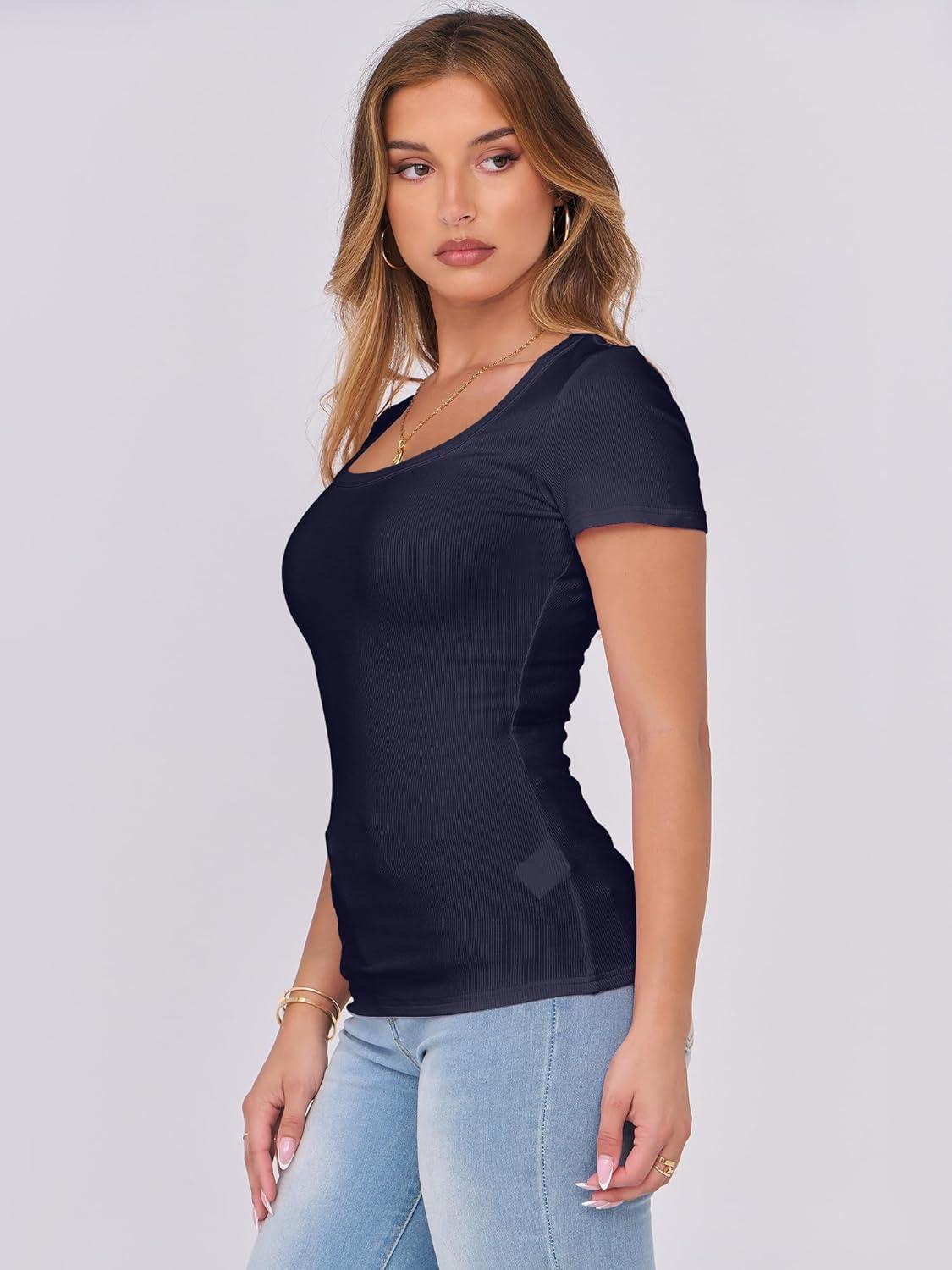 ANRABESS Women Short Sleeve Tops Scoop Neck Ribbed Knit Slim Fitted Basic Tee Shirts Casual Summer Clothes 2025 Fall Outfits(Navy Blue)