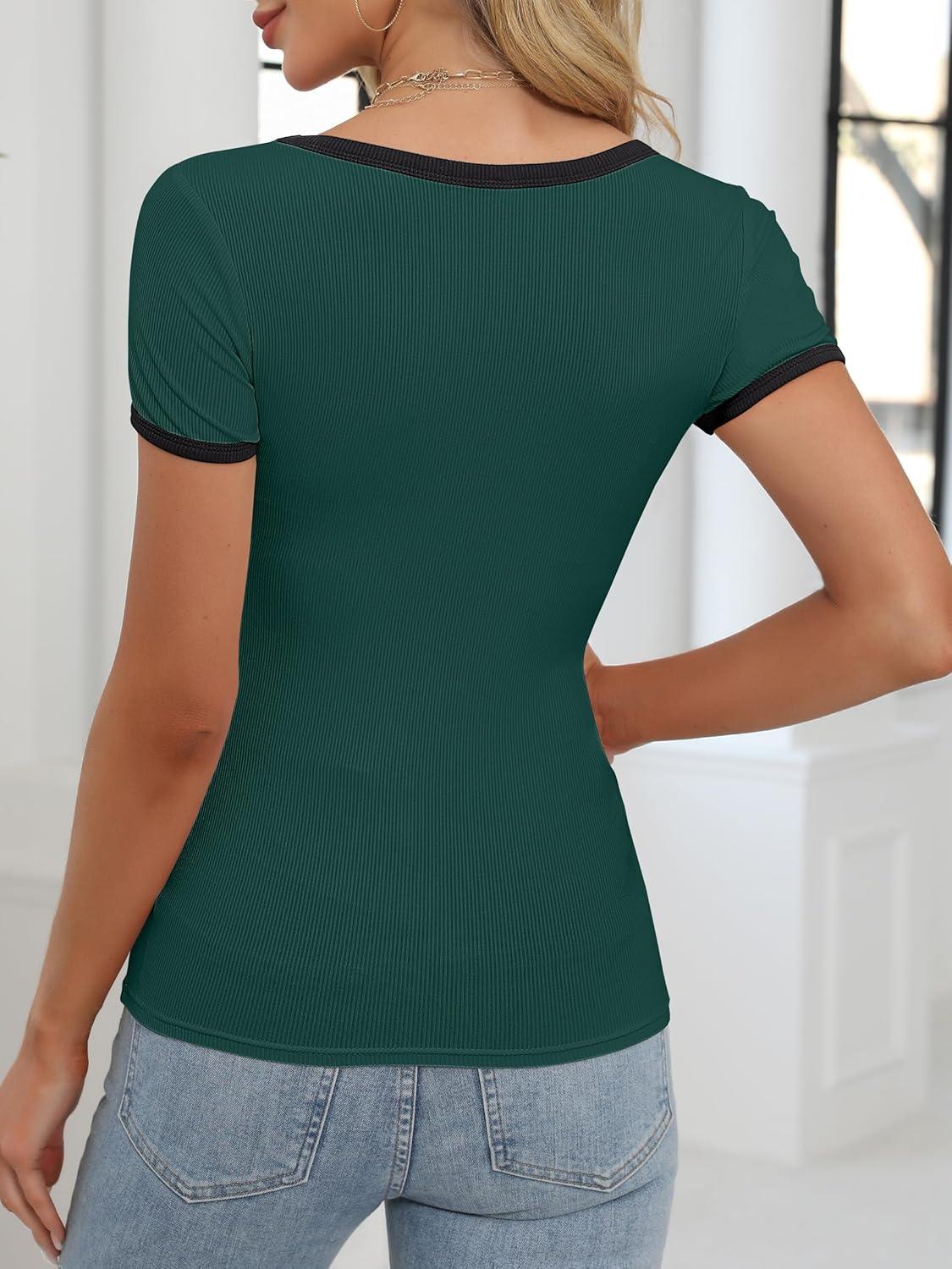 ANRABESS Women Short Sleeve Tops Square Neck Ribbed Knit Color Block T Shirts Fitted Casual Summer 2026 Trendy Basic Tees(Deep Green)
