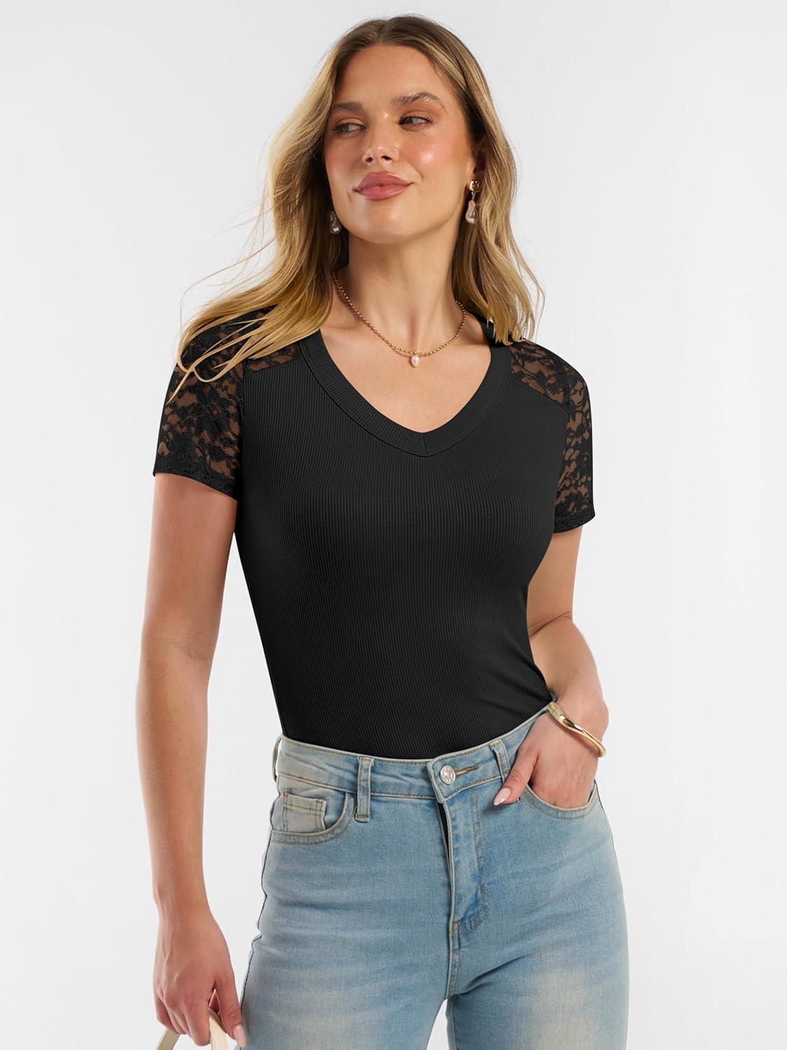 ANRABESS Women Short Sleeve V Neck Lace Shirts Ribbed Knit Fitted Basic Tee Top 2026 Summer Casual T-Shirts Going Out Outfits(Black)