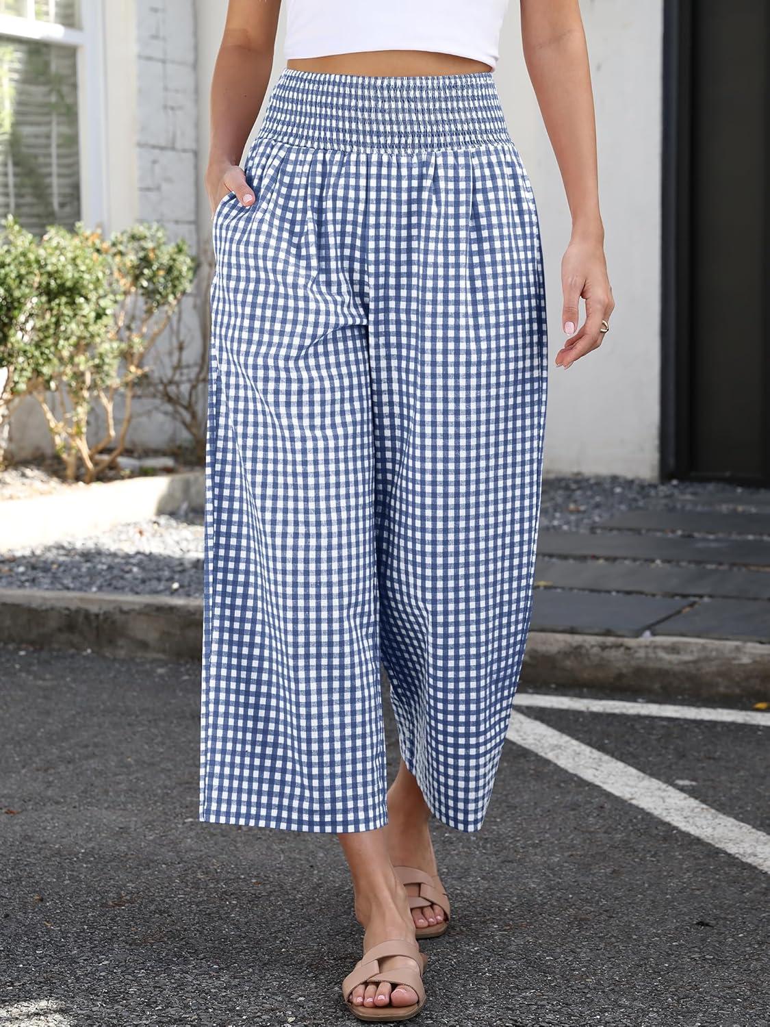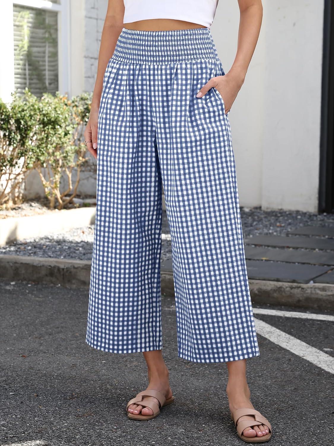 ANRABESS Women Striped Gingham Wide Leg Palazzo Pants Casual Lounge Cropped PJ Bottoms Comfy Cute Plaid Pants with Pockets(Blue White Plaid)