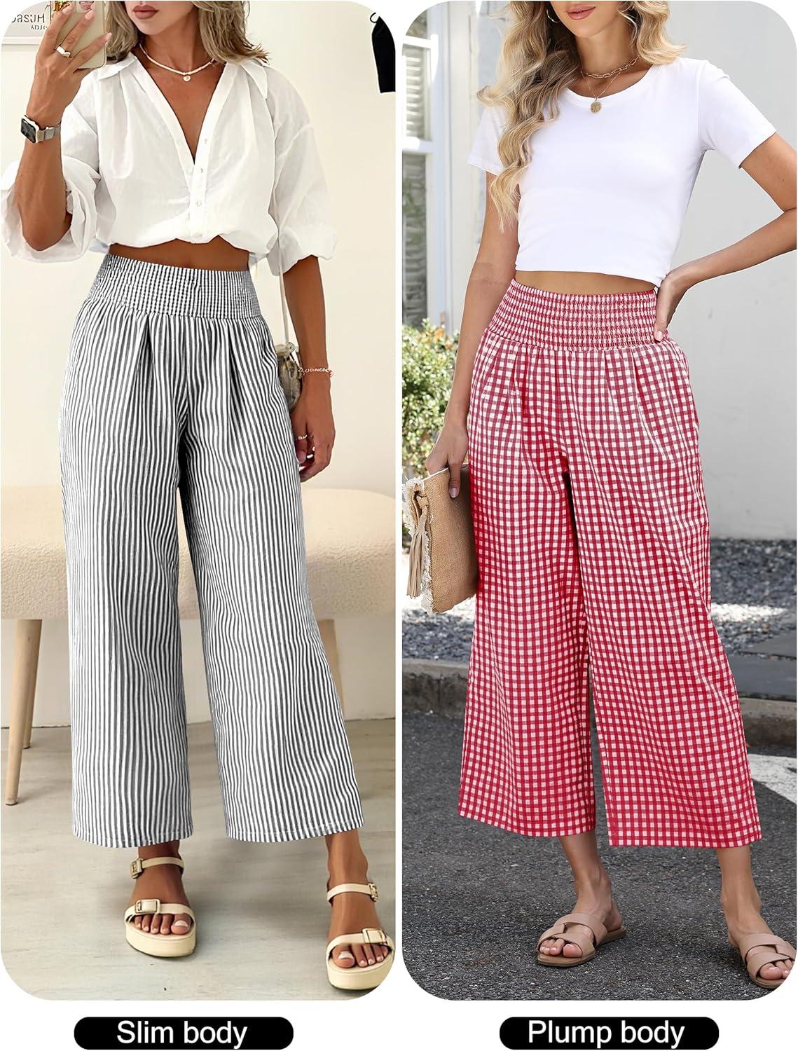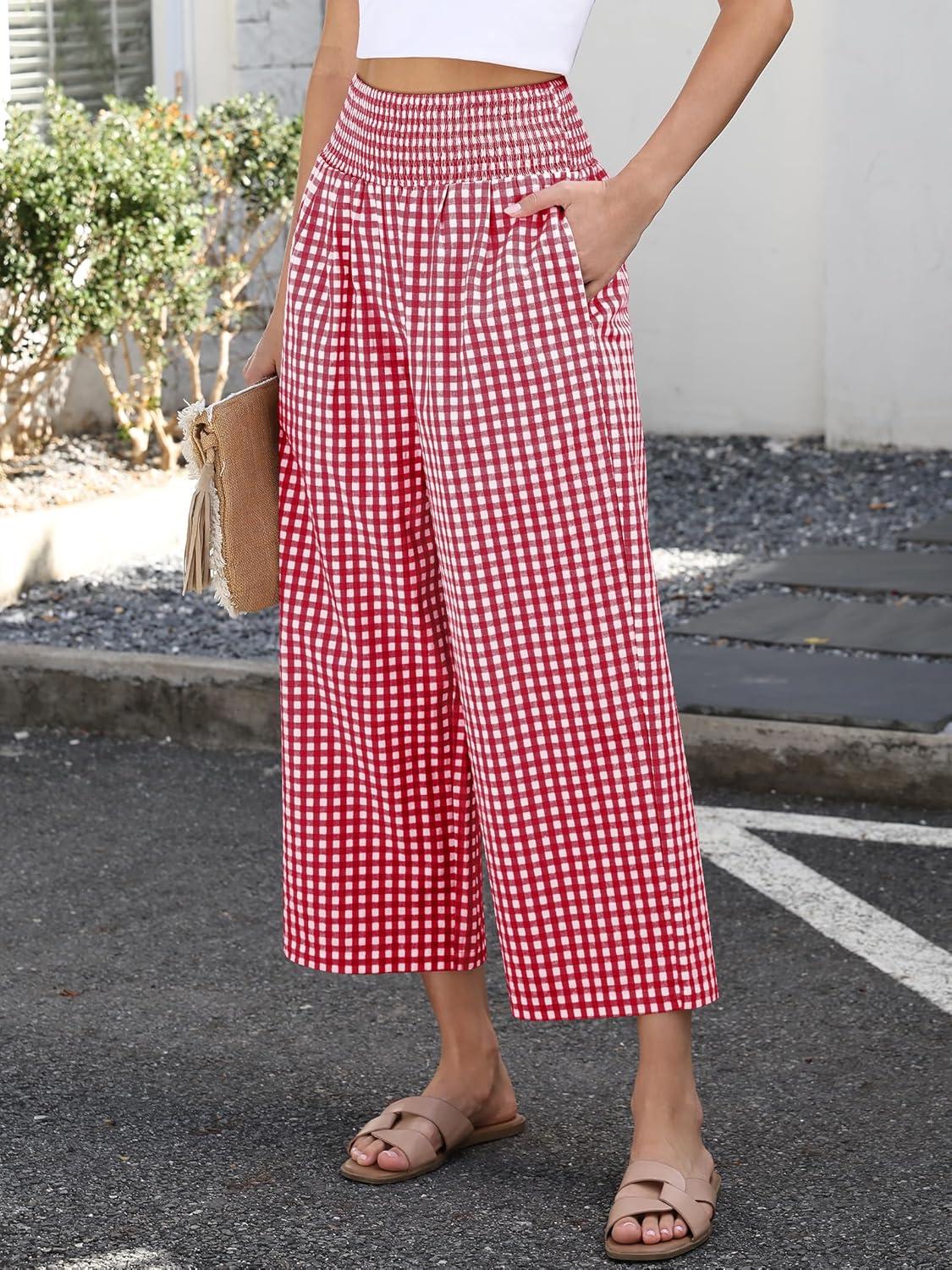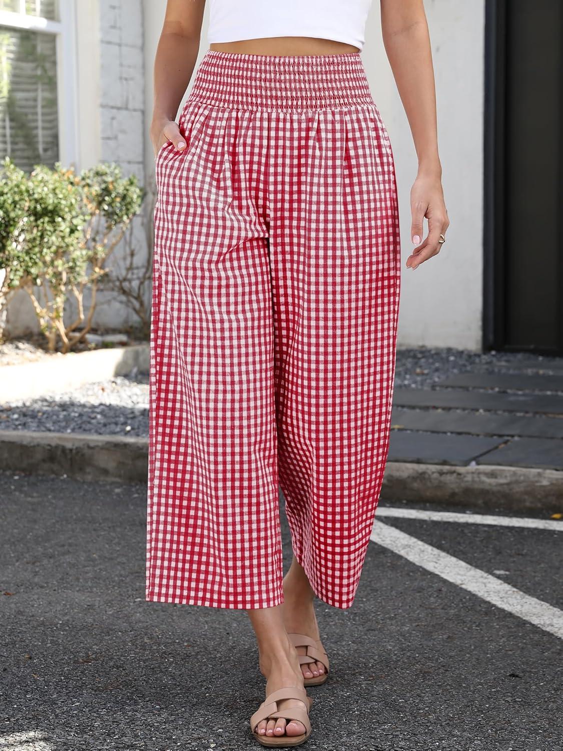 ANRABESS Women Striped Gingham Wide Leg Palazzo Pants Casual Lounge Cropped PJ Bottoms Comfy Cute Plaid Pants with Pockets(Red White Plaid)