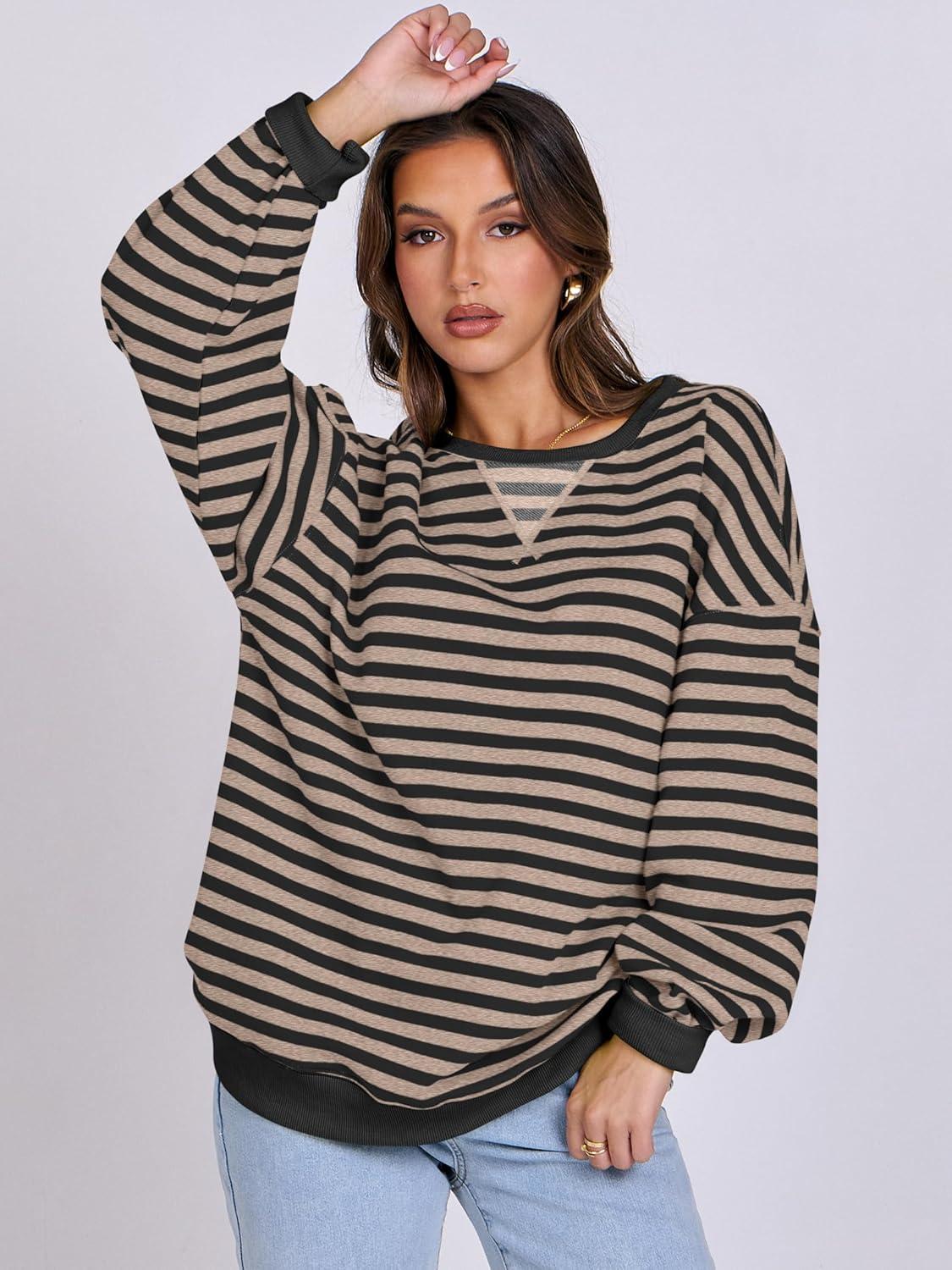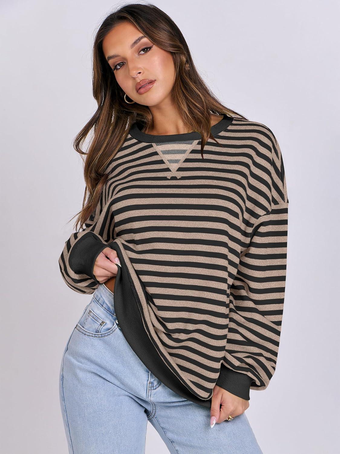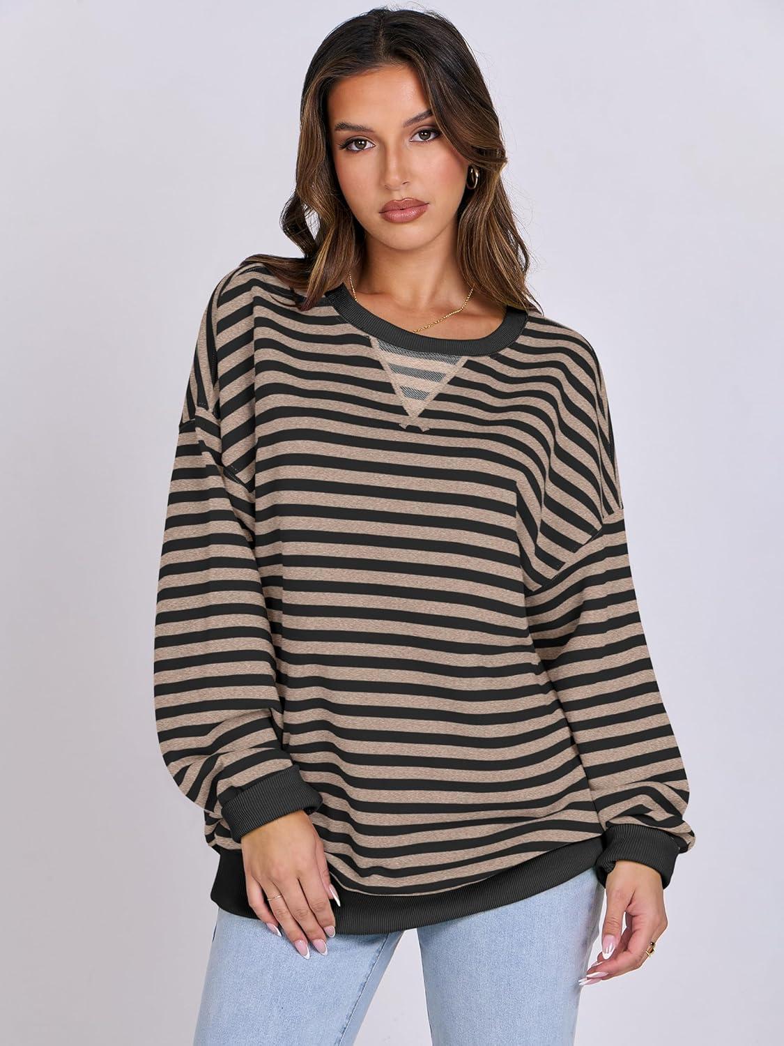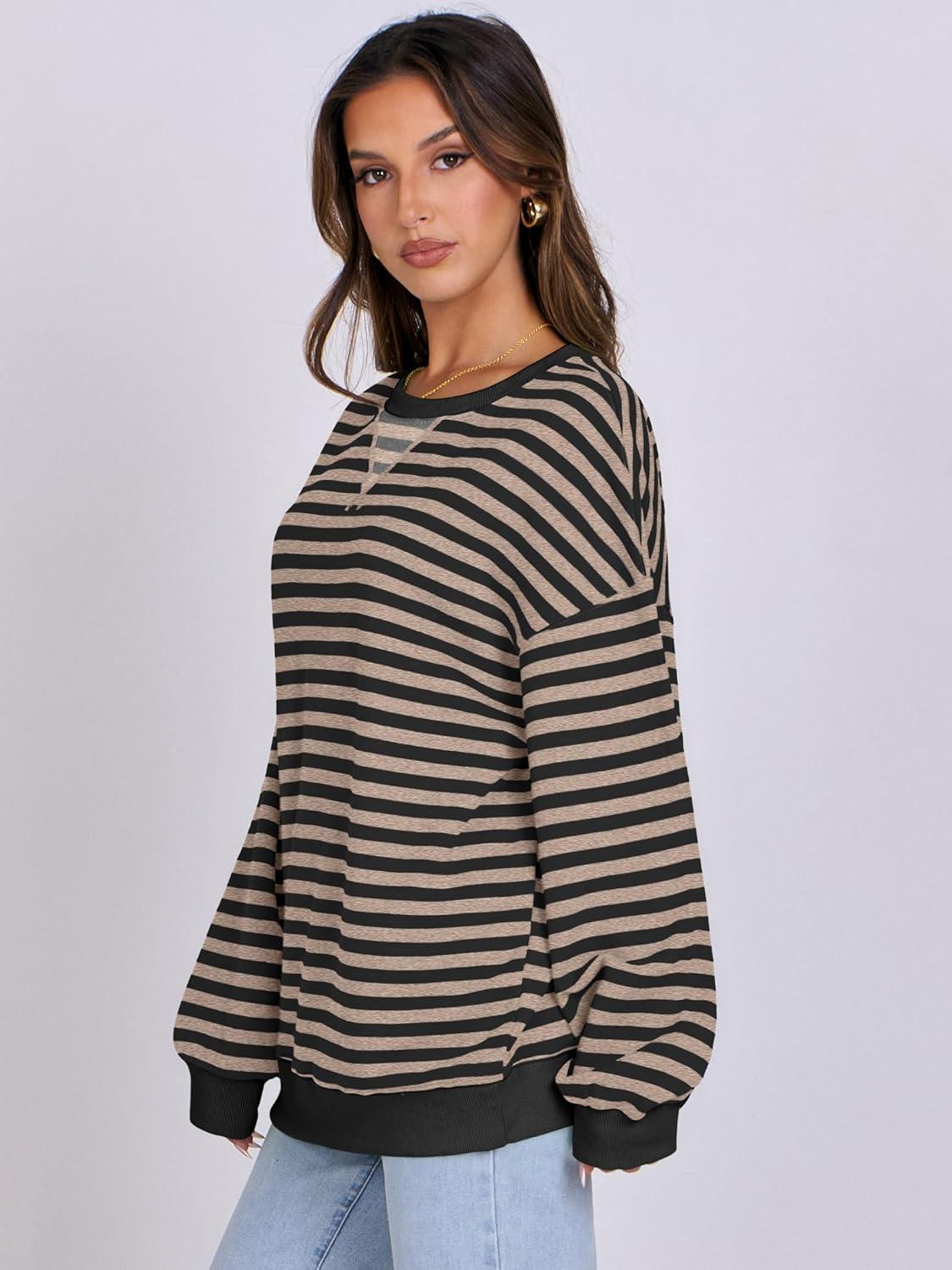 ANRABESS Women Striped Sweatshirts Oversized Crewneck Long Sleeve Shirts Y2K Pullover Top 2025 Fall Outfits Fashion Clothes(Black White)
