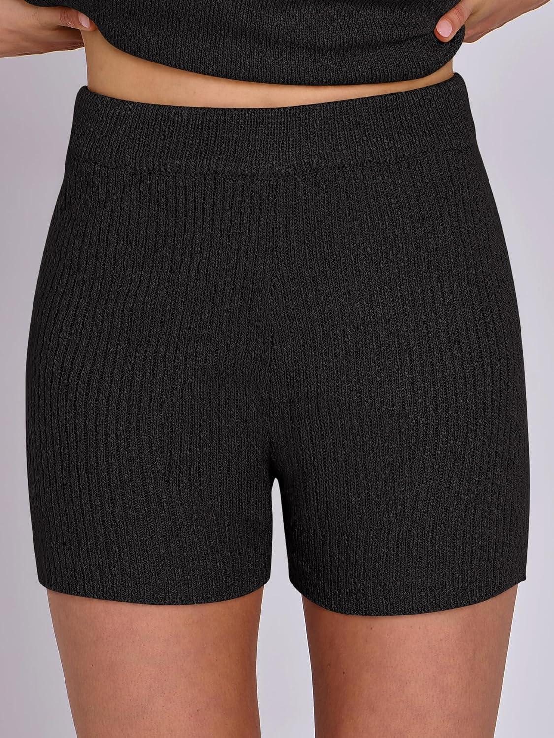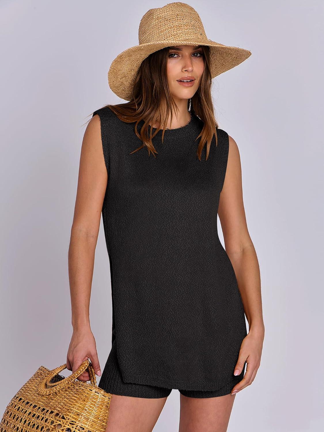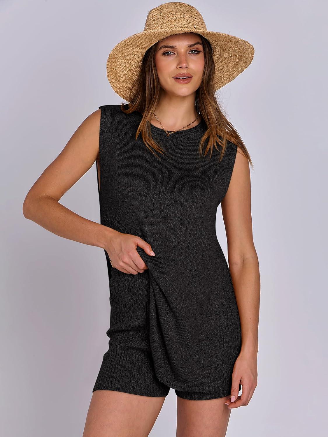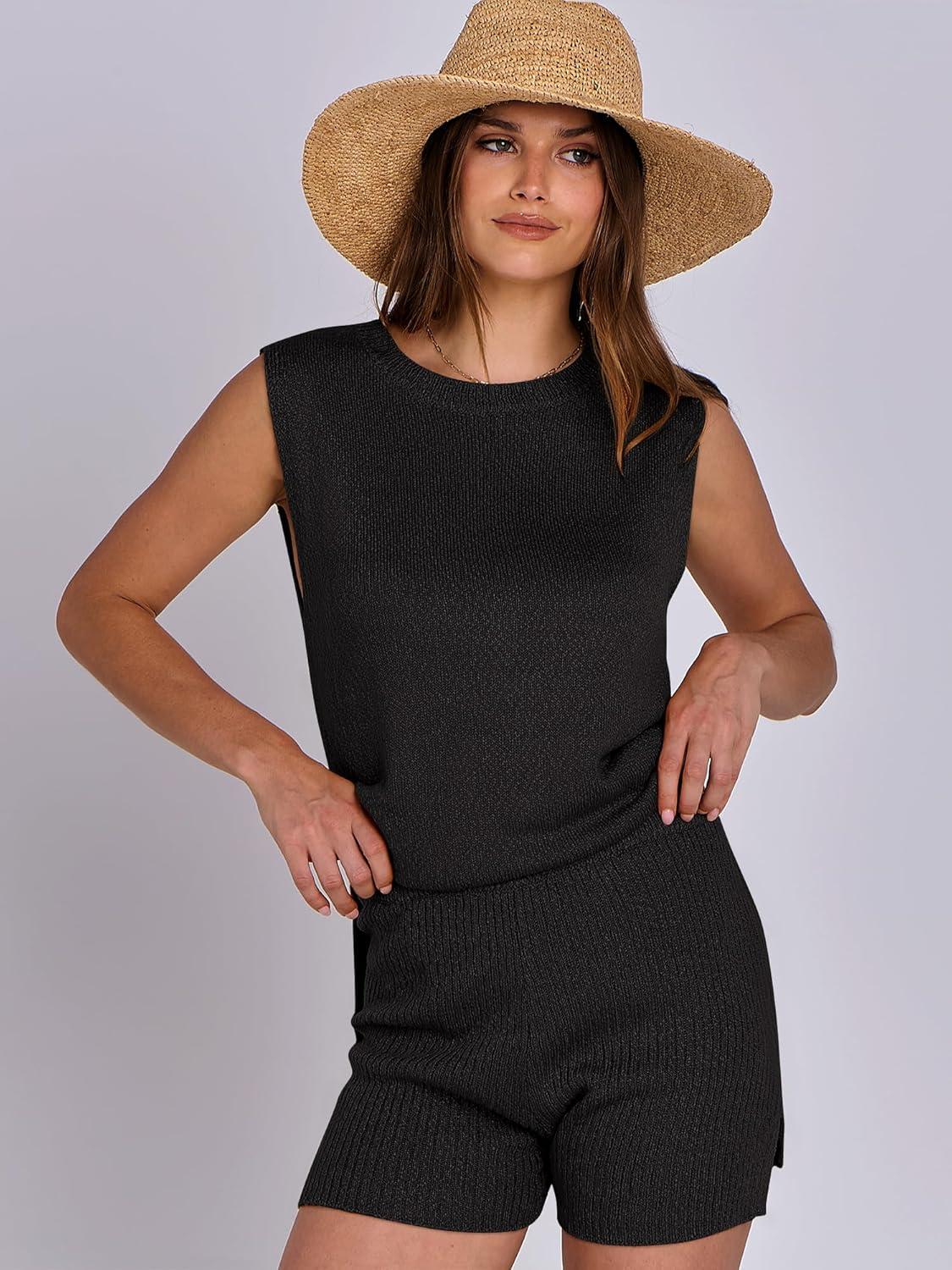 ANRABESS Women Summer 2 Piece Outfits Sleeveless Knit Sweater Top & Shorts Soft Lounge Sets Travel Beach 2025 Spring Clothes(Black)