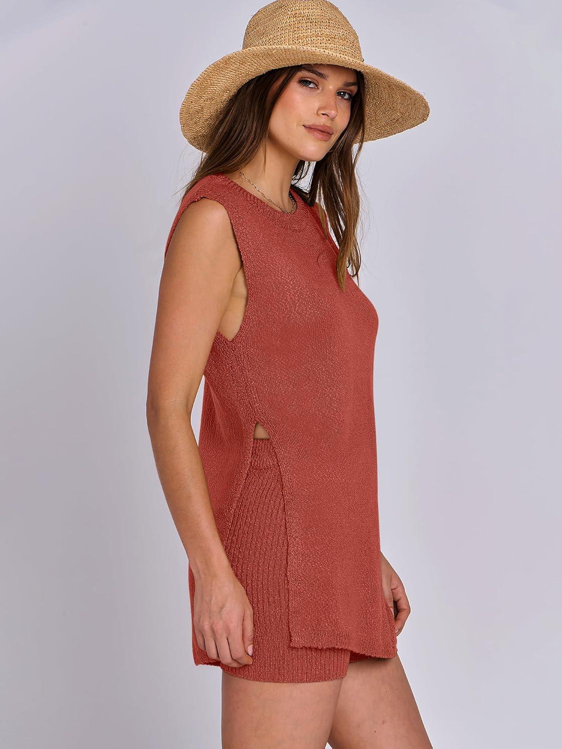 ANRABESS Women Summer 2 Piece Outfits Sleeveless Knit Sweater Top & Shorts Soft Lounge Sets Travel Beach 2025 Spring Clothes(Rust)