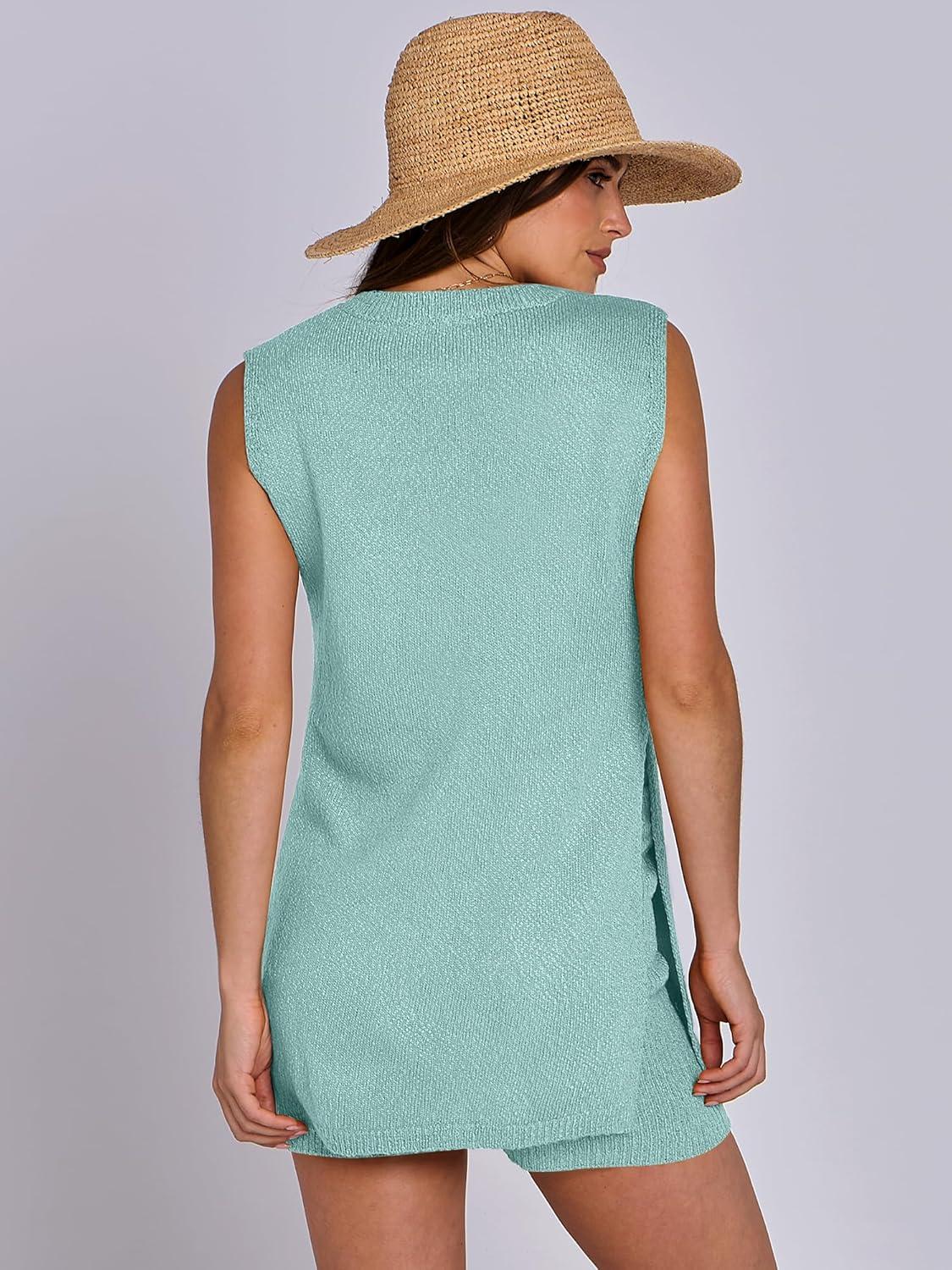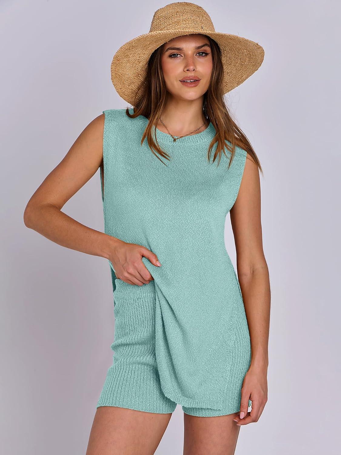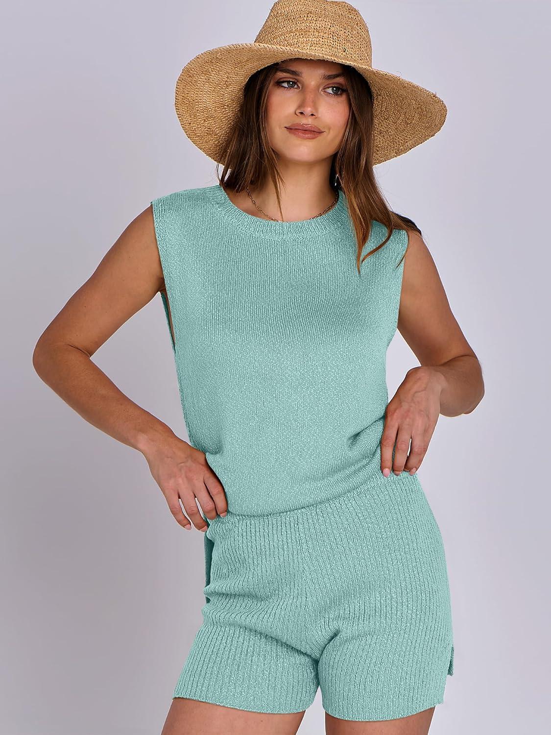 ANRABESS Women Summer 2 Piece Outfits Sleeveless Knit Sweater Top & Shorts Soft Lounge Sets Travel Beach 2025 Spring Clothes(Teal Blue)