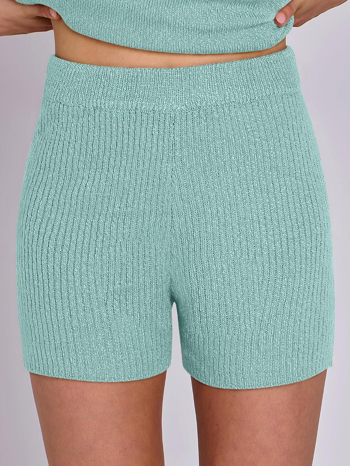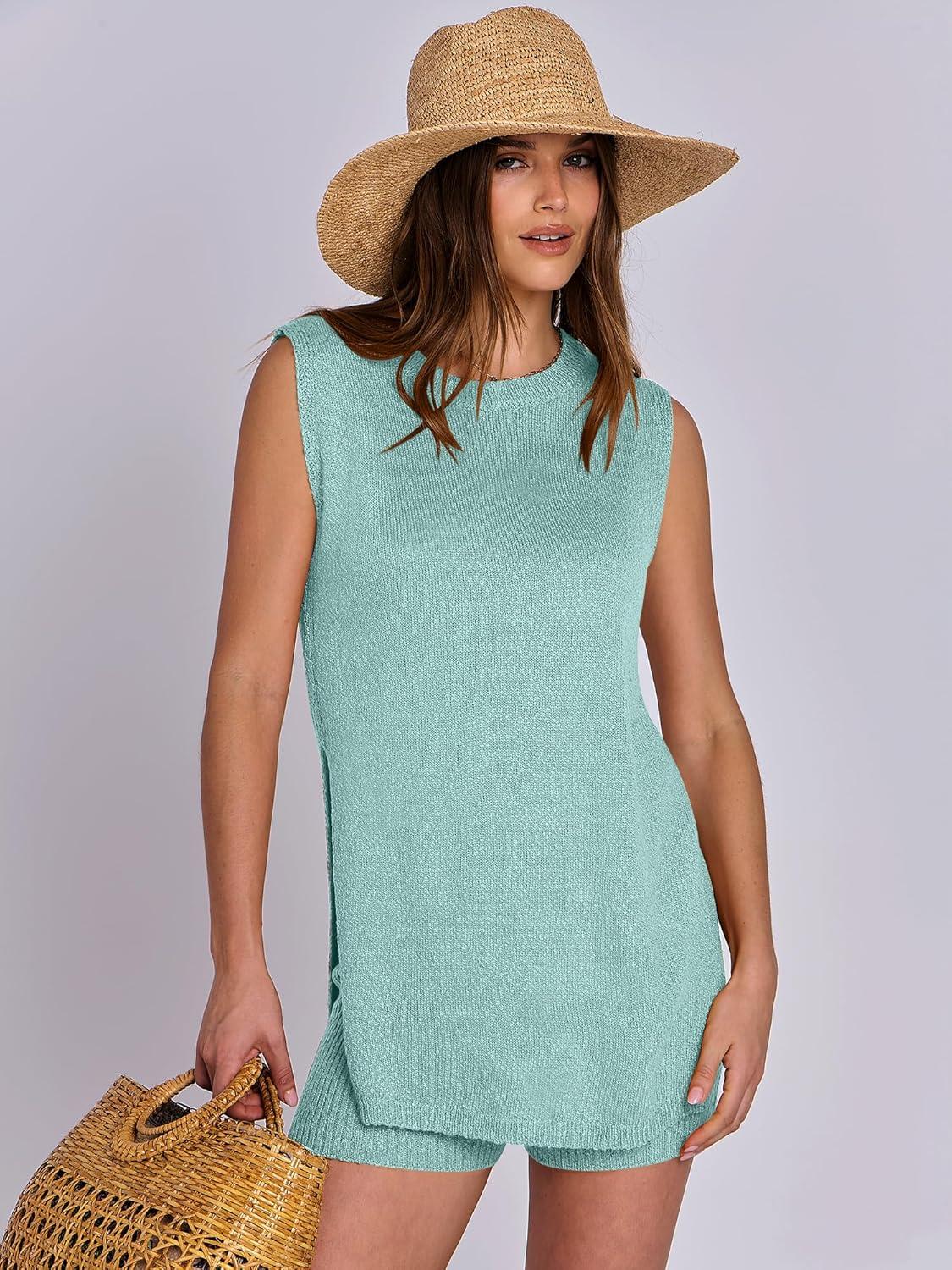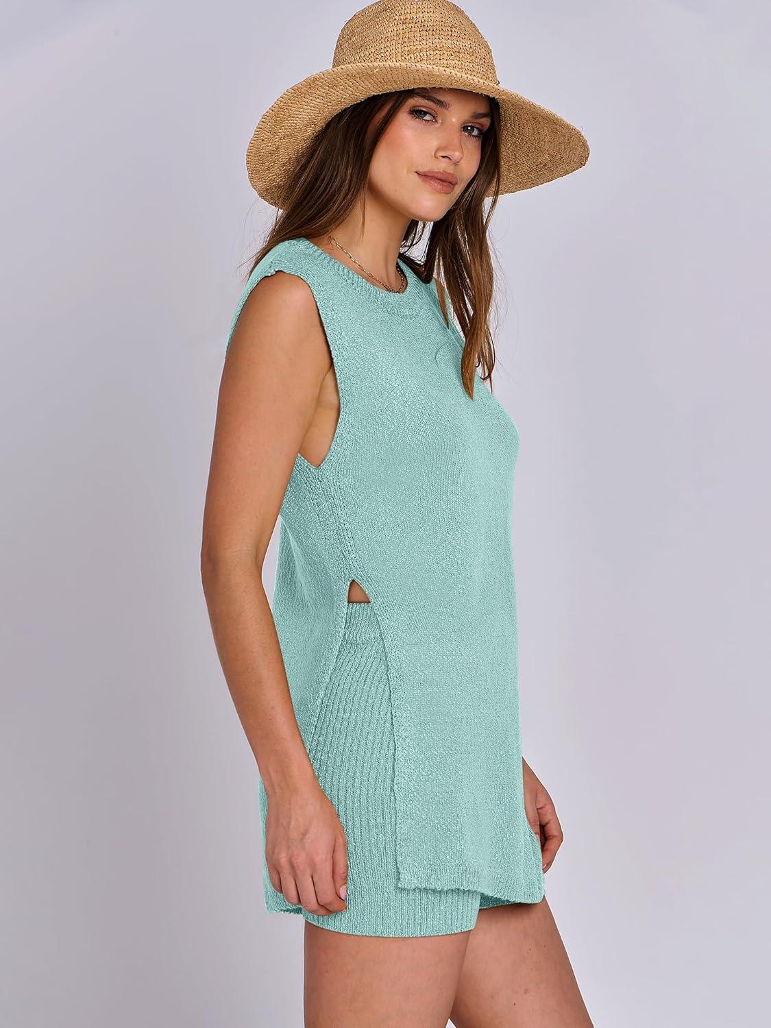 ANRABESS Women Summer 2 Piece Outfits Sleeveless Knit Sweater Top & Shorts Soft Lounge Sets Travel Beach 2025 Spring Clothes(Teal Blue)