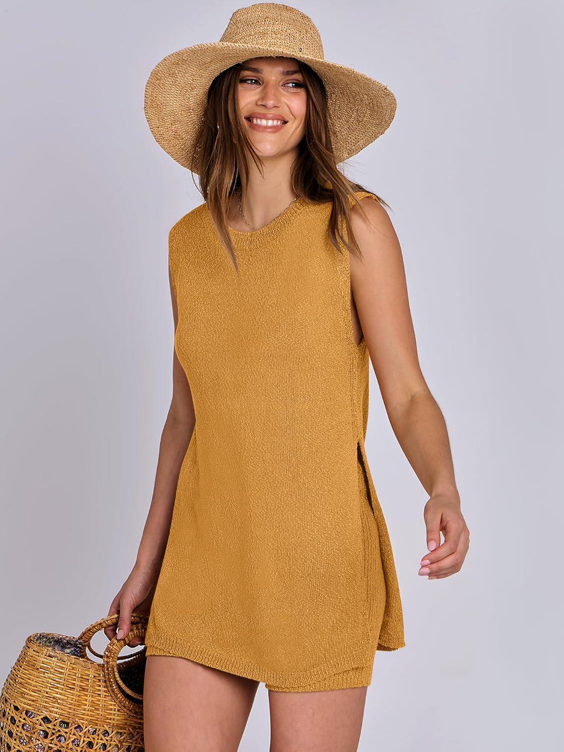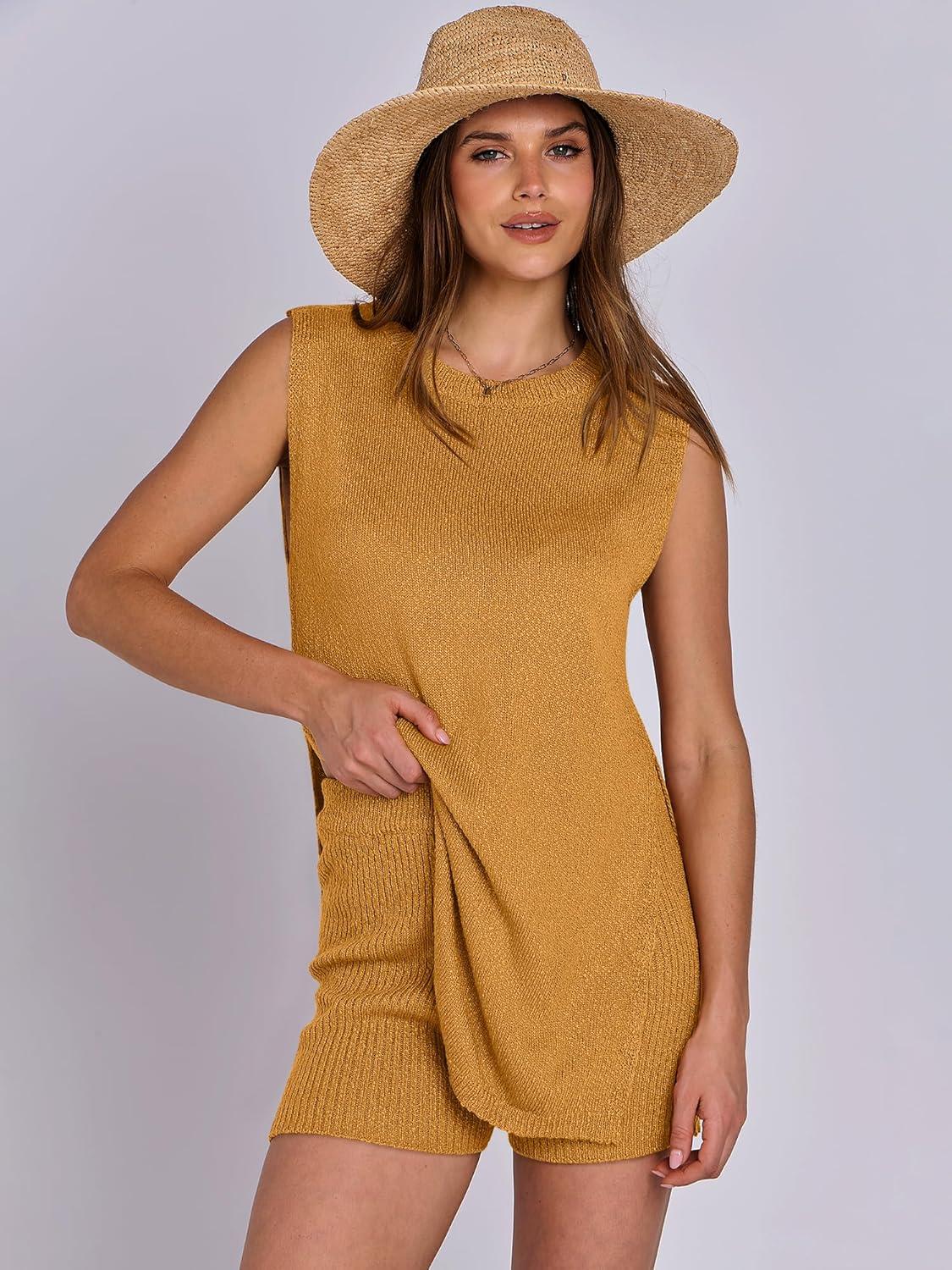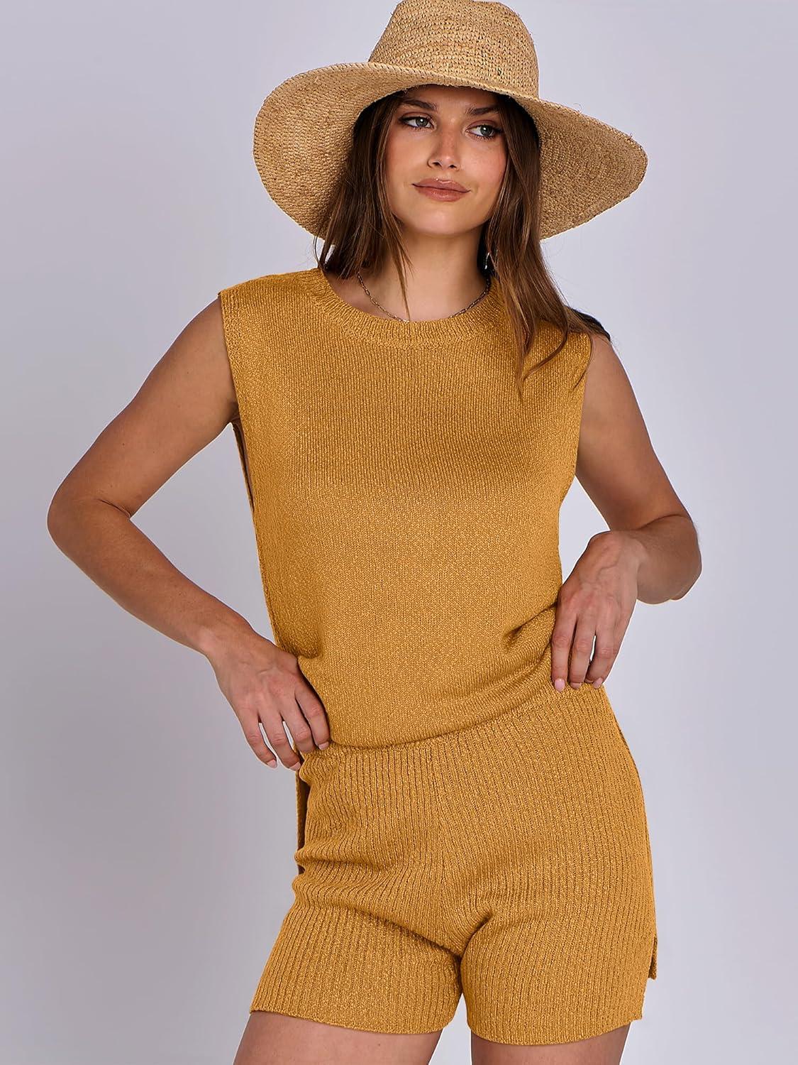 ANRABESS Women Summer 2 Piece Outfits Sleeveless Knit Sweater Top & Shorts Soft Lounge Sets Travel Beach 2025 Spring Clothes(Turmeric)