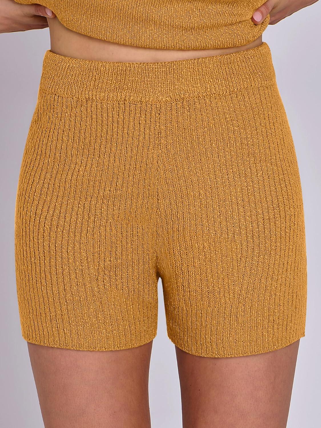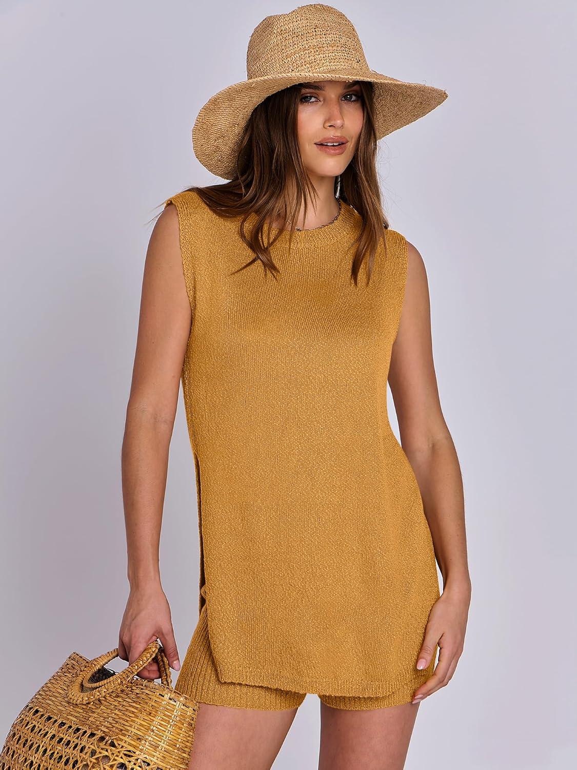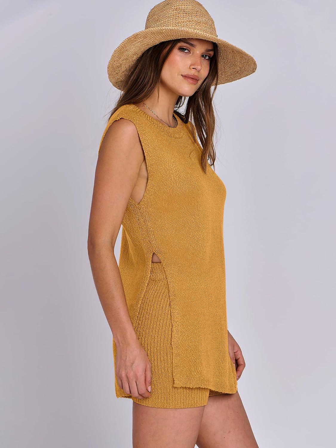 ANRABESS Women Summer 2 Piece Outfits Sleeveless Knit Sweater Top & Shorts Soft Lounge Sets Travel Beach 2025 Spring Clothes(Turmeric)