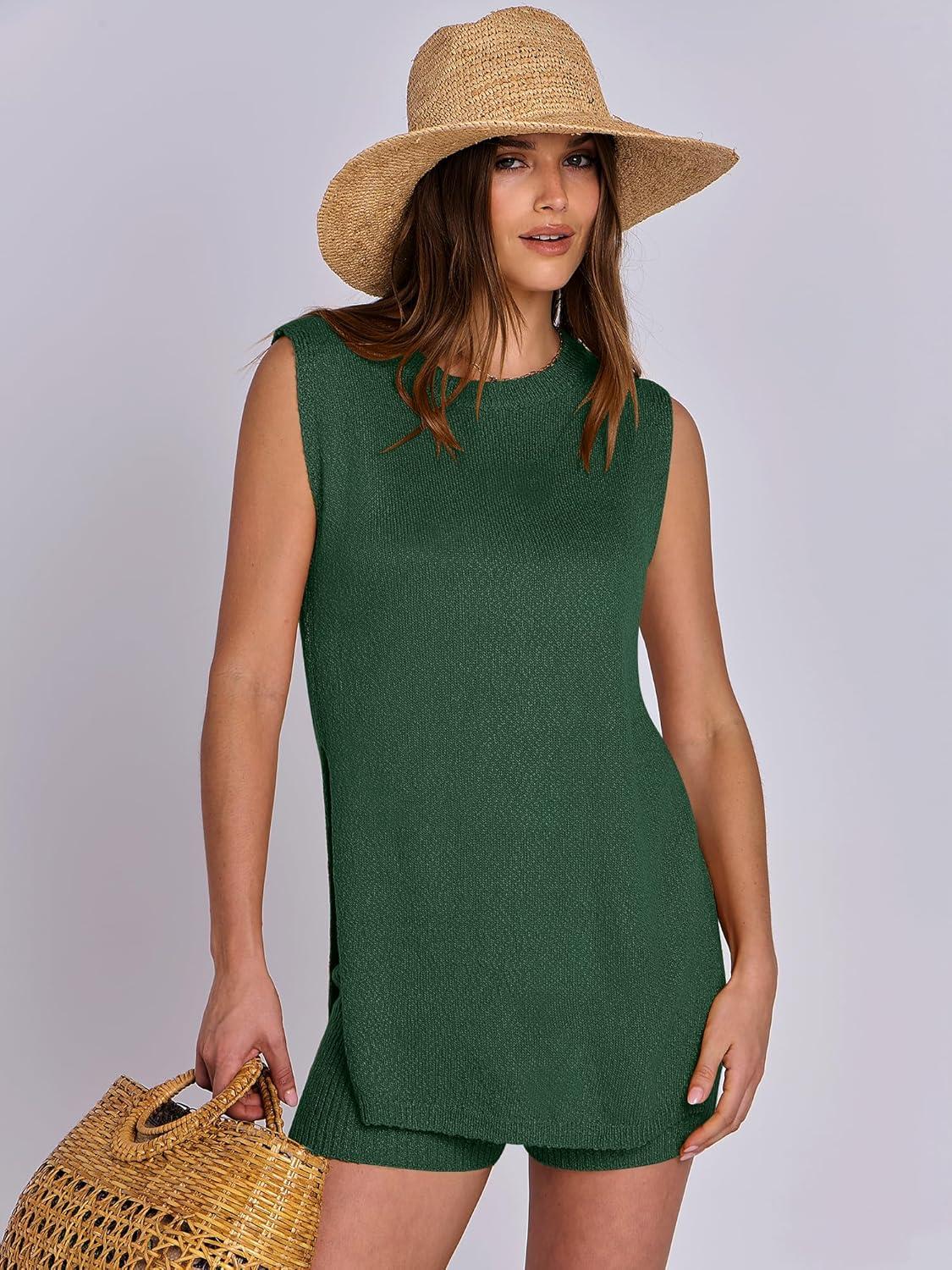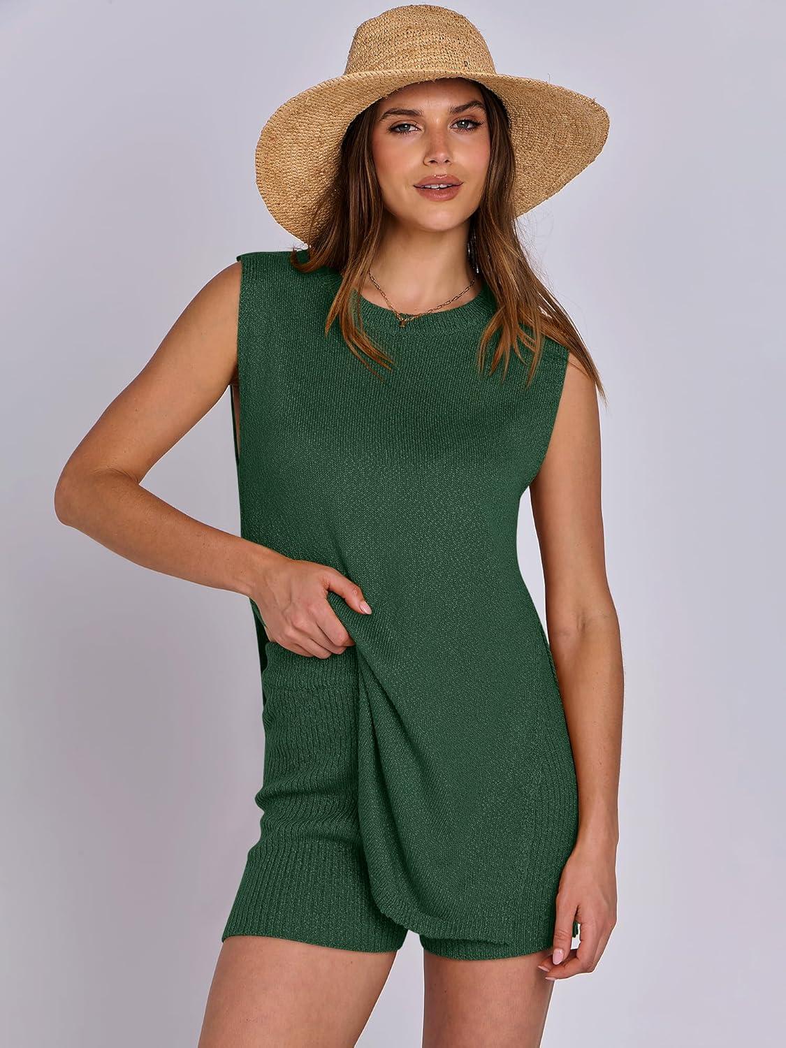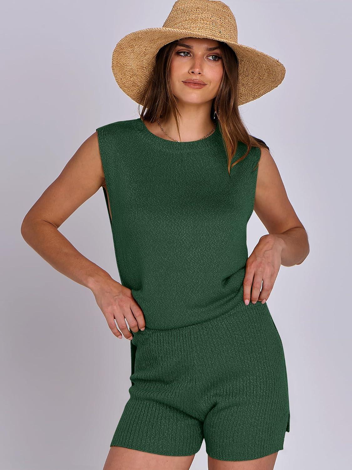 ANRABESS Women Summer 2 Piece Outfits Sleeveless Knit Sweater Top & Shorts Soft Lounge Sets Travel Beach 2026 Spring Clothes(Forest)