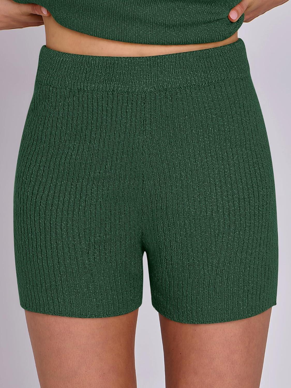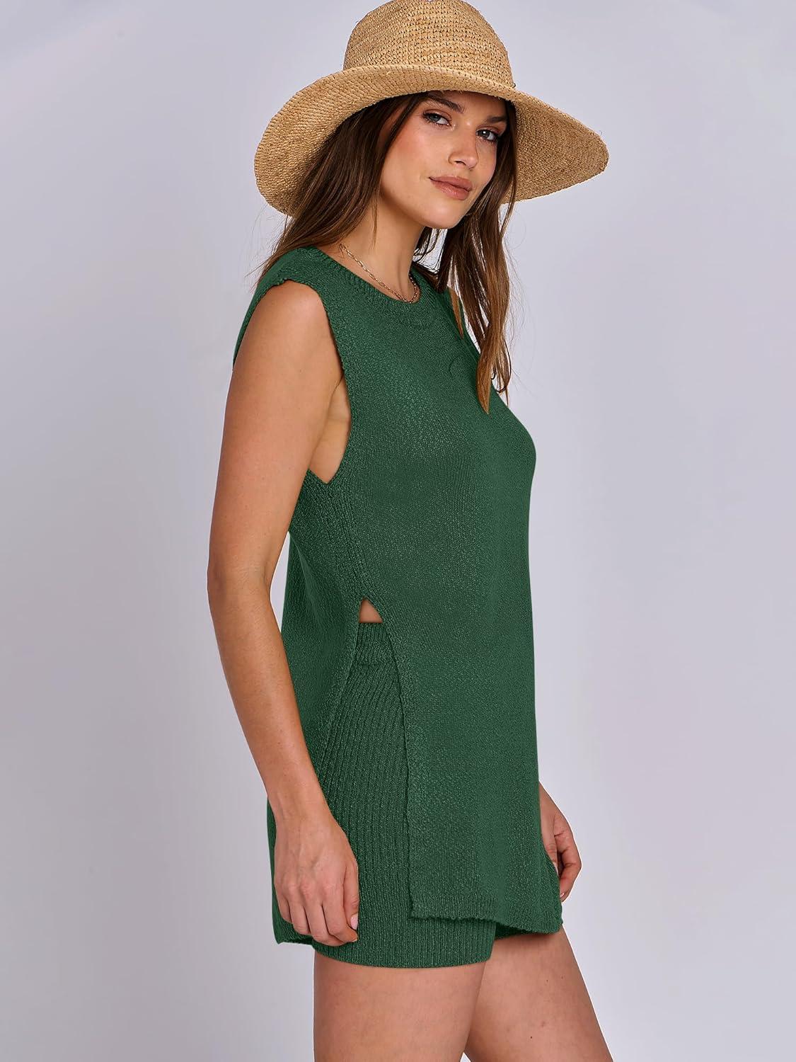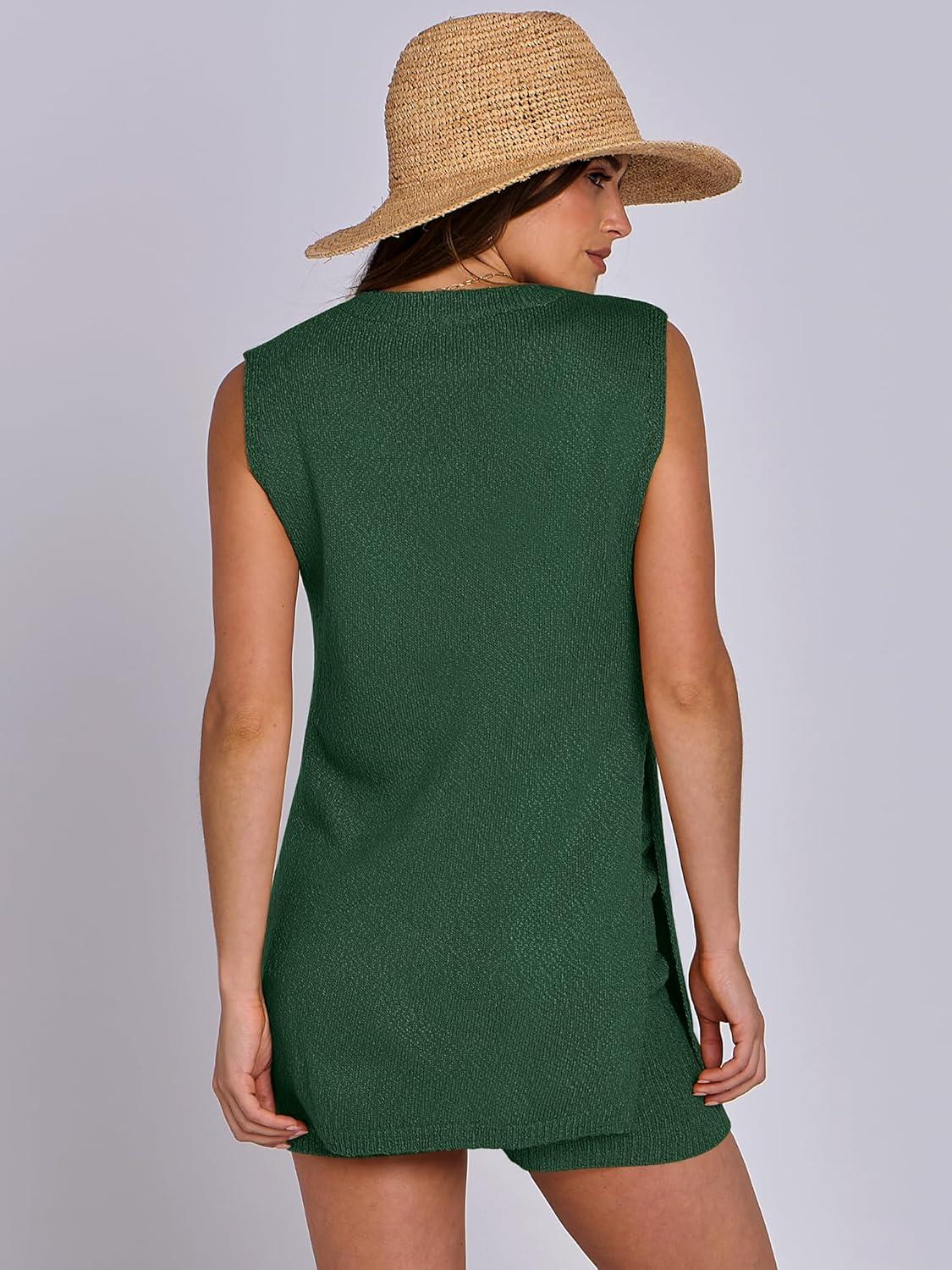 ANRABESS Women Summer 2 Piece Outfits Sleeveless Knit Sweater Top & Shorts Soft Lounge Sets Travel Beach 2026 Spring Clothes(Forest)