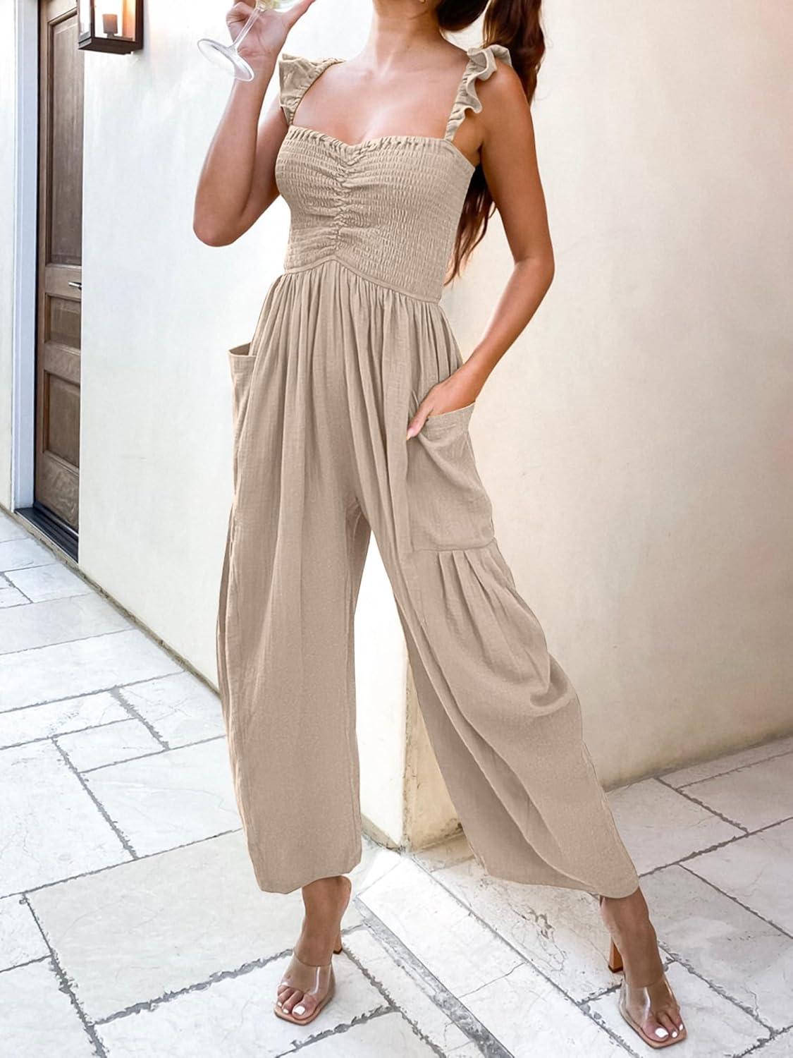 ANRABESS Women Summer Casual Dressy Sleeveless Smocked Wide Leg Linen Jumpsuits Rompers 2025 Trendy Travel Outfit Pocket(Apricot)