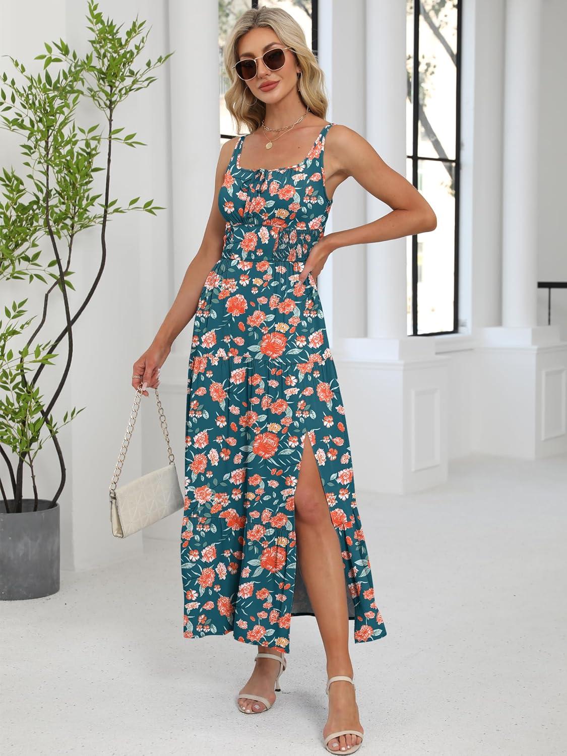 imageANRABESS Women Summer Casual Floral Printed Square Neck Sleeveless Straps Elastic Waist Slit Beach Vacation Maxi DressFloral Teal