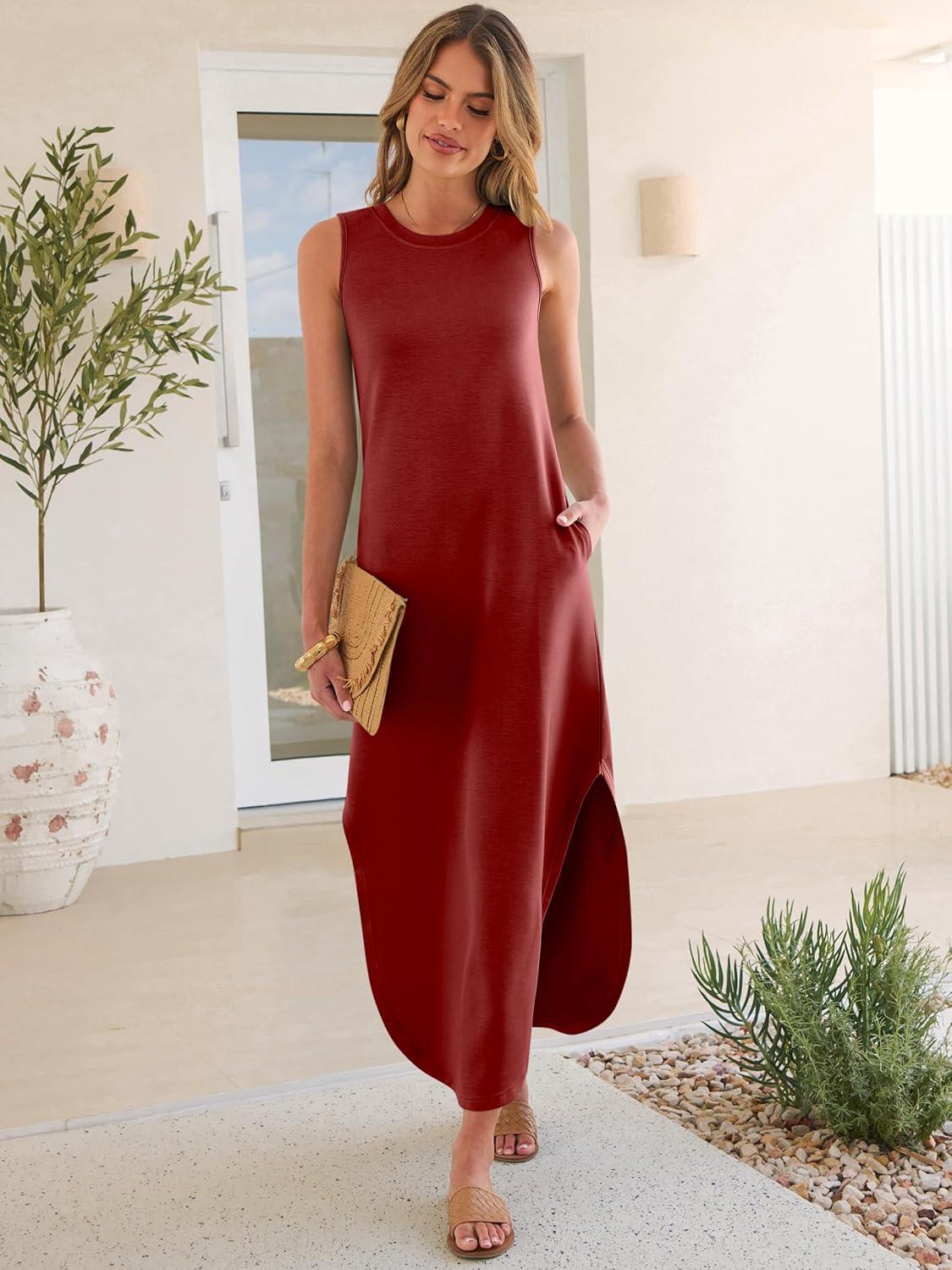 ANRABESS Women Summer Casual Maxi Sundress Sleeveless Loose Split 2026 Trendy Tank Shirt Long Dress Beach Vacation Clothes(Dark Red)