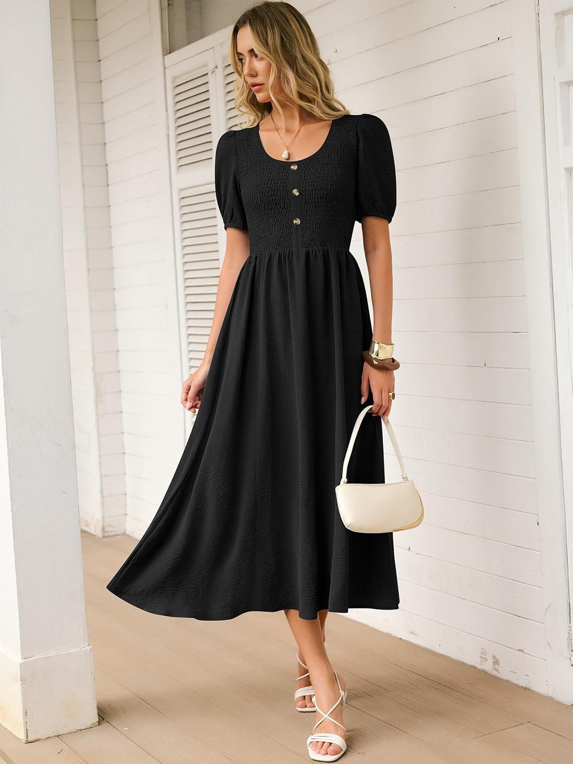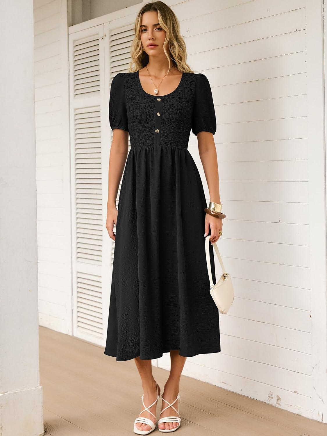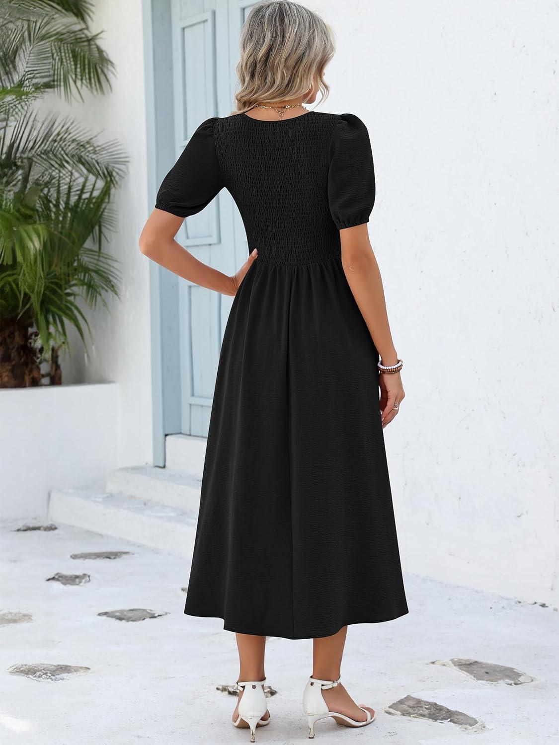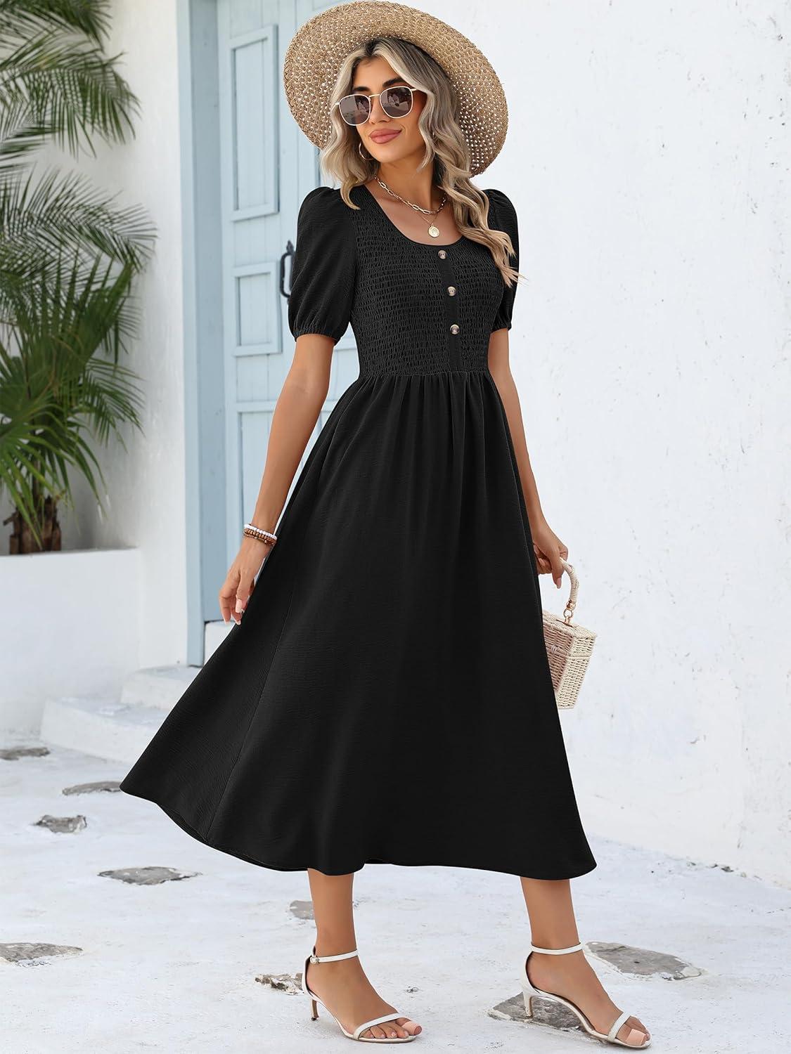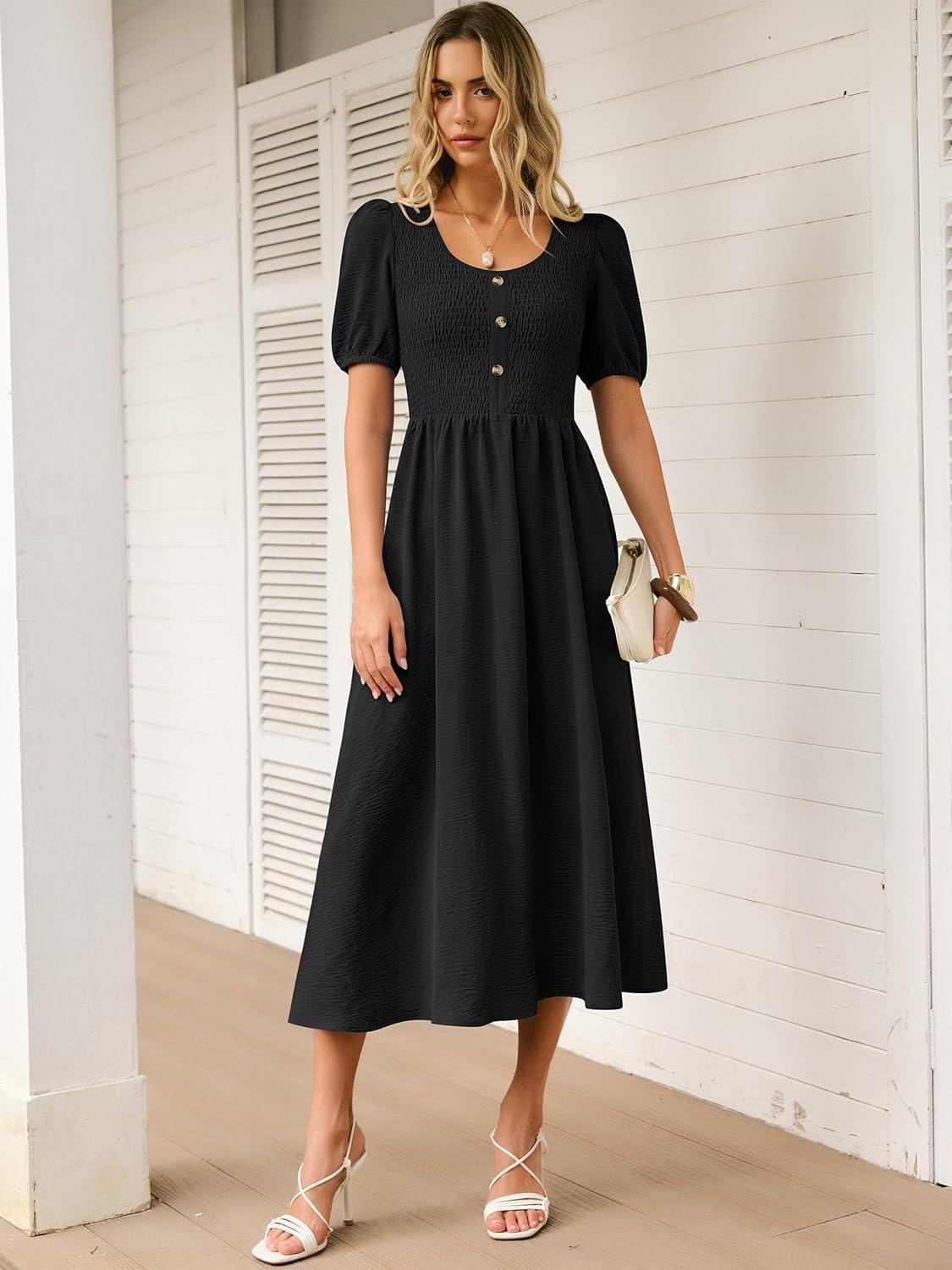 ANRABESS Women Summer Casual Puff Short Sleeve Square Neck Smocked Button Up High Waist Flowy Vacation Midi Dresses & Pockets(Black)