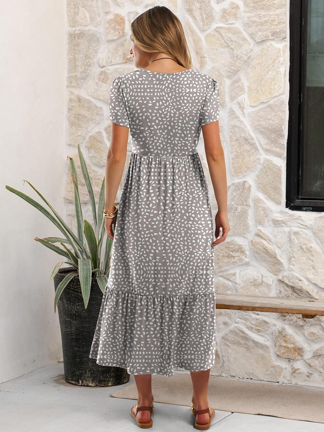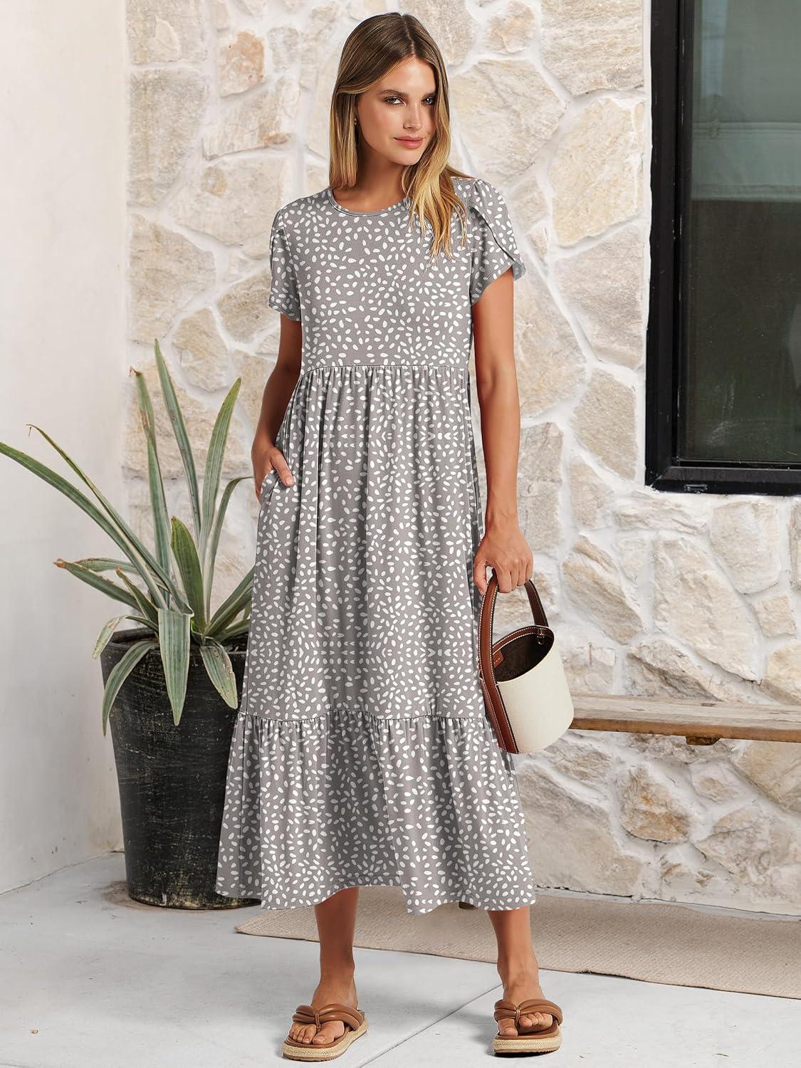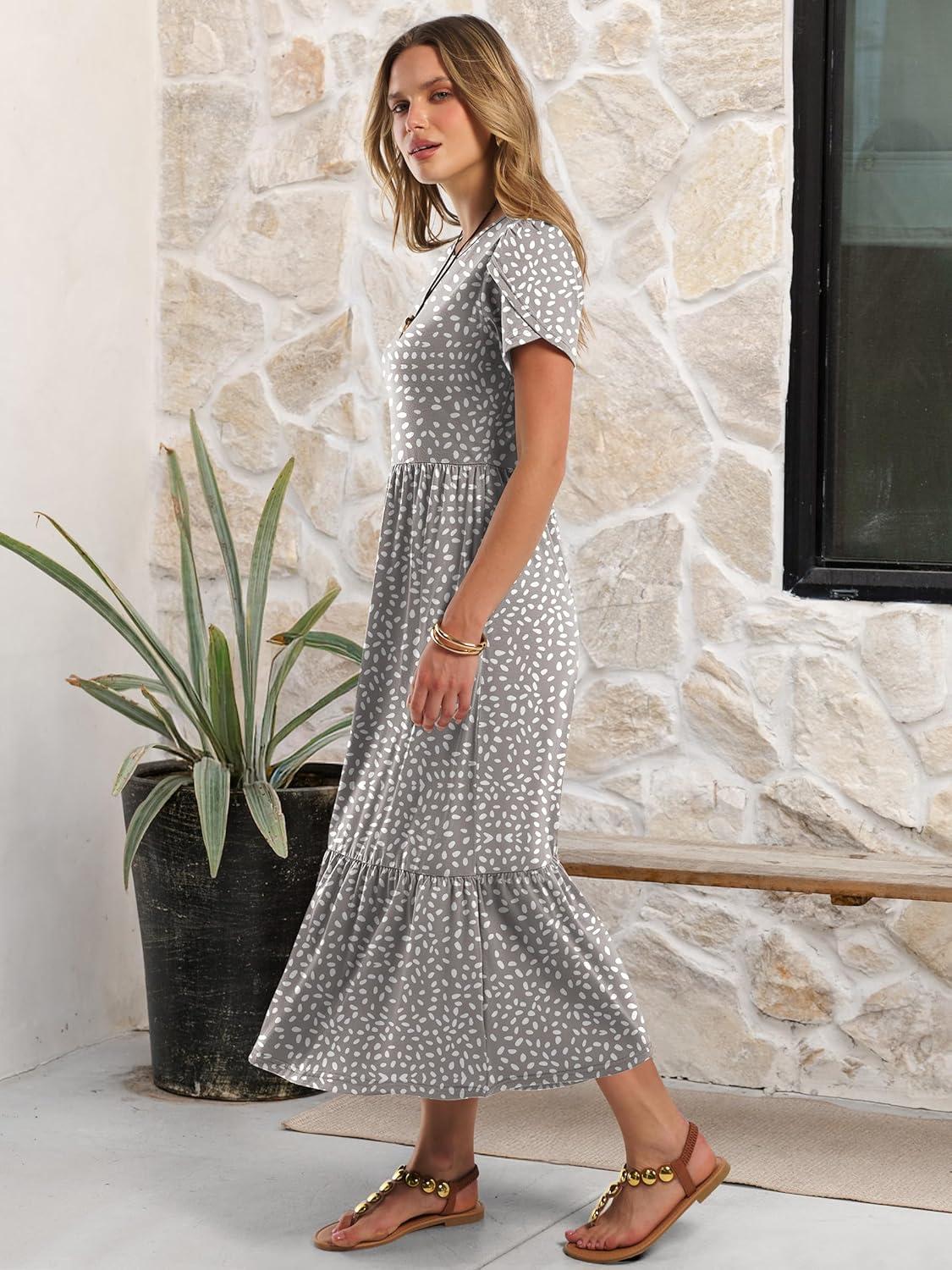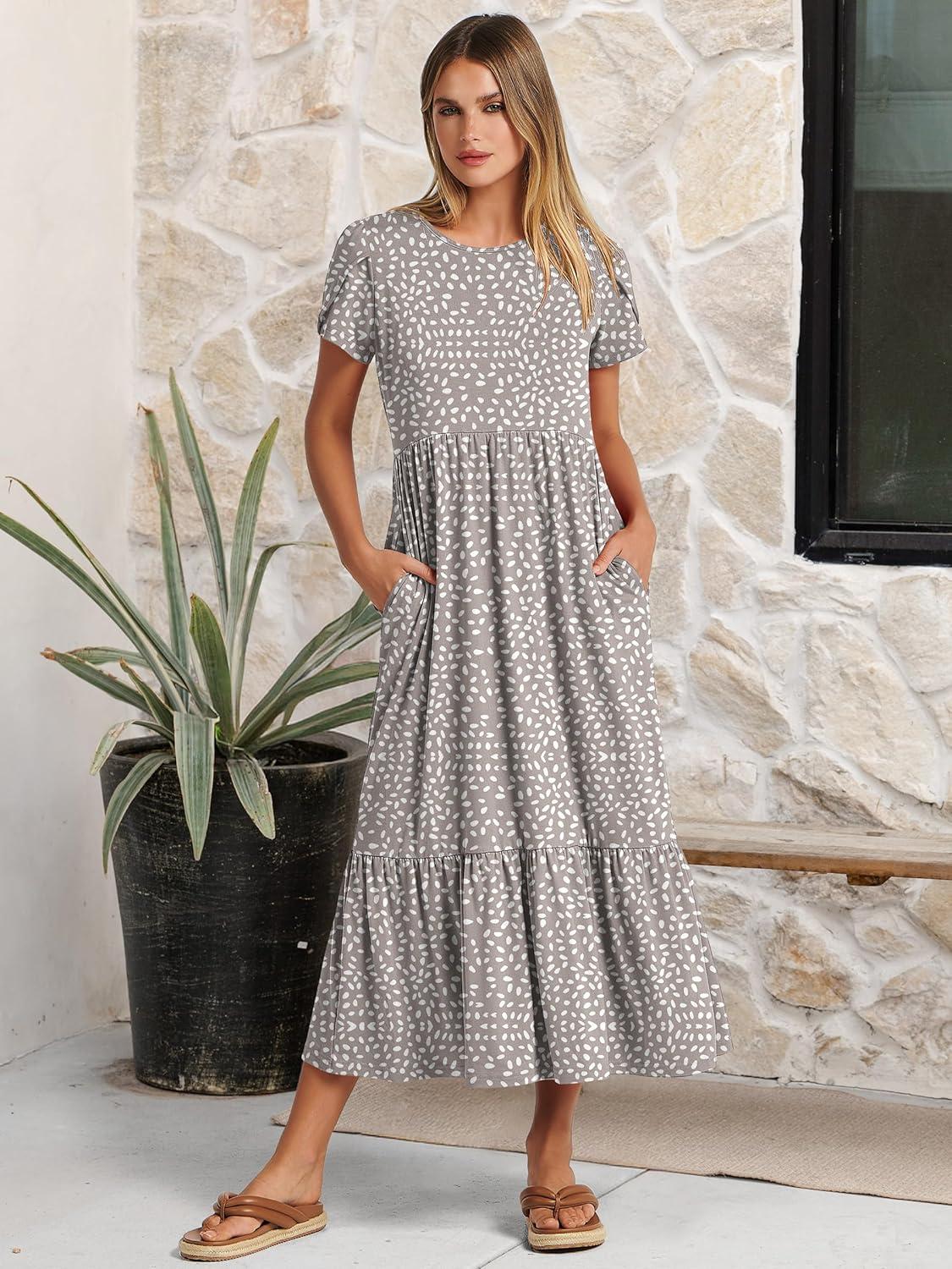 ANRABESS Women Summer Casual Short Sleeve Maxi Dresses A Line Flowy T Shirt Dress 2026 Beach Vacation Sundress with Pockets(Khaki Polka Dot Gray)