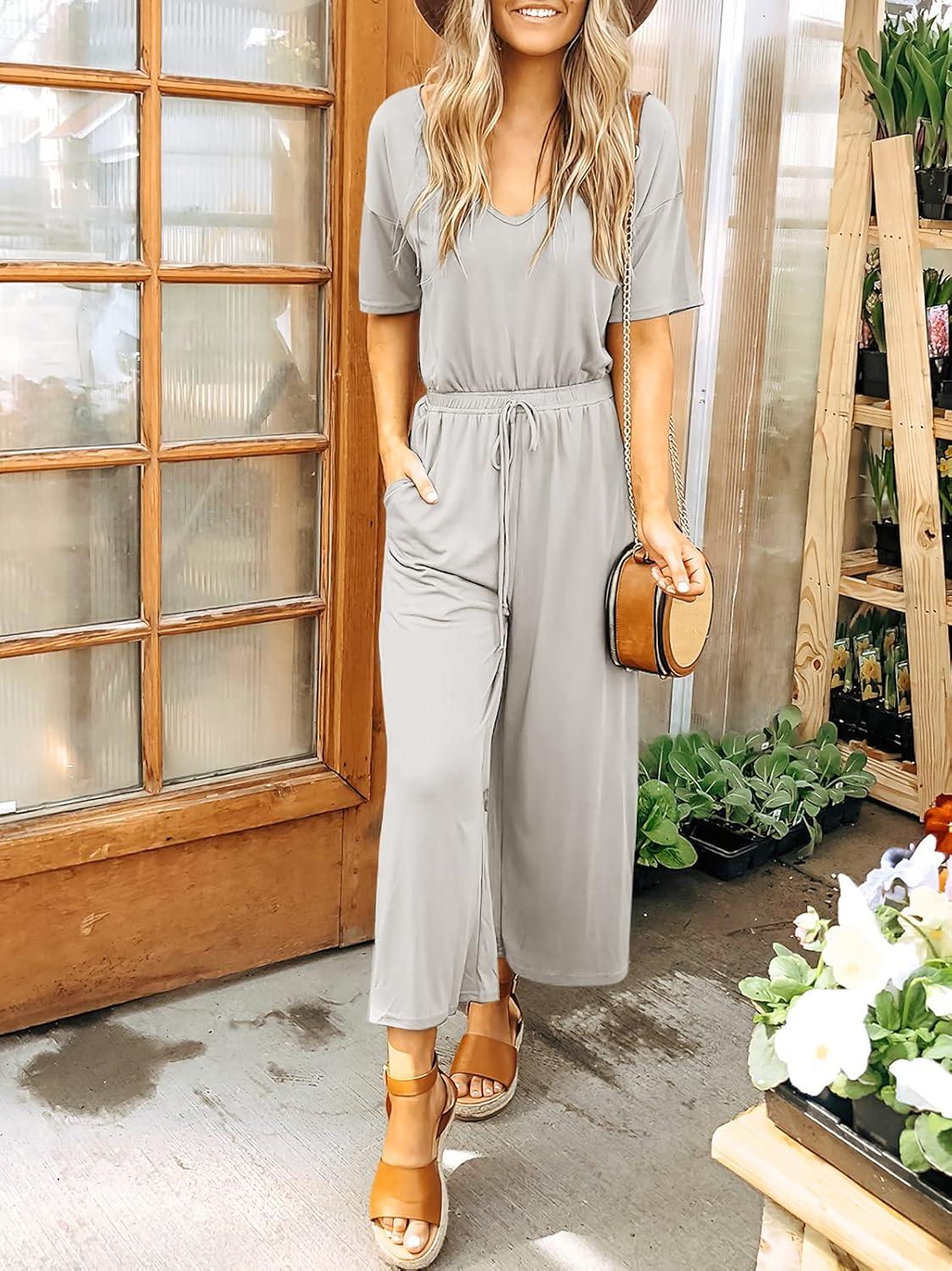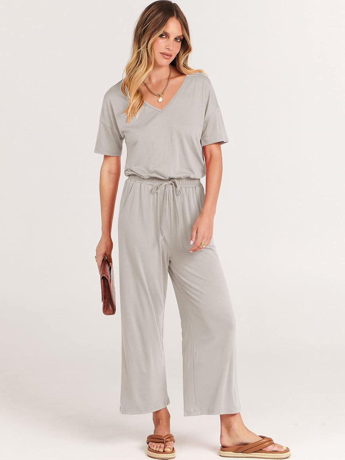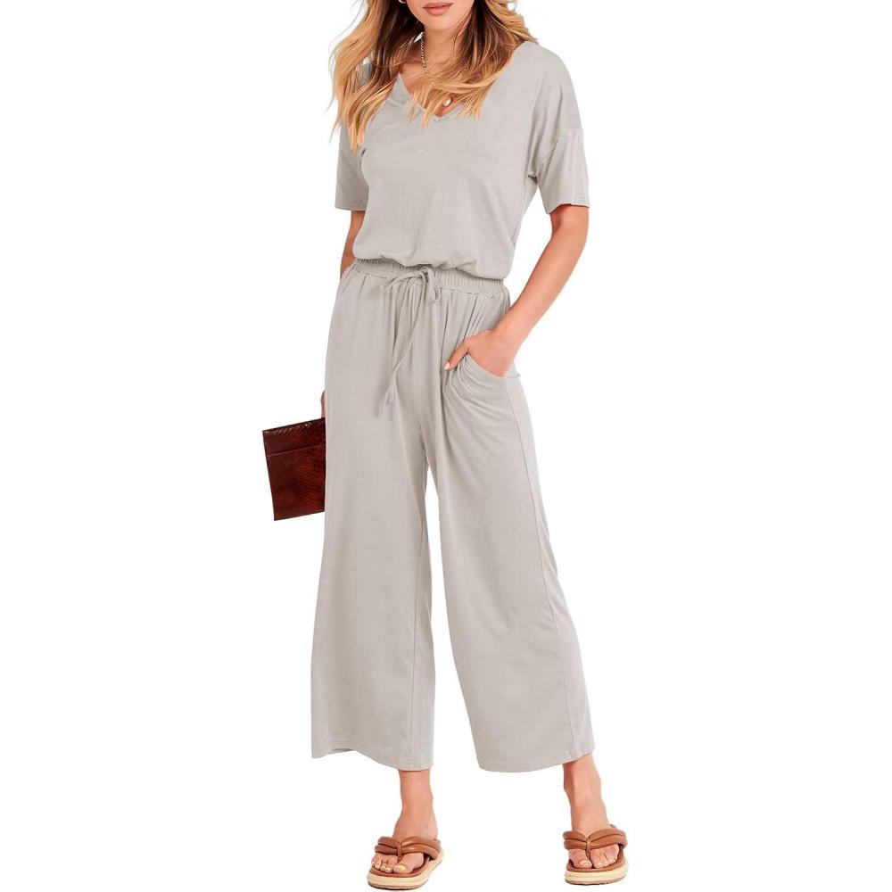imageANRABESS Women Summer Casual Short Sleeve V Neck Elastic Waist Wide Leg Cropped Pants Jumpsuits Rompers with Pockets02light Gray