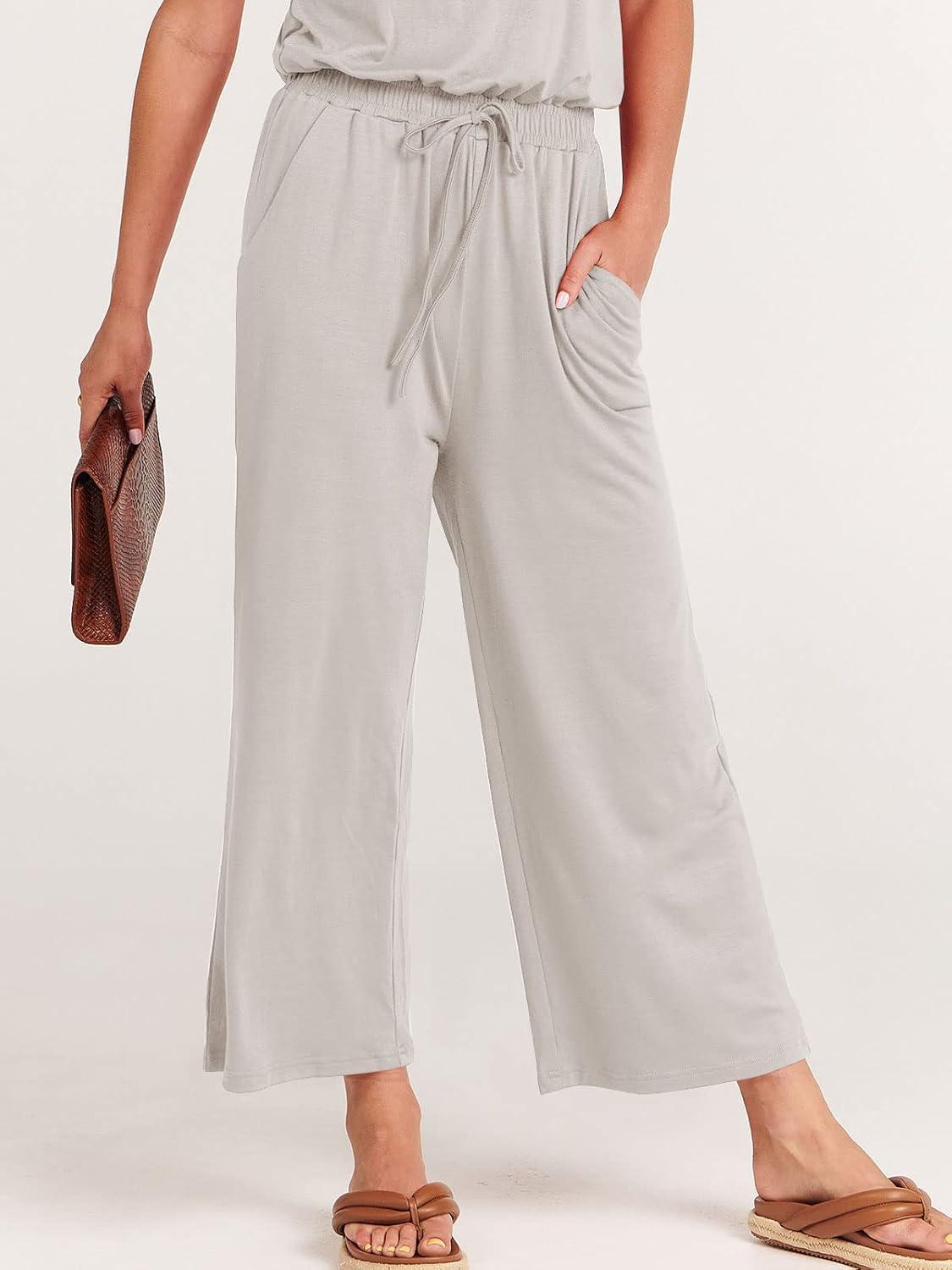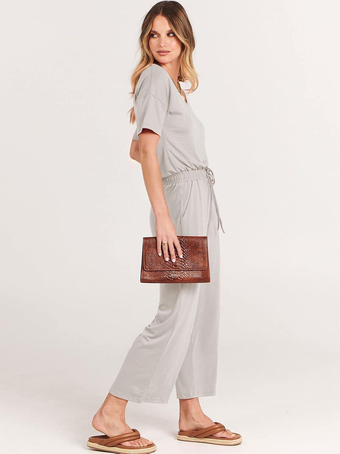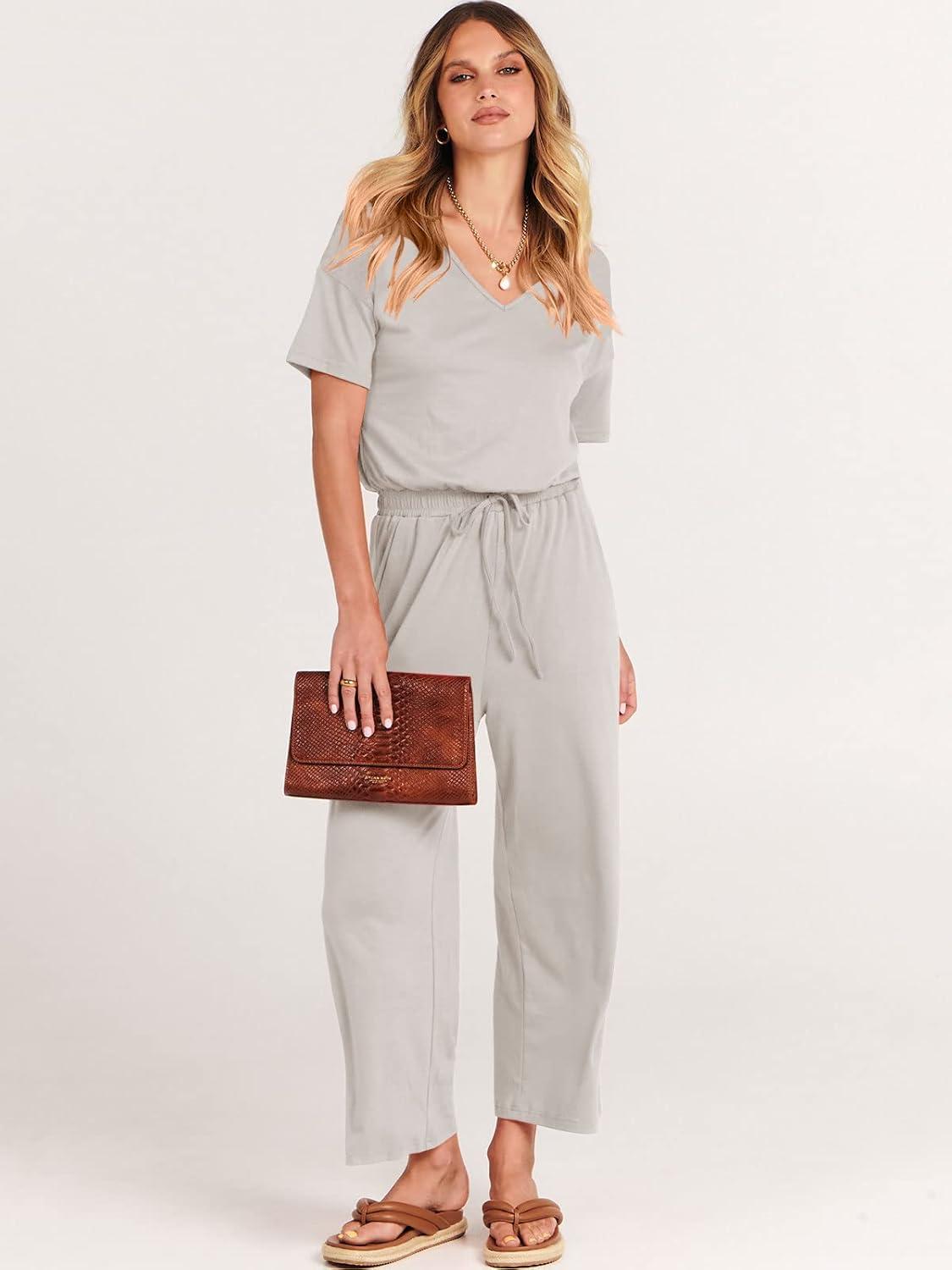 imageANRABESS Women Summer Casual Short Sleeve V Neck Elastic Waist Wide Leg Cropped Pants Jumpsuits Rompers with Pockets02light Gray