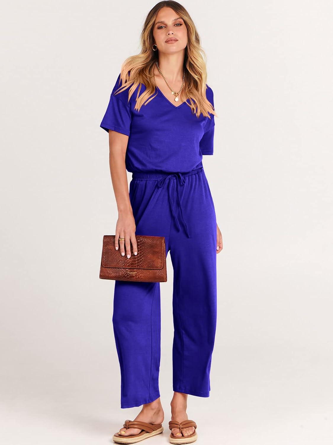 imageANRABESS Women Summer Casual Short Sleeve V Neck Elastic Waist Wide Leg Cropped Pants Jumpsuits Rompers with Pockets02royal Blue